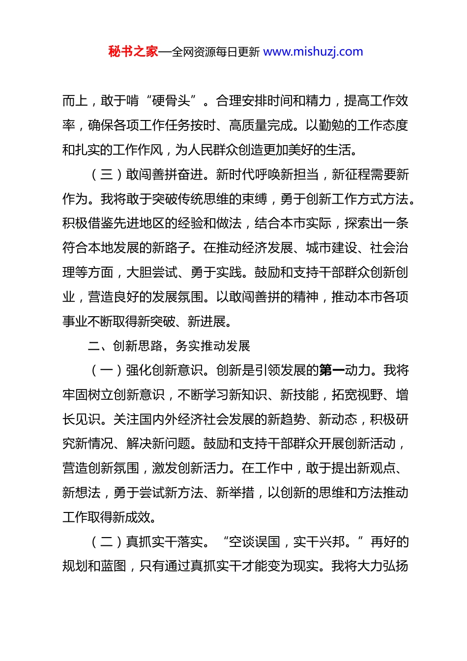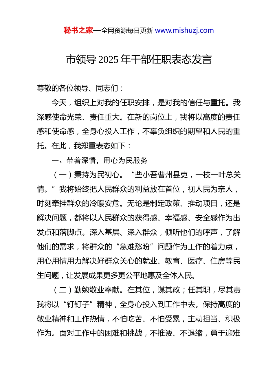 秘书之家—全网资源每日更新 www.mishuzj.com市领导 2025 年干部任职表态发言 尊敬的各位领导、同志们:今天,组织上对我的任职安排,是对我的信任与重托。我深感使命光荣、责任重大。在新的岗位上,我将以高度的责任感和使命感,全身心投入工作,不辜负组织的期望和人民的重托。在此,我郑重表态如下:一、带着深情,用心为民服务(一)秉持为民初心。“些小吾曹州县吏,一枝一叶总关情。”我将始终把人民群众的利益放在首位,视人民为亲人,时刻牵挂群众的冷暖安危。无论是制定政策、推动项目,还是解决问题,都将以人民群众的获得感、幸福感、安全感作为出发点和落脚点。深入基层、深入群众,倾听他们的呼声,了解他们的需求,将群众的“急难愁盼”问题作为工作的着力点,用心用情用力解决好群众关心的就业、教育、医疗、住房等民生问题,让发展成果更多更公平地惠及全体人民。(二)勤勉敬业奉献。在其位,谋其政;任其职,尽其责我将以“钉钉子”精神,全身心投入到工作中去。保持高度的敬业精神和工作热情,不怕吃苦、不怕受累,主动担当、积极作为。面对工作中的困难和挑战,不推诿、不退缩,勇于迎难秘书之家—全网资源每日更新 www.mishuzj.com而上,敢于啃“硬骨头”。合理安排时间和精力,提高工作效率,确保各项工作任务按时、高质量完成。以勤勉的工作态度和扎实的工作作风,为人民群众创造更加美好的生活。(三)敢闯善拼奋进。新时代呼唤新担当,新征程需要新作为。我将敢于突破传统思维的束缚,勇于创新工作方式方法。积极借鉴先进地区的经验和做法,结合本市实际,探索出一条符合本地发展的新路子。在推动经济发展、城市建设、社会治理等方面,大胆尝试、勇于实践。鼓励和支持干部群众创新创业,营造良好的发展氛围。以敢闯善拼的精神,推动本市各项事业不断取得新突破、新进展。二、创新思路,务实推动发展(一)强化创新意识。创新是引领发展的第一动力。我将牢固树立创新意识,不断学习新知识、新技能,拓宽视野、增长见识。关注国内外经济社会发展的新趋势、新动态,积极研究新情况、解决新问题。鼓励和支持干部群众开展创新活动,营造创新氛围,激发创新活力。在工作中,敢于提出新观点、新想法,勇于尝试新方法、新举措,以创新的思维和方法推动工作取得新成效。(二)真抓实干落实。“空谈误国,实干兴邦。”再好的规划和蓝图,只有通过真抓实干才能变为现实。我将大力弘扬秘书之家—全网资源每日更新 www.mishuzj.com求真务实的工作作风,不搞形式主义、不做表面文章。对确定的工作目标和任务,制定详细的工作计划和实施方案,明确责任分工和时间节点,确保各项工作任务落到实处。加强对工作的督促检查,及时掌握工作进展情况,发现问题及时解决。以钉钉子的精神,一锤接着一锤敲,一项接着一项抓,确保各项工作取得实效。(三)守正创新发展。在创新的同时,我将坚持守正原则坚守党的领导、坚守社会主义道路、坚守人民立场,确保创新发展的正确方向。在继承和发扬优良传统的基础上,结合时代发展的要求,进行创新和改进。注重把握工作的规律性和科学性,在创新中求发展,在发展中促创新。以守正创新的精神,推动本市经济社会持续健康发展。三、清正廉洁,坚守纪律底线(一)加强廉洁自律。“廉者,政之本也。”我将严格遵守廉洁自律的各项规定,自觉抵制各种腐朽思想的侵蚀。时刻保持清醒的头脑,做到自重、自省、自警、自励。严格要求自己,不接受礼品礼金、不谋取私利、不滥用职权。加强对家属和身边工作人员的教育管理,防止他们利用自己的职务影响谋取不正当利益。以廉洁自律的实际行动,树立良好的形象。(二)严格遵守纪律。纪律是党的生命线。我将严格遵守秘书之家—全网资源每日更新 www.mishuzj.com党的政治纪律、组织纪律、廉洁纪律、群众纪律、工作纪律和生活纪律。自觉维护党中央的权威和集中统一领导,坚决贯彻执行党的路线方针政策和上级的决策部署。严格执行民主集中制原则,坚持集体领导和个人分工负责相结合。严格遵守工作程序和工作制度,做到依法办事、依规办事。以严格的纪律要求自己,确保工作的规范性和严肃性。(三)接受...