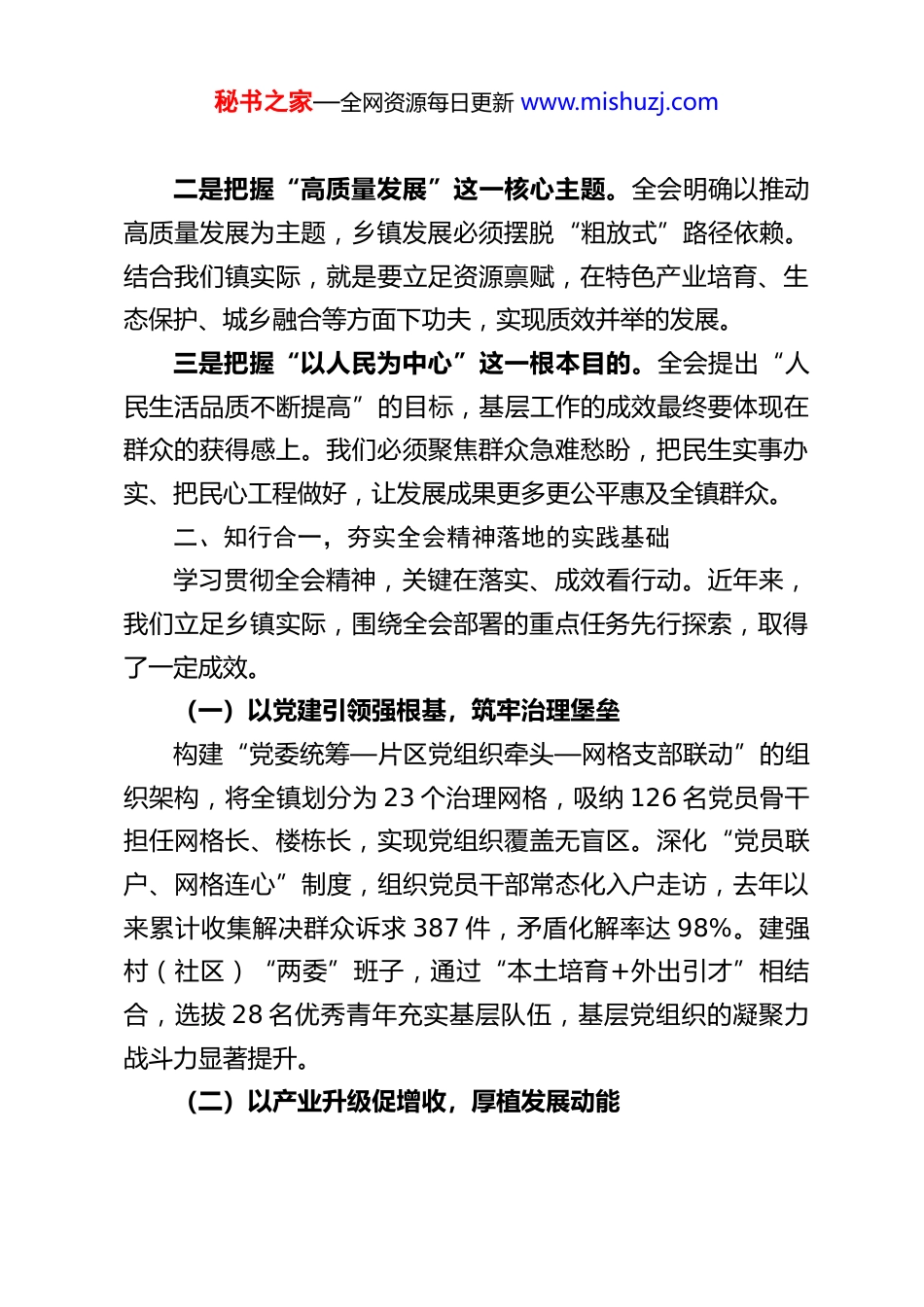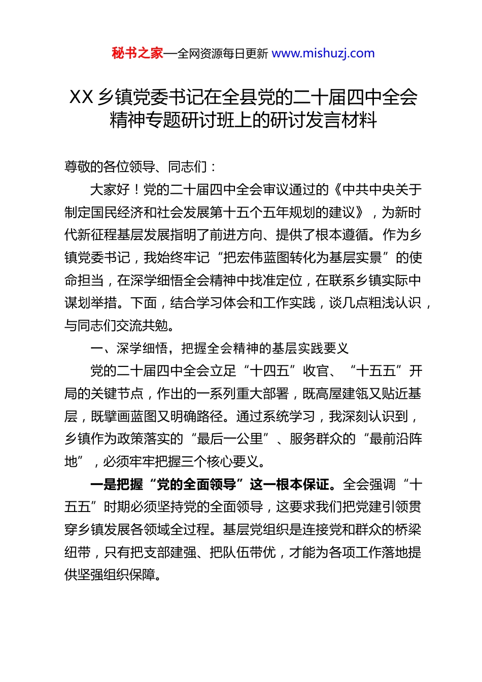 秘书之家—全网资源每日更新 www.mishuzj.comXX 乡镇党委书记在全县党的二十届四中全会精神专题研讨班上的研讨发言材料尊敬的各位领导、同志们:大家好!党的二十届四中全会审议通过的《中共中央关于制定国民经济和社会发展第十五个五年规划的建议》,为新时代新征程基层发展指明了前进方向、提供了根本遵循。作为乡镇党委书记,我始终牢记“把宏伟蓝图转化为基层实景”的使命担当,在深学细悟全会精神中找准定位,在联系乡镇实际中谋划举措。下面,结合学习体会和工作实践,谈几点粗浅认识,与同志们交流共勉。一、深学细悟,把握全会精神的基层实践要义党的二十届四中全会立足“十四五”收官、“十五五”开局的关键节点,作出的一系列重大部署,既高屋建瓴又贴近基层,既擘画蓝图又明确路径。通过系统学习,我深刻认识到,乡镇作为政策落实的“最后一公里”、服务群众的“最前沿阵地”,必须牢牢把握三个核心要义。一是把握“党的全面领导”这一根本保证。全会强调“十五五”时期必须坚持党的全面领导,这要求我们把党建引领贯穿乡镇发展各领域全过程。基层党组织是连接党和群众的桥梁纽带,只有把支部建强、把队伍带优,才能为各项工作落地提供坚强组织保障。秘书之家—全网资源每日更新 www.mishuzj.com二是把握“高质量发展”这一核心主题。全会明确以推动高质量发展为主题,乡镇发展必须摆脱“粗放式”路径依赖。结合我们镇实际,就是要立足资源禀赋,在特色产业培育、生态保护、城乡融合等方面下功夫,实现质效并举的发展。三是把握“以人民为中心”这一根本目的。全会提出“人民生活品质不断提高”的目标,基层工作的成效最终要体现在群众的获得感上。我们必须聚焦群众急难愁盼,把民生实事办实、把民心工程做好,让发展成果更多更公平惠及全镇群众。二、知行合一,夯实全会精神落地的实践基础学习贯彻全会精神,关键在落实、成效看行动。近年来,我们立足乡镇实际,围绕全会部署的重点任务先行探索,取得了一定成效。(一)以党建引领强根基,筑牢治理堡垒构建“党委统筹—片区党组织牵头—网格支部联动”的组织架构,将全镇划分为 23 个治理网格,吸纳 126 名党员骨干担任网格长、楼栋长,实现党组织覆盖无盲区。深化“党员联户、网格连心”制度,组织党员干部常态化入户走访,去年以来累计收集解决群众诉求 387 件,矛盾化解率达 98%。建强村(社区)“两委”班子,通过“本土培育+外出引才”相结合,选拔 28 名优秀青年充实基层队伍,基层党组织的凝聚力战斗力显著提升。(二)以产业升级促增收,厚植发展动能秘书之家—全网资源每日更新 www.mishuzj.com坚持把发展特色产业作为乡村振兴的重中之重,依托本地农业资源优势,培育壮大优质水稻、中药材种植、生态养殖三大特色产业,建成标准化种植基地 1.2 万亩、养殖小区 15 个。延伸产业链条,引进农产品加工企业 3 家,开发特色农产品 20余种,通过“线上电商+线下商超”双渠道销售,带动农户户均年增收 1.8 万元。探索“农业+文旅”融合发展模式,打造乡村休闲旅游示范点 4 个,去年接待游客 8 万余人次,实现旅游收入 3000 余万元。(三)以治理创新提效能,建设和美乡村坚持和发展新时代“枫桥经验”,建立“党员调解+群众评议+志愿服务”矛盾化解模式,实现“小事不出村、大事不出镇”。推进智慧治理建设,搭建集诉求上报、进度查询、便民服务于一体的移动端平台,实现群众诉求“1 小时响应、24小时反馈”。实施人居环境整治提升工程,完成 18 个自然村污水管网改造、23 公里道路硬化,打造和美乡村示范村 6 个,乡村面貌焕然一新。(四)以民生改善暖民心,增进群众福祉聚焦“一老一小”等重点群体,建成镇级养老服务中心 1所、村级养老服务站 12 个,为 286 名留守老人提供助餐、助医等服务。改善教育医疗条件,改扩建中心学校教学楼 2 栋,新增学位 300 个;升级镇卫生院诊疗设备,与县医院建立医联体,让群众在家门口就能享受优质医疗服务。健全防止返贫监秘书之家—全网资源每日更新 www.mishuzj.com测帮扶机制,对全镇 46 户监测户实行“一户一策”精准帮扶...