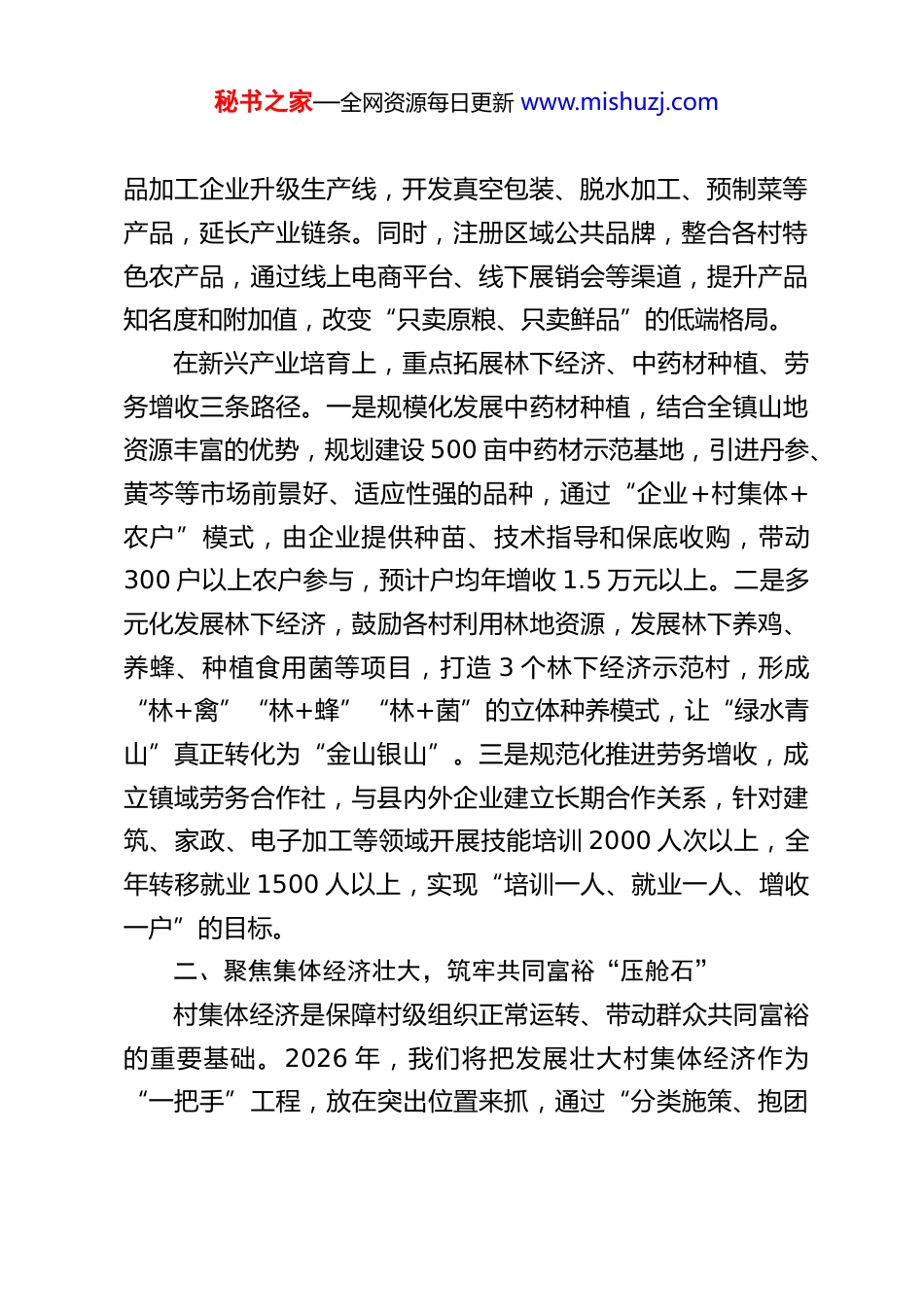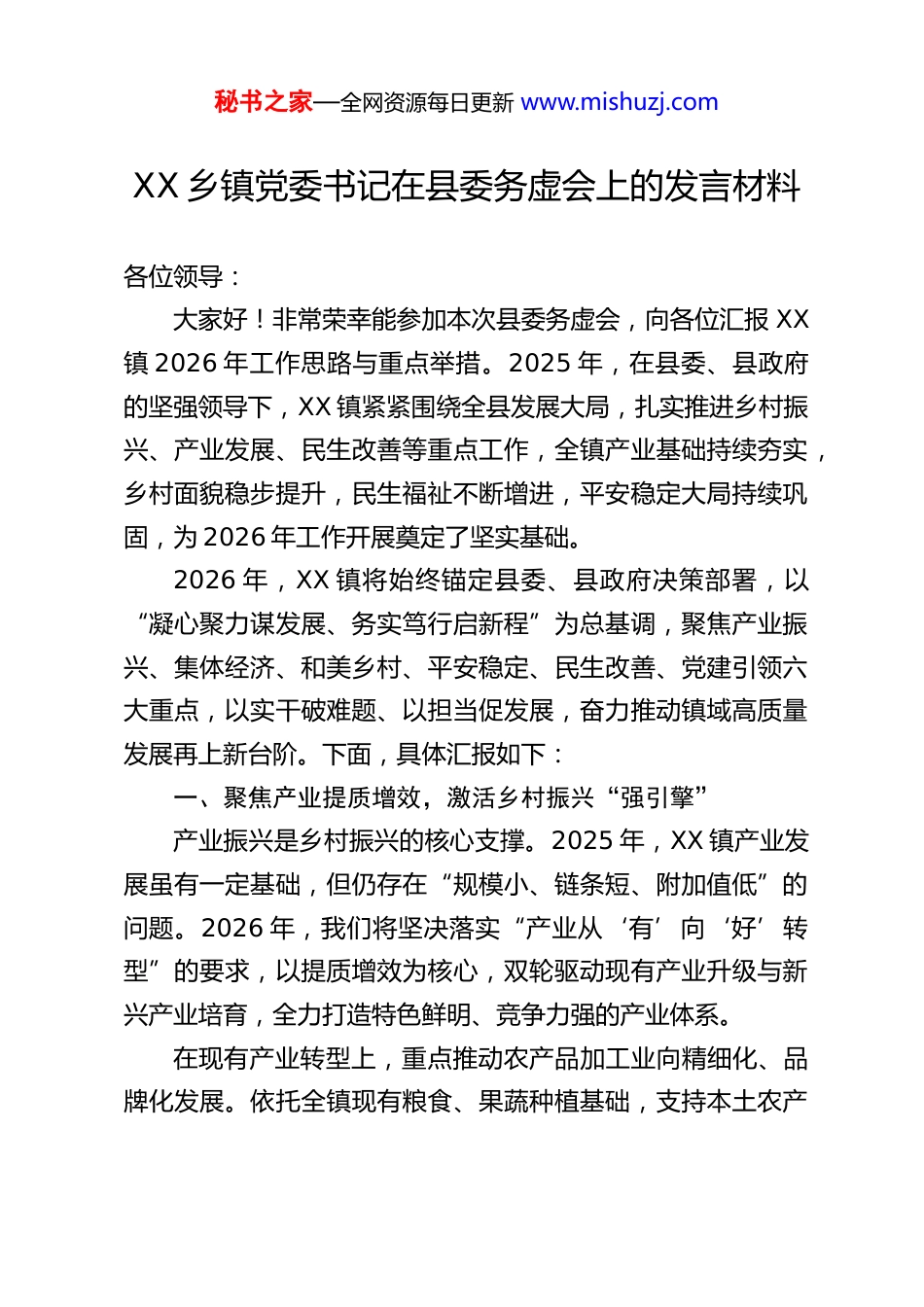 秘书之家—全网资源每日更新 www.mishuzj.comXX 乡镇党委书记在县委务虚会上的发言材料各位领导:大家好!非常荣幸能参加本次县委务虚会,向各位汇报 XX镇 2026 年工作思路与重点举措。2025 年,在县委、县政府的坚强领导下,XX 镇紧紧围绕全县发展大局,扎实推进乡村振兴、产业发展、民生改善等重点工作,全镇产业基础持续夯实,乡村面貌稳步提升,民生福祉不断增进,平安稳定大局持续巩固,为 2026 年工作开展奠定了坚实基础。2026 年,XX 镇将始终锚定县委、县政府决策部署,以“凝心聚力谋发展、务实笃行启新程”为总基调,聚焦产业振兴、集体经济、和美乡村、平安稳定、民生改善、党建引领六大重点,以实干破难题、以担当促发展,奋力推动镇域高质量发展再上新台阶。下面,具体汇报如下:一、聚焦产业提质增效,激活乡村振兴“强引擎”产业振兴是乡村振兴的核心支撑。2025 年,XX 镇产业发展虽有一定基础,但仍存在“规模小、链条短、附加值低”的问题。2026 年,我们将坚决落实“产业从‘有’向‘好’转型”的要求,以提质增效为核心,双轮驱动现有产业升级与新兴产业培育,全力打造特色鲜明、竞争力强的产业体系。在现有产业转型上,重点推动农产品加工业向精细化、品牌化发展。依托全镇现有粮食、果蔬种植基础,支持本土农产秘书之家—全网资源每日更新 www.mishuzj.com品加工企业升级生产线,开发真空包装、脱水加工、预制菜等产品,延长产业链条。同时,注册区域公共品牌,整合各村特色农产品,通过线上电商平台、线下展销会等渠道,提升产品知名度和附加值,改变“只卖原粮、只卖鲜品”的低端格局。在新兴产业培育上,重点拓展林下经济、中药材种植、劳务增收三条路径。一是规模化发展中药材种植,结合全镇山地资源丰富的优势,规划建设 500 亩中药材示范基地,引进丹参、黄芩等市场前景好、适应性强的品种,通过“企业+村集体+农户”模式,由企业提供种苗、技术指导和保底收购,带动300 户以上农户参与,预计户均年增收 1.5 万元以上。二是多元化发展林下经济,鼓励各村利用林地资源,发展林下养鸡、养蜂、种植食用菌等项目,打造 3 个林下经济示范村,形成“林+禽”“林+蜂”“林+菌”的立体种养模式,让“绿水青山”真正转化为“金山银山”。三是规范化推进劳务增收,成立镇域劳务合作社,与县内外企业建立长期合作关系,针对建筑、家政、电子加工等领域开展技能培训 2000 人次以上,全年转移就业 1500 人以上,实现“培训一人、就业一人、增收一户”的目标。二、聚焦集体经济壮大,筑牢共同富裕“压舱石”村集体经济是保障村级组织正常运转、带动群众共同富裕的重要基础。2026 年,我们将把发展壮大村集体经济作为“一把手”工程,放在突出位置来抓,通过“分类施策、抱团秘书之家—全网资源每日更新 www.mishuzj.com发展、规范管理”,推动村集体经济从“薄弱分散”向“强筋健骨”转变。一是分类施策定方向。根据各村资源禀赋、区位条件,将全镇 23 个村(社区)划分为“近郊服务型、山地种养型、资源禀赋型”三类,针对性制定发展方案。近郊村依托临近集镇、交通便利的优势,发展仓储物流、农家餐饮、果蔬采摘等服务业;山地村聚焦中药材、林下经济等特色种养,建设标准化生产基地;有古村落、闲置厂房等资源的村,通过盘活闲置资产、招商引资等方式,发展农产品初加工、乡村旅游配套项目。二是抱团发展破瓶颈。针对部分村资源有限、单打独斗难以见效的问题,打破村域界限,推动 3-5 个村联合组建集体经济发展联合体,共同投资建设农产品加工厂、劳务服务公司等规模化项目,实现资源共享、风险共担、利益共享。2026 年,重点推进镇域东部 5 村联合建设中药材初加工车间,西部 4 村联合发展林下养殖合作社,力争实现村村集体经济年收入达到10 万元以上,其中 5 个村突破 20 万元。三是规范管理保长效。建立村集体经济“台账式管理、阳光化运营”机制,规范资金使用、项目审批、收益分配等流程,定期开展集体经济审计,确保资金安全、项目落地。同时,明确集体经济收益优先用于村级公益事业、带动困难群众增收、补贴村级...
