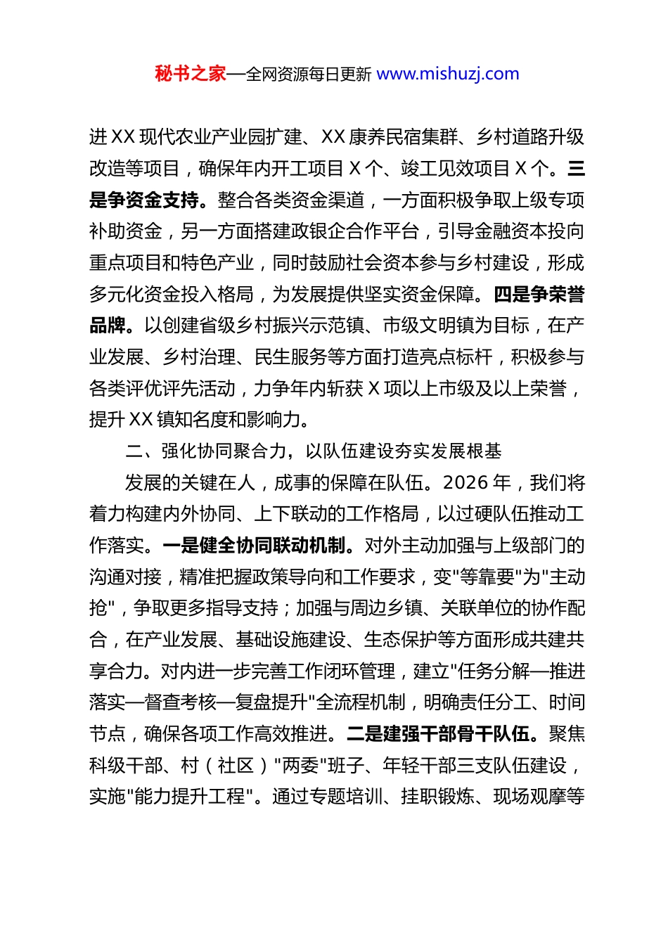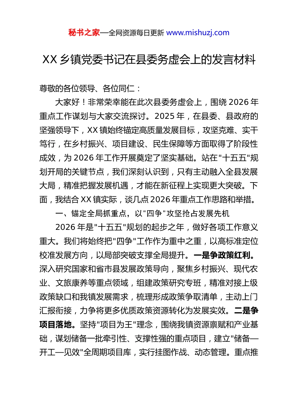 秘书之家—全网资源每日更新 www.mishuzj.comXX 乡镇党委书记在县委务虚会上的发言材料尊敬的各位领导、各位同仁:大家好!非常荣幸能在此次县委务虚会上,围绕 2026 年重点工作谋划与大家交流探讨。2025 年,在县委、县政府的坚强领导下,XX 镇始终锚定高质量发展目标,攻坚克难、实干笃行,在乡村振兴、项目建设、民生保障等方面取得了阶段性成效,为 2026 年工作开展奠定了坚实基础。站在"十五五"规划开局的关键节点,我们深刻认识到,只有主动融入全县发展大局,精准把握发展机遇,才能在新征程上实现更大突破。下面,我结合 XX 镇实际,谈几点 2026 年重点工作思路和举措。一、锚定全局抓重点,以"四争"攻坚抢占发展先机2026 年是"十五五"规划的起步之年,做好各项工作意义重大。我们将始终把"四争"工作作为重中之重,以高标准定位校准发展方向,以局部突破支撑全局提升。一是争政策红利。深入研究国家和省市县发展政策导向,聚焦乡村振兴、现代农业、文旅康养等重点领域,组建政策研究专班,精准对接上级政策缺口和我镇发展需求,梳理形成政策争取清单,主动上门汇报衔接,力争将更多优质政策资源转化为发展实效。二是争项目落地。坚持"项目为王"理念,围绕我镇资源禀赋和产业基础,谋划储备一批牵引性、支撑性强的重点项目,建立"储备—开工—见效"全周期项目库,实行挂图作战、动态管理。重点推秘书之家—全网资源每日更新 www.mishuzj.com进 XX 现代农业产业园扩建、XX 康养民宿集群、乡村道路升级改造等项目,确保年内开工项目 X 个、竣工见效项目 X 个。三是争资金支持。整合各类资金渠道,一方面积极争取上级专项补助资金,另一方面搭建政银企合作平台,引导金融资本投向重点项目和特色产业,同时鼓励社会资本参与乡村建设,形成多元化资金投入格局,为发展提供坚实资金保障。四是争荣誉品牌。以创建省级乡村振兴示范镇、市级文明镇为目标,在产业发展、乡村治理、民生服务等方面打造亮点标杆,积极参与各类评优评先活动,力争年内斩获 X 项以上市级及以上荣誉,提升 XX 镇知名度和影响力。二、强化协同聚合力,以队伍建设夯实发展根基发展的关键在人,成事的保障在队伍。2026 年,我们将着力构建内外协同、上下联动的工作格局,以过硬队伍推动工作落实。一是健全协同联动机制。对外主动加强与上级部门的沟通对接,精准把握政策导向和工作要求,变"等靠要"为"主动抢",争取更多指导支持;加强与周边乡镇、关联单位的协作配合,在产业发展、基础设施建设、生态保护等方面形成共建共享合力。对内进一步完善工作闭环管理,建立"任务分解—推进落实—督查考核—复盘提升"全流程机制,明确责任分工、时间节点,确保各项工作高效推进。二是建强干部骨干队伍。聚焦科级干部、村(社区)"两委"班子、年轻干部三支队伍建设,实施"能力提升工程"。通过专题培训、挂职锻炼、现场观摩等秘书之家—全网资源每日更新 www.mishuzj.com方式,提升干部专业能力和攻坚本领;建立健全干部考核激励机制,将工作实绩与评优评先、晋升提拔挂钩,树立"重实干、重实绩"的鲜明导向;注重年轻干部培养,搭建干事创业平台,让年轻干部在重点项目、难点工作中经风雨、长才干,打造一支敢担当、善作为的骨干力量。三是凝聚群众主体力量。始终坚持以人民为中心的发展思想,健全群众参与机制,通过村民议事会、民情恳谈会等形式,广泛听取群众意见建议,让群众成为乡村建设、产业发展的参与者、受益者和监督者。加强宣传引导,激发群众内生动力,形成干群同心、共建共享的良好氛围。三、聚焦项目强支撑,以产业升级激活发展动能项目是发展的"压舱石",产业是增收的"主引擎"。2026 年,我们将立足资源禀赋,以项目建设带动产业升级,推动经济高质量发展。一是做强现代农业。依托我镇农业资源优势,重点推进 XX 现代农业产业园提质增效,发展设施农业、智慧农业,引进优质品种和先进种植技术,打造规模化、标准化的特色农产品生产基地。培育壮大农产品加工企业,延长产业链条,提升产品附加值,重点发展粮食加工、果蔬保鲜、畜禽产品深加工等产业,打造"XX 农产品"区域公...