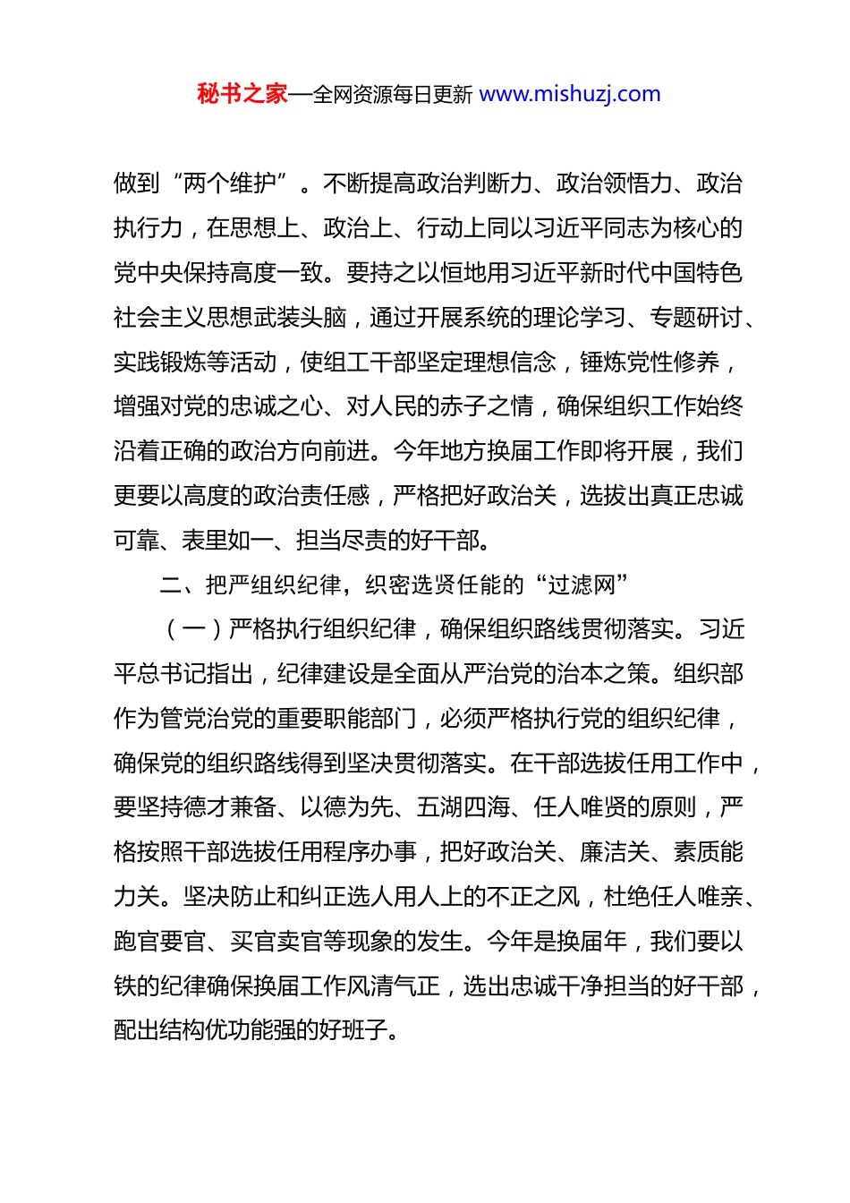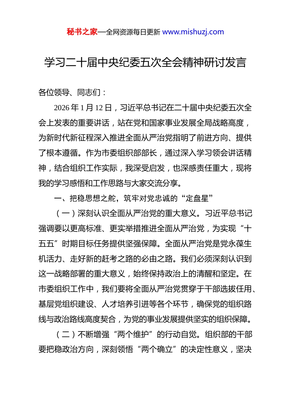 秘书之家—全网资源每日更新 www.mishuzj.com学习二十届中央纪委五次全会精神研讨发言 各位领导、同志们:2026 年 1 月 12 日,习近平总书记在二十届中央纪委五次全会上发表的重要讲话,站在党和国家事业发展全局战略高度,为新时代新征程深入推进全面从严治党指明了前进方向、提供了根本遵循。作为市委组织部部长,通过深入学习领会讲话精神,结合组织工作实际,我深受启发,也深感责任重大,现将我的学习感悟和工作思路与大家交流分享。一、把稳思想之舵,筑牢对党忠诚的“定盘星”(一)深刻认识全面从严治党的重大意义。习近平总书记强调要以更高标准、更实举措推进全面从严治党,为实现“十五五”时期目标任务提供坚强保障。全面从严治党是党永葆生机活力、走好新的赶考之路的必由之路。我们必须深刻认识到这一战略部署的重大意义,始终保持政治上的清醒和坚定。在市委组织工作中,我们要将全面从严治党贯穿于干部选拔任用、基层党组织建设、人才培养引进等各个环节,确保党的组织路线与政治路线高度契合,为党的事业发展提供坚实的组织保障。(二)不断增强“两个维护”的行动自觉。组织部的干部要把稳政治方向,深刻领悟“两个确立”的决定性意义,坚决秘书之家—全网资源每日更新 www.mishuzj.com做到“两个维护”。不断提高政治判断力、政治领悟力、政治执行力,在思想上、政治上、行动上同以习近平同志为核心的党中央保持高度一致。要持之以恒地用习近平新时代中国特色社会主义思想武装头脑,通过开展系统的理论学习、专题研讨、实践锻炼等活动,使组工干部坚定理想信念,锤炼党性修养,增强对党的忠诚之心、对人民的赤子之情,确保组织工作始终沿着正确的政治方向前进。今年地方换届工作即将开展,我们更要以高度的政治责任感,严格把好政治关,选拔出真正忠诚可靠、表里如一、担当尽责的好干部。二、把严组织纪律,织密选贤任能的“过滤网”(一)严格执行组织纪律,确保组织路线贯彻落实。习近平总书记指出,纪律建设是全面从严治党的治本之策。组织部作为管党治党的重要职能部门,必须严格执行党的组织纪律,确保党的组织路线得到坚决贯彻落实。在干部选拔任用工作中,要坚持德才兼备、以德为先、五湖四海、任人唯贤的原则,严格按照干部选拔任用程序办事,把好政治关、廉洁关、素质能力关。坚决防止和纠正选人用人上的不正之风,杜绝任人唯亲、跑官要官、买官卖官等现象的发生。今年是换届年,我们要以铁的纪律确保换届工作风清气正,选出忠诚干净担当的好干部,配出结构优功能强的好班子。秘书之家—全网资源每日更新 www.mishuzj.com(二)加强干部日常监督管理,建立健全监督体系。要加强对干部的日常监督管理,建立健全干部监督管理体系。通过日常考核、专项考核、年度考核等多种方式,全面了解干部的工作表现、思想动态和廉洁自律情况。做到早发现、早提醒、早纠正,防止干部小错酿成大错。要加强对干部选拔任用工作的全过程监督,确保组织工作的公正性和透明度,让权力在阳光下运行。同时,要充分发挥群众监督、舆论监督等作用,形成全方位、多层次的监督网络,确保干部正确行使权力。三、把实党建责任,拧紧基层党建的“螺丝钉”(一)强化党建主体责任,推动基层党组织全面进步。习近平总书记要求,要增强党组织政治功能和组织功能。作为组织部部长,我们要切实履行好抓基层党建的主体责任,加强对基层党组织的建设和指导,推动基层党组织全面进步、全面过硬。要加强党支部标准化规范化建设,制定明确的建设标准和考核指标,定期对基层党组织进行考核评估,及时发现问题并督促整改。通过加强党支部建设,提高基层党组织的凝聚力和战斗力,使其成为贯彻落实党中央决策部署的坚强战斗堡垒。(二)加强党员队伍建设,发挥党员先锋模范作用。要加强党员队伍建设,严格党员教育管理。通过开展形式多样的党员教育培训活动,提高党员的政治素质和业务能力。要严格党秘书之家—全网资源每日更新 www.mishuzj.com员发展程序,把好党员入口关,确保新发展党员的质量。同时,要加强对党员的日常管理,建立健全党员考核评价机制,激励党员发挥先锋模范作用。...