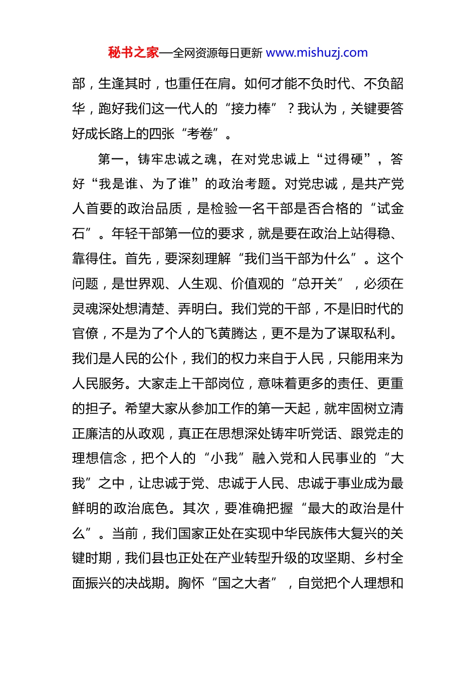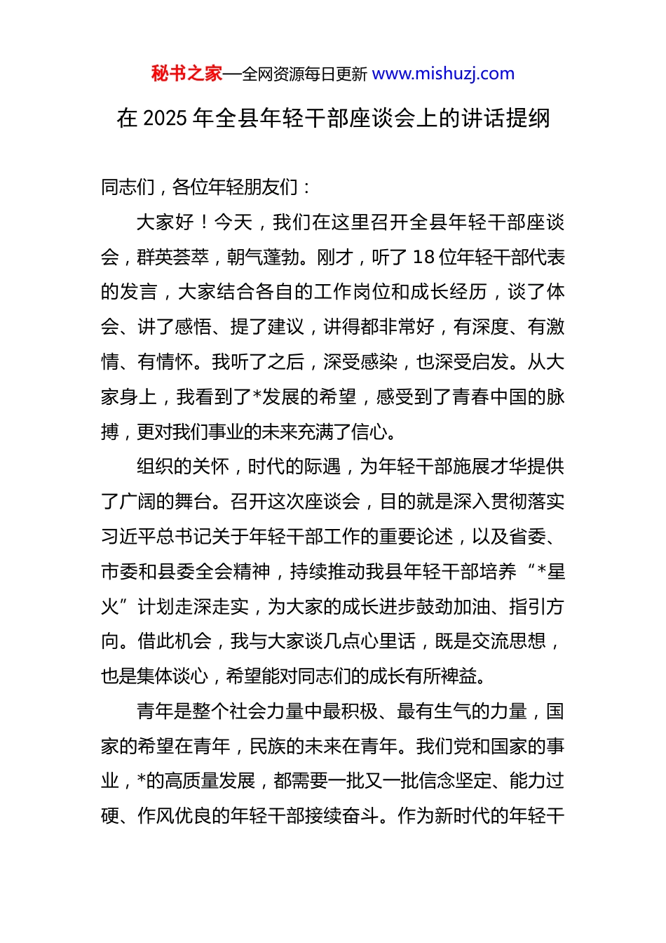秘书之家—全网资源每日更新 www.mishuzj.com在 2025 年全县年轻干部座谈会上的讲话提纲 同志们,各位年轻朋友们:大家好!今天,我们在这里召开全县年轻干部座谈会,群英荟萃,朝气蓬勃。刚才,听了 18 位年轻干部代表的发言,大家结合各自的工作岗位和成长经历,谈了体会、讲了感悟、提了建议,讲得都非常好,有深度、有激情、有情怀。我听了之后,深受感染,也深受启发。从大家身上,我看到了*发展的希望,感受到了青春中国的脉搏,更对我们事业的未来充满了信心。组织的关怀,时代的际遇,为年轻干部施展才华提供了广阔的舞台。召开这次座谈会,目的就是深入贯彻落实习近平总书记关于年轻干部工作的重要论述,以及省委、市委和县委全会精神,持续推动我县年轻干部培养“*星火”计划走深走实,为大家的成长进步鼓劲加油、指引方向。借此机会,我与大家谈几点心里话,既是交流思想,也是集体谈心,希望能对同志们的成长有所裨益。青年是整个社会力量中最积极、最有生气的力量,国家的希望在青年,民族的未来在青年。我们党和国家的事业,*的高质量发展,都需要一批又一批信念坚定、能力过硬、作风优良的年轻干部接续奋斗。作为新时代的年轻干秘书之家—全网资源每日更新 www.mishuzj.com部,生逢其时,也重任在肩。如何才能不负时代、不负韶华,跑好我们这一代人的“接力棒”?我认为,关键要答好成长路上的四张“考卷”。第一,铸牢忠诚之魂,在对党忠诚上“过得硬”,答好“我是谁、为了谁”的政治考题。对党忠诚,是共产党人首要的政治品质,是检验一名干部是否合格的“试金石”。年轻干部第一位的要求,就是要在政治上站得稳、靠得住。首先,要深刻理解“我们当干部为什么”。这个问题,是世界观、人生观、价值观的“总开关”,必须在灵魂深处想清楚、弄明白。我们党的干部,不是旧时代的官僚,不是为了个人的飞黄腾达,更不是为了谋取私利。我们是人民的公仆,我们的权力来自于人民,只能用来为人民服务。大家走上干部岗位,意味着更多的责任、更重的担子。希望大家从参加工作的第一天起,就牢固树立清正廉洁的从政观,真正在思想深处铸牢听党话、跟党走的理想信念,把个人的“小我”融入党和人民事业的“大我”之中,让忠诚于党、忠诚于人民、忠诚于事业成为最鲜明的政治底色。其次,要准确把握“最大的政治是什么”。当前,我们国家正处在实现中华民族伟大复兴的关键时期,我们县也正处在产业转型升级的攻坚期、乡村全面振兴的决战期。胸怀“国之大者”,自觉把个人理想和秘书之家—全网资源每日更新 www.mishuzj.com奋斗融入时代发展的洪流,这就是最大的政治。年轻干部不能只埋头于自己的一亩三分地,而要时刻关注党中央在关心什么、强调什么,时刻对标省委、市委和县委的决策部署。要把我们正在做的事情,放到全国、全省、全市的大格局中去思考和定位,确保我们的工作始终沿着正确的政治方向前进。只有这样,我们的视野才会更开阔,格局才会更大,工作的立意和成效才会更高。最后,要清醒认识“*的大局是什么”。*是我们共同的家园,推动*高质量发展,让全县人民过上更加幸福美好的生活,这就是我们当前最大的大局。每一位年轻干部,都是这个大局中的一分子,都是推动*发展不可或缺的力量。大家要时刻把职责使命扛在肩上,把*的发展当作自己的事业,主动思考、积极作为。无论是身处项目建设的一线,还是在服务群众的窗口,或是在机关单位的案头,都要把自己的工作与全县的发展大局紧密联系起来,做到县委有号召、我们有行动,发展有需要、我们有贡献。第二,砥砺担当之肩,在干事创业上“顶得起”,答好“怎么干、干成啥”的实践考题。“空谈误国,实干兴邦。”衡量一个干部行不行,关键看担当,看实干。年轻干部有干劲、有闯劲,但也容易缺乏经验、历练不足。越是如此,越要在实践中锤炼担当的宽肩膀、成事的真本秘书之家—全网资源每日更新 www.mishuzj.com领。要把学习作为一种习惯。当今世界,知识更新日新月异,新情况、新问题层出不穷。我们常常会有一种“本领恐慌”。克服恐慌的唯一办法,就是学习。不仅要深入学习党的创新理论,用科学理论武装头脑、...