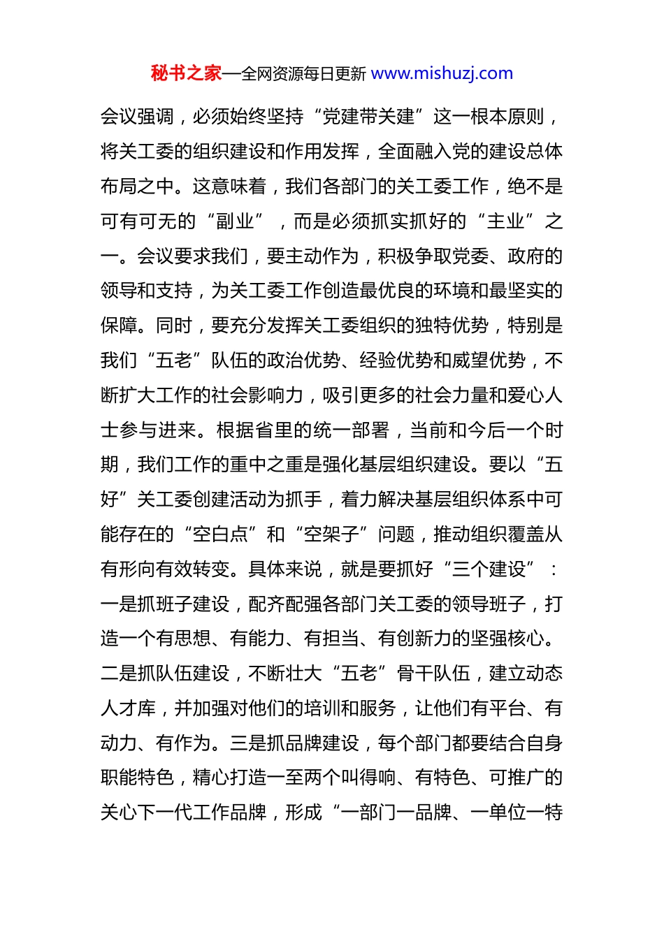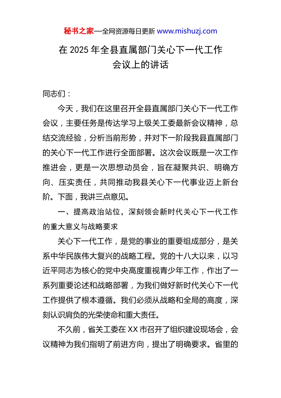 秘书之家—全网资源每日更新 www.mishuzj.com在 2025 年全县直属部门关心下一代工作会议上的讲话 同志们:今天,我们在这里召开全县直属部门关心下一代工作会议,主要任务是传达学习上级关工委最新会议精神,总结交流经验,分析当前形势,并对下一阶段我县直属部门的关心下一代工作进行全面部署。这次会议既是一次工作推进会,更是一次思想动员会,旨在凝聚共识、明确方向、压实责任,共同推动我县关心下一代事业迈上新台阶。下面,我讲三点意见。一、提高政治站位,深刻领会新时代关心下一代工作的重大意义与战略要求关心下一代工作,是党的事业的重要组成部分,是关系中华民族伟大复兴的战略工程。党的十八大以来,以习近平同志为核心的党中央高度重视青少年工作,作出了一系列重要论述和战略部署,为我们做好新时代关心下一代工作提供了根本遵循。我们必须从战略和全局的高度,深刻认识肩负的光荣使命和重大责任。不久前,省关工委在 XX 市召开了组织建设现场会,会议精神为我们指明了前进方向,提出了明确要求。省里的秘书之家—全网资源每日更新 www.mishuzj.com会议强调,必须始终坚持“党建带关建”这一根本原则,将关工委的组织建设和作用发挥,全面融入党的建设总体布局之中。这意味着,我们各部门的关工委工作,绝不是可有可无的“副业”,而是必须抓实抓好的“主业”之一。会议要求我们,要主动作为,积极争取党委、政府的领导和支持,为关工委工作创造最优良的环境和最坚实的保障。同时,要充分发挥关工委组织的独特优势,特别是我们“五老”队伍的政治优势、经验优势和威望优势,不断扩大工作的社会影响力,吸引更多的社会力量和爱心人士参与进来。根据省里的统一部署,当前和今后一个时期,我们工作的重中之重是强化基层组织建设。要以“五好”关工委创建活动为抓手,着力解决基层组织体系中可能存在的“空白点”和“空架子”问题,推动组织覆盖从有形向有效转变。具体来说,就是要抓好“三个建设”:一是抓班子建设,配齐配强各部门关工委的领导班子,打造一个有思想、有能力、有担当、有创新力的坚强核心。二是抓队伍建设,不断壮大“五老”骨干队伍,建立动态人才库,并加强对他们的培训和服务,让他们有平台、有动力、有作为。三是抓品牌建设,每个部门都要结合自身职能特色,精心打造一至两个叫得响、有特色、可推广的关心下一代工作品牌,形成“一部门一品牌、一单位一特秘书之家—全网资源每日更新 www.mishuzj.com色”的生动局面。我们要认真学习借鉴 XX 市的先进经验,探索组织联体、资源联用、人员联动的多元化工作模式,切实提升我们工作的整体效能。二、聚焦主责主业,准确把握新形势下部门关工委的核心任务与履职关键明确了上级的要求和方向,关键在于我们如何结合自身实际,找准定位、精准履职。县委王主任在上次会议中强调的“定位是前提,履职是核心,作用是关键,平台是支撑”这四个方面,为我们部门关工委的工作画出了清晰的路线图。——定位是前提。各部门关工委必须清晰地认识到,我们不是一个游离于部门中心工作之外的“额外负担”,而是部门履行社会责任、服务大局发展的重要载体。我们的定位,就是要立足本部门的职能优势,服务于全县关心下一代工作的大局。我们既不能脱离部门的业务范围去搞“大而全”,也不能局限于部门的“小圈子”而自我封闭。譬如,政法系统关工委,就要在预防青少年犯罪、开展普法教育、维护青少年合法权益方面下功夫;教育系统关工委,就要在立德树人、加强师德师风建设、促进家校社协同育人方面做表率;文旅系统关工委,就要在传承红色基因、弘扬优秀传统文化、丰富青少年精神文化生活方秘书之家—全网资源每日更新 www.mishuzj.com面出实招。只有找准了这个结合点,我们的工作才能有根基、有活力、有生命力。——履职是核心。我们的核心职责,就是要构建和深化“学校、家庭、社会”三位一体的协同育人机制。这项工作,关工委不能缺位,更不能越位,而是要主动作为,扮演好“粘合剂”和“催化剂”的角色。具体来说,要推动以下几个方面的协同:一是推动领导机制的协同。各部门党组织要切实负起领导责任,...