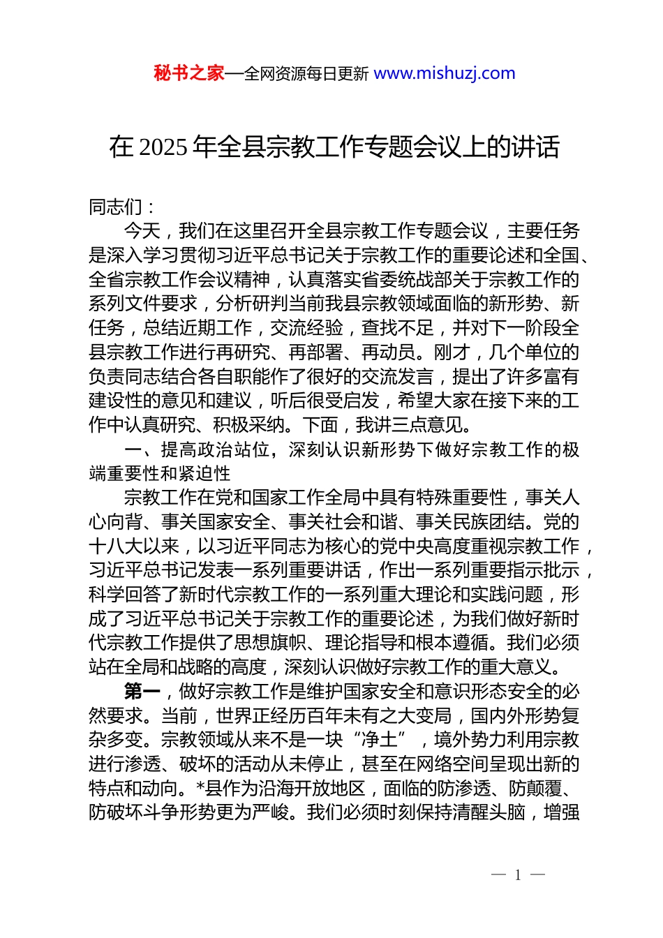 秘书之家—全网资源每日更新 www.mishuzj.com在 2025 年全县宗教工作专题会议上的讲话同志们:今天,我们在这里召开全县宗教工作专题会议,主要任务是深入学习贯彻习近平总书记关于宗教工作的重要论述和全国、全省宗教工作会议精神,认真落实省委统战部关于宗教工作的系列文件要求,分析研判当前我县宗教领域面临的新形势、新任务,总结近期工作,交流经验,查找不足,并对下一阶段全县宗教工作进行再研究、再部署、再动员。刚才,几个单位的负责同志结合各自职能作了很好的交流发言,提出了许多富有建设性的意见和建议,听后很受启发,希望大家在接下来的工作中认真研究、积极采纳。下面,我讲三点意见。一、提高政治站位,深刻认识新形势下做好宗教工作的极端重要性和紧迫性宗教工作在党和国家工作全局中具有特殊重要性,事关人心向背、事关国家安全、事关社会和谐、事关民族团结。党的十八大以来,以习近平同志为核心的党中央高度重视宗教工作,习近平总书记发表一系列重要讲话,作出一系列重要指示批示,科学回答了新时代宗教工作的一系列重大理论和实践问题,形成了习近平总书记关于宗教工作的重要论述,为我们做好新时代宗教工作提供了思想旗帜、理论指导和根本遵循。我们必须站在全局和战略的高度,深刻认识做好宗教工作的重大意义。第一,做好宗教工作是维护国家安全和意识形态安全的必然要求。当前,世界正经历百年未有之大变局,国内外形势复杂多变。宗教领域从来不是一块“净土”,境外势力利用宗教进行渗透、破坏的活动从未停止,甚至在网络空间呈现出新的特点和动向。*县作为沿海开放地区,面临的防渗透、防颠覆、防破坏斗争形势更为严峻。我们必须时刻保持清醒头脑,增强— 1 —秘书之家—全网资源每日更新 www.mishuzj.com忧患意识,树牢底线思维,把防范化解宗教领域重大风险隐患作为一项重大政治任务来抓,牢牢掌握宗教工作主动权,坚决筑牢抵御境外宗教渗透和防范极端宗教思想侵害的铜墙铁壁,切实维护我县政治安全和意识形态安全。第二,做好宗教工作是促进社会和谐与民族团结的内在需要。我县是一个多民族聚居的自治县,维护民族团结、促进社会和谐稳定是我们一切工作的基础。宗教信仰在部分群众的日常生活中扮演着重要角色,处理好宗教问题,就是处理好群众问题。全面贯彻党的宗教信仰自由政策,依法管理宗教事务,积极引导宗教与社会主义社会相适应,能够有效团结信教群众和不信教群众,把广大人民群众紧密团结在党和政府周围,形成推动我县经济社会发展的强大合力。实践证明,宗教关系和谐是社会和谐、民族和睦的重要基础。我们必须用心用情用力做好宗教工作,巩固和发展党同宗教界的爱国统一战线,最大限度地凝聚人心、汇聚力量。第三,做好宗教工作是推进治理体系和治理能力现代化的重要组成部分。宗教事务管理是国家治理的重要方面。提升宗教工作法治化水平,是推进全面依法治国的应有之义。近年来,我们按照中央和省委的部署,不断完善宗教工作体制机制,特别是“三级网络、两级责任制”的建立,有效提升了基层宗教事务治理能力。但同时我们也要看到,随着社会发展,宗教事务管理面临许多新情况、新问题,对我们的治理能力提出了更高要求。我们必须与时俱进,不断创新工作理念、方法和手段,把宗教工作纳入全县社会治理大局中去谋划和推进,不断提升运用法治思维和法治方式处理宗教问题的能力,奋力推动我县宗教工作迈上新台阶。二、肯定成绩,正视问题,准确把握当前我县宗教工作的现实状况近年来,在县委的坚强领导下,在全县各级各部门的共同— 2 —秘书之家—全网资源每日更新 www.mishuzj.com努力下,我们认真贯彻落实党中央关于宗教工作的决策部署和省委工作要求,全县宗教工作取得了明显成效,宗教领域总体保持了和谐稳定的良好局面。一是工作责任体系不断健全。我们坚持党对宗教工作的集中统一领导,县委定期听取宗教工作汇报,专题研究解决重大问题。各级党委(党组)主体责任、统战部门牵头协调责任、相关部门具体职责得到进一步明确。覆盖县、镇、村(社区)的三级宗教工作网络和镇、村(社区)两级责任制有效运行,基层宗教工作力...