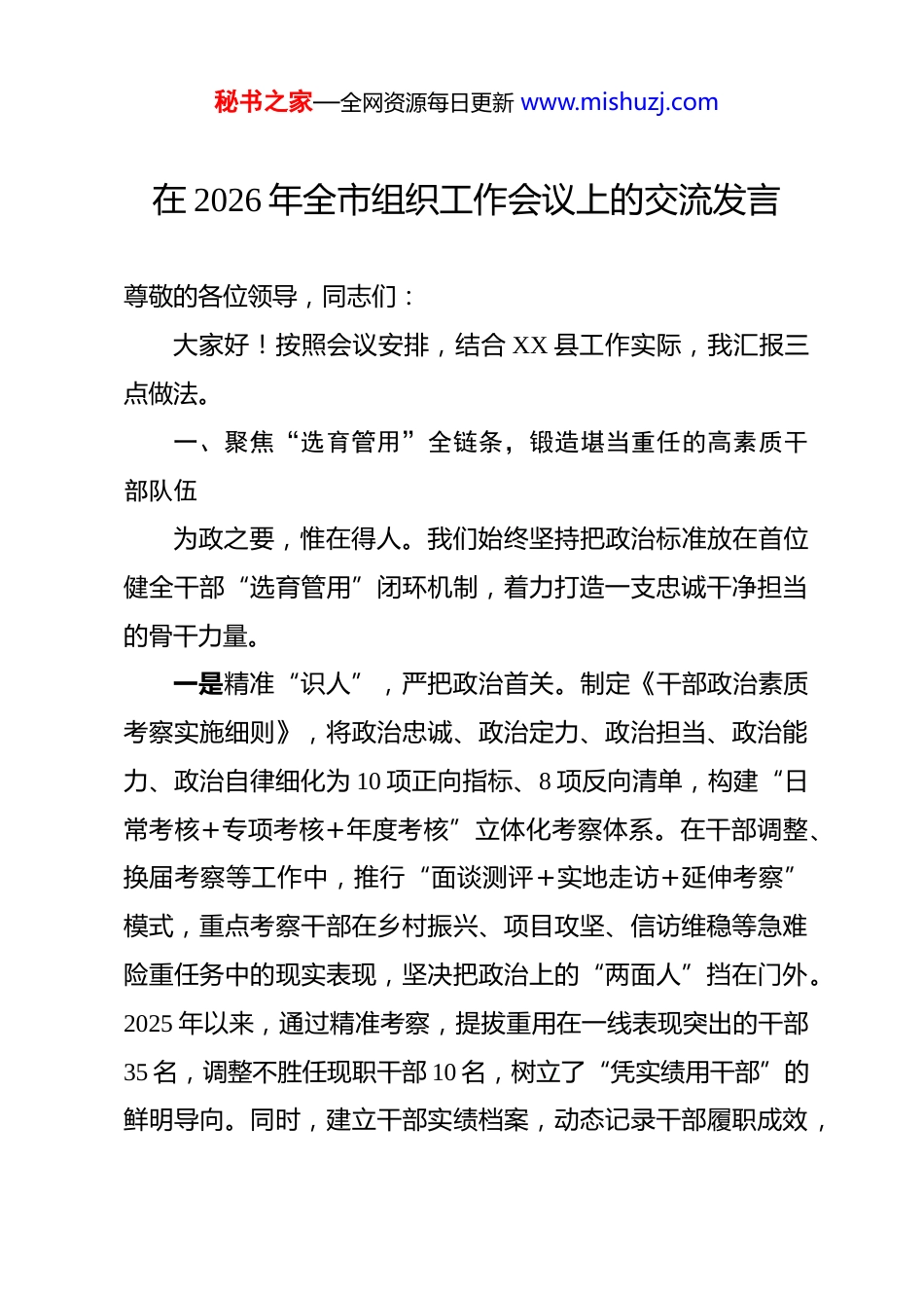 秘书之家—全网资源每日更新 www.mishuzj.com在 2026 年全市组织工作会议上的交流发言 尊敬的各位领导,同志们:大家好!按照会议安排,结合 XX 县工作实际,我汇报三点做法。一、聚焦“选育管用”全链条,锻造堪当重任的高素质干部队伍为政之要,惟在得人。我们始终坚持把政治标准放在首位健全干部“选育管用”闭环机制,着力打造一支忠诚干净担当的骨干力量。一是精准“识人”,严把政治首关。制定《干部政治素质考察实施细则》,将政治忠诚、政治定力、政治担当、政治能力、政治自律细化为 10 项正向指标、8 项反向清单,构建“日常考核+专项考核+年度考核”立体化考察体系。在干部调整、换届考察等工作中,推行“面谈测评+实地走访+延伸考察”模式,重点考察干部在乡村振兴、项目攻坚、信访维稳等急难险重任务中的现实表现,坚决把政治上的“两面人”挡在门外。2025 年以来,通过精准考察,提拔重用在一线表现突出的干部35 名,调整不胜任现职干部 10 名,树立了“凭实绩用干部”的鲜明导向。同时,建立干部实绩档案,动态记录干部履职成效,秘书之家—全网资源每日更新 www.mishuzj.com让干部干有方向、评有依据、用有标准。二是精心“育人”,提升履职能力。紧扣发展需求,构建“靶向培训+实践锻炼”的干部培养体系。围绕新质生产力培育、城乡融合发展、基层治理现代化等重点工作,开设“发展大讲堂”“干部夜校”,邀请专家学者、业务骨干、先进典型授课,全年举办专题培训班 20 期,培训干部 1500 余人次。实施“年轻干部墩苗成长计划”,选派 60 名优秀年轻干部到招商引资、征地拆迁、重点项目建设等一线岗位挂职锻炼,让干部在实践中经风雨、见世面、壮筋骨。建立“导师帮带”制度,安排经验丰富的领导干部与年轻干部结对子,手把手传授工作方法和经验,目前已有 15 名挂职干部因表现优异被提拔到重要岗位。三是精细“管人”,激发干事活力。健全严管厚爱结合的干部管理机制,制定《干部担当作为正向激励办法》,对在重点工作中作出突出贡献的干部,在评优评先、职级晋升、绩效奖励上优先考虑,2025 年共表彰奖励担当作为先进个人 50 名。强化干部日常监督管理,构建“八小时内”工作监督与“八小时外”社交监督联动机制,通过谈心谈话、信访核查、个人有关事项报告核查等方式,及时发现和纠正干部苗头性、倾向性问题。严格落实“三个区分开来”要求,健全容错纠错机制,秘书之家—全网资源每日更新 www.mishuzj.com为敢于担当、踏实做事的干部撑腰鼓劲,2025 年以来共对 4 名干部予以容错纠错,营造了“为担当者担当、为负责者负责”的良好氛围。二、聚焦“强基固本”主抓手,筑牢引领基层治理的战斗堡垒基础不牢,地动山摇。我们始终坚持大抓基层的鲜明导向以提升组织力为重点,推动基层党组织全面进步、全面过硬。一是分类施策,建强基层战斗堡垒。制定《基层党组织标准化规范化建设三年行动计划》,分农村、社区、机关、两新组织等领域出台建设标准,明确组织设置、班子建设、党员管理、议事决策等 6 大类 28 项具体指标。采取“示范引领、分批推进”的方式,打造“五星级党支部”50 个,通过召开现场会、组织观摩学习等形式,以点带面推动全县基层党组织建设水平整体提升。针对农村党组织,实施“头雁领航”工程,选优配强村党组织书记,培育壮大村集体经济,2025 年全县村集体经济年收入 10 万元以上的村占比达到 88%;针对社区党组织,深化“红色物业”建设,构建“社区党组织+物业公司+业主委员会”三方联动机制,解决群众急难愁盼问题 260 余件;针对两新组织,开展“组织覆盖提质增效”行动,采取“单独建、联合建、挂靠建”等方式,新建两新党组织 18 个,实现应建尽秘书之家—全网资源每日更新 www.mishuzj.com建。二是党建引领,提升基层治理效能。健全“县委统筹、乡镇主导、村社抓落实”的基层治理体系,推行“党建+网格”治理模式,将全县划分为 300 个基础网格,配备网格员 600 名,把党支部建在网格上、党小组设在楼栋里、党员责任落实到家门口。常态化开展“党员联户”活动,组织全县 8500 余名党...