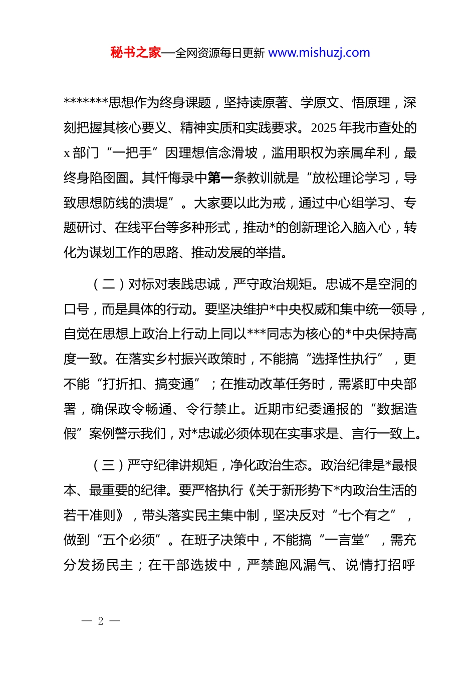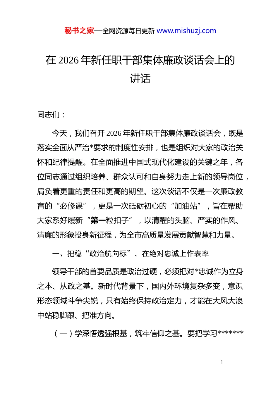 秘书之家—全网资源每日更新 www.mishuzj.com在 2026 年新任职干部集体廉政谈话会上的讲话同志们:今天,我们召开 2026 年新任职干部集体廉政谈话会,既是落实全面从严治*要求的制度性安排,也是组织对大家的政治关怀和纪律提醒。在全面推进中国式现代化建设的关键之年,各位同志通过组织培养、群众认可和自身努力走上新的领导岗位,肩负着更重的责任和更高的期望。这次谈话不仅是一次廉政教育的“必修课”,更是一次砥砺初心的“加油站”,旨在帮助大家系好履新“第一粒扣子”,以清醒的头脑、严实的作风、清廉的形象投身新征程,为全市高质量发展贡献智慧和力量。一、把稳“政治航向标”,在绝对忠诚上作表率领导干部的首要品质是政治过硬,必须把对*忠诚作为立身之本、从政之基。新时代背景下,国内外环境复杂多变,意识形态领域斗争尖锐,只有始终保持政治定力,才能在大风大浪中站稳脚跟、把准方向。(一)学深悟透强根基,筑牢信仰之基。要把学习*******— 1 —秘书之家—全网资源每日更新 www.mishuzj.com*******思想作为终身课题,坚持读原著、学原文、悟原理,深刻把握其核心要义、精神实质和实践要求。2025 年我市查处的x 部门“一把手”因理想信念滑坡,滥用职权为亲属牟利,最终身陷囹圄。其忏悔录中第一条教训就是“放松理论学习,导致思想防线的溃堤”。大家要以此为戒,通过中心组学习、专题研讨、在线平台等多种形式,推动*的创新理论入脑入心,转化为谋划工作的思路、推动发展的举措。(二)对标对表践忠诚,严守政治规矩。忠诚不是空洞的口号,而是具体的行动。要坚决维护*中央权威和集中统一领导,自觉在思想上政治上行动上同以***同志为核心的*中央保持高度一致。在落实乡村振兴政策时,不能搞“选择性执行”,更不能“打折扣、搞变通”;在推动改革任务时,需紧盯中央部署,确保政令畅通、令行禁止。近期市纪委通报的“数据造假”案例警示我们,对*忠诚必须体现在实事求是、言行一致上。(三)严守纪律讲规矩,净化政治生态。政治纪律是*最根本、最重要的纪律。要严格执行《关于新形势下*内政治生活的若干准则》,带头落实民主集中制,坚决反对“七个有之”,做到“五个必须”。在班子决策中,不能搞“一言堂”,需充分发扬民主;在干部选拔中,严禁跑风漏气、说情打招呼— 2 —秘书之家—全网资源每日更新 www.mishuzj.com2025 年我市推行“政治生态监测评估系统”,对各级班子民主生活会质量、重大事项报告等情况动态考评,大家要主动适应这种严的氛围。二、扛牢“千钧责任链”,在管*治*上敢担当权力就是责任,责任就要担当。新岗位意味着新使命,必须牢固树立“抓好 dj 是最大政绩”的理念,切实履行管*治*政治责任,推动全面从严治*向纵深发展。(一)种好“责任田”,压实主体责任。要严格对照《*委(*组)落实全面从严治*主体责任规定》,制定个人责任清单,将*风廉政建设与业务工作同部署、同检查、同考核。尤其是“一把手”,要定期研究部署廉政工作,每年至少开展 x 次专题调研、听取 x 次分管领域廉政汇报。2026 年市纪委将升级“责任落实动态监测系统”,对履责不力的单位亮牌预警,大家务必做到守土有责、守土尽责。(二)管好“身边人”,筑牢家庭防线。家风败坏是领导干部走向违纪违法的重要诱因。要严格执行配偶、子女及其配偶经商办企业禁业规定,严禁利用职权或影响力为亲属谋取不正当利益。2025 年查处的 x 区局长纵容子女承揽本单位工程项— 3 —秘书之家—全网资源每日更新 www.mishuzj.com目,最终全家被查处。大家要定期与家人谈心谈话,加强家风教育,管好生活圈、社交圈,做到“后院不失火”。(三)抓好“关键点”,防范廉政风险。聚焦资金密集、资源富集、权力集中的领域,如工程建设、行政审批、国资监管等,健全内控机制,压缩自由裁量权。比如,某县推行“工程变更联审制”,要求 xx 万元以上变更须经专家论证、集体决策,有效堵塞漏洞。大家要结合分管工作,每年开展 x 次廉政风险排查,建立问题清单、整改清单、责任清单,实现闭环管理。三、念好“作风紧箍咒”,在务实担当上树形象作风建设...