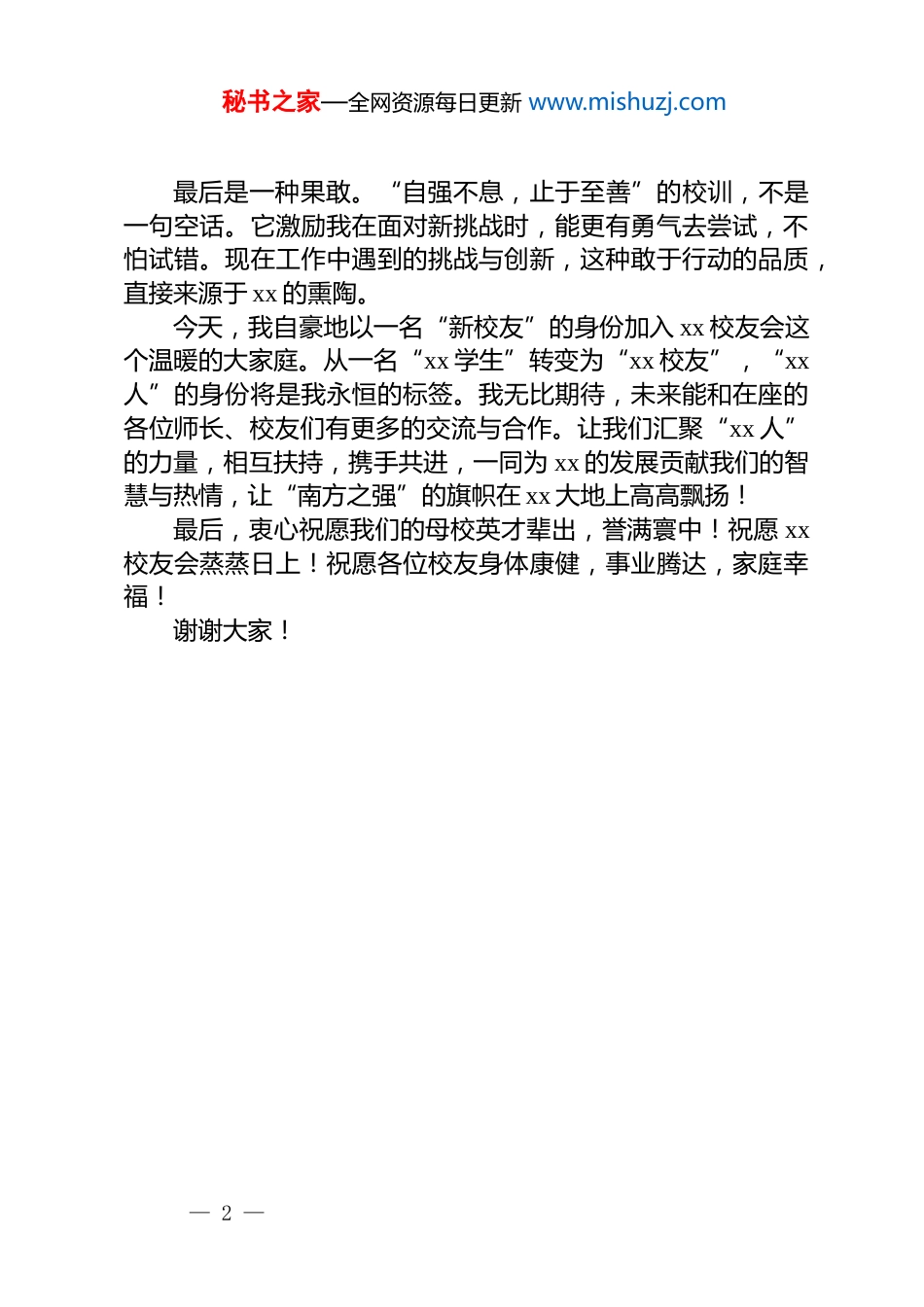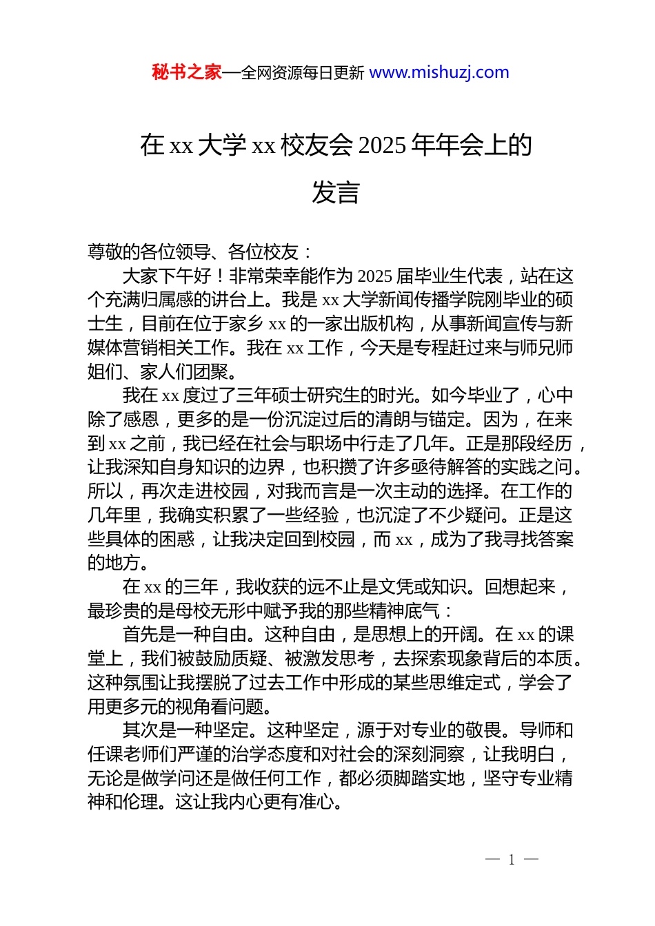 秘书之家—全网资源每日更新 www.mishuzj.com在 xx 大学 xx 校友会 2025 年年会上的发言尊敬的各位领导、各位校友:大家下午好!非常荣幸能作为 2025 届毕业生代表,站在这个充满归属感的讲台上。我是 xx 大学新闻传播学院刚毕业的硕士生,目前在位于家乡 xx 的一家出版机构,从事新闻宣传与新媒体营销相关工作。我在 xx 工作,今天是专程赶过来与师兄师姐们、家人们团聚。我在 xx 度过了三年硕士研究生的时光。如今毕业了,心中除了感恩,更多的是一份沉淀过后的清朗与锚定。因为,在来到 xx 之前,我已经在社会与职场中行走了几年。正是那段经历,让我深知自身知识的边界,也积攒了许多亟待解答的实践之问。所以,再次走进校园,对我而言是一次主动的选择。在工作的几年里,我确实积累了一些经验,也沉淀了不少疑问。正是这些具体的困惑,让我决定回到校园,而 xx,成为了我寻找答案的地方。在 xx 的三年,我收获的远不止是文凭或知识。回想起来,最珍贵的是母校无形中赋予我的那些精神底气:首先是一种自由。这种自由,是思想上的开阔。在 xx 的课堂上,我们被鼓励质疑、被激发思考,去探索现象背后的本质。这种氛围让我摆脱了过去工作中形成的某些思维定式,学会了用更多元的视角看问题。其次是一种坚定。这种坚定,源于对专业的敬畏。导师和任课老师们严谨的治学态度和对社会的深刻洞察,让我明白,无论是做学问还是做任何工作,都必须脚踏实地,坚守专业精神和伦理。这让我内心更有准心。— 1 —秘书之家—全网资源每日更新 www.mishuzj.com最后是一种果敢。“自强不息,止于至善”的校训,不是一句空话。它激励我在面对新挑战时,能更有勇气去尝试,不怕试错。现在工作中遇到的挑战与创新,这种敢于行动的品质,直接来源于 xx 的熏陶。今天,我自豪地以一名“新校友”的身份加入 xx 校友会这个温暖的大家庭。从一名“xx 学生”转变为“xx 校友”,“xx人”的身份将是我永恒的标签。我无比期待,未来能和在座的各位师长、校友们有更多的交流与合作。让我们汇聚“xx 人”的力量,相互扶持,携手共进,一同为 xx 的发展贡献我们的智慧与热情,让“南方之强”的旗帜在 xx 大地上高高飘扬!最后,衷心祝愿我们的母校英才辈出,誉满寰中!祝愿 xx校友会蒸蒸日上!祝愿各位校友身体康健,事业腾达,家庭幸福!谢谢大家!— 2 —