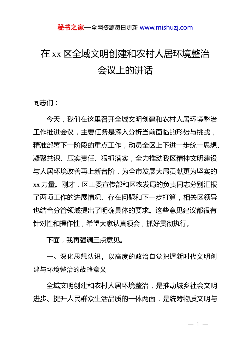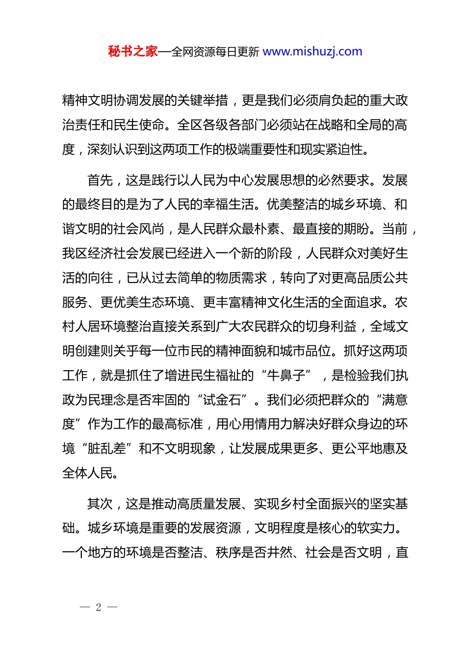 秘书之家—全网资源每日更新 www.mishuzj.com在 xx 区全域文明创建和农村人居环境整治会议上的讲话同志们:今天,我们在这里召开全域文明创建和农村人居环境整治工作推进会议,主要任务是深入分析当前面临的形势与挑战,精准部署下一阶段的重点工作,动员全区上下进一步统一思想、凝聚共识、压实责任、狠抓落实,全力推动我区精神文明建设与人居环境改善再上新台阶,为全市发展大局贡献更为坚实的xx 力量。刚才,区工委宣传部和区农发局的负责同志分别汇报了两项工作的进展情况、存在问题和下一步打算,相关区领导也结合分管领域提出了明确具体的要求。这些意见建议都很有针对性和操作性,希望大家认真领会,抓好贯彻执行。下面,我再强调三点意见。一、深化思想认识,以高度的政治自觉把握新时代文明创建与环境整治的战略意义全域文明创建和农村人居环境整治,是推动城乡社会文明进步、提升人民群众生活品质的一体两面,是统筹物质文明与— 1 —秘书之家—全网资源每日更新 www.mishuzj.com精神文明协调发展的关键举措,更是我们必须肩负起的重大政治责任和民生使命。全区各级各部门必须站在战略和全局的高度,深刻认识到这两项工作的极端重要性和现实紧迫性。首先,这是践行以人民为中心发展思想的必然要求。发展的最终目的是为了人民的幸福生活。优美整洁的城乡环境、和谐文明的社会风尚,是人民群众最朴素、最直接的期盼。当前,我区经济社会发展已经进入一个新的阶段,人民群众对美好生活的向往,已从过去简单的物质需求,转向了对更高品质公共服务、更优美生态环境、更丰富精神文化生活的全面追求。农村人居环境整治直接关系到广大农民群众的切身利益,全域文明创建则关乎每一位市民的精神面貌和城市品位。抓好这两项工作,就是抓住了增进民生福祉的“牛鼻子”,是检验我们执政为民理念是否牢固的“试金石”。我们必须把群众的“满意度”作为工作的最高标准,用心用情用力解决好群众身边的环境“脏乱差”和不文明现象,让发展成果更多、更公平地惠及全体人民。其次,这是推动高质量发展、实现乡村全面振兴的坚实基础。城乡环境是重要的发展资源,文明程度是核心的软实力。一个地方的环境是否整洁、秩序是否井然、社会是否文明,直— 2 —秘书之家—全网资源每日更新 www.mishuzj.com接影响着其对人才、资本、项目的吸引力。当前,区域竞争日趋激烈,优化营商环境不仅在于政策的优惠,更在于城乡面貌和社会文明程度的提升。一个干净、有序、文明的 xx,才能更好地筑巢引凤,吸引更多优质资源汇聚。同时,农村人居环境整治是实施乡村振兴战略的第一场硬仗。根据《全国农村人居环境整治监测报告》显示,截至 2024 年底,全国农村卫生厕所普及率已超过 80%,生活垃圾进行收运处理的行政村比例稳定在 90%以上,但区域不平衡、管护机制不健全等问题依然存在。对我区而言,作为“建成区外乡镇”的定位,决定了我们的工作重心和主战场在农村。农村环境搞不好,乡村振兴就是一句空话;乡村文明跟不上,振兴就失去了灵魂。我们必须将环境整治与产业发展、乡风文明、乡村治理统筹推进,打造宜居宜业和美乡村,为高质量发展注入源源不断的内生动力。最后,这是提升区域治理能力和治理水平现代化的重要检验。全域文明创建和农村人居环境整治涉及面广、关联度高、工作链条长,是对我们统筹协调能力、社会动员能力、精细化管理能力的综合考验。从公共设施的规划建设与长效管护,到公共秩序的综合治理;从垃圾分类的宣传普及,到移风易俗的深入推进,每一项任务都考验着我们的治理智慧和执行能力。— 3 —秘书之家—全网资源每日更新 www.mishuzj.com例如,在公共卫生领域,虽然我区一些基础性指标完成率较高,如根据相关数据显示,2024 至 2025 年度我区部分公共卫生服务关键指标完成率达到 100%,但在诸如老年人健康体检、慢性病管理等精细化服务上仍有提升空间。这要求我们必须摒弃过去粗放式、运动式的管理方式,转向建立系统化、常态化、长效化的治理机制。通过这两项工作的深入开展,倒逼我们不断创新治理理念、完善治理体系、提升治理效能,推动全区治理能力现...