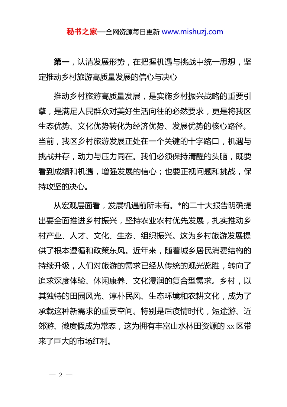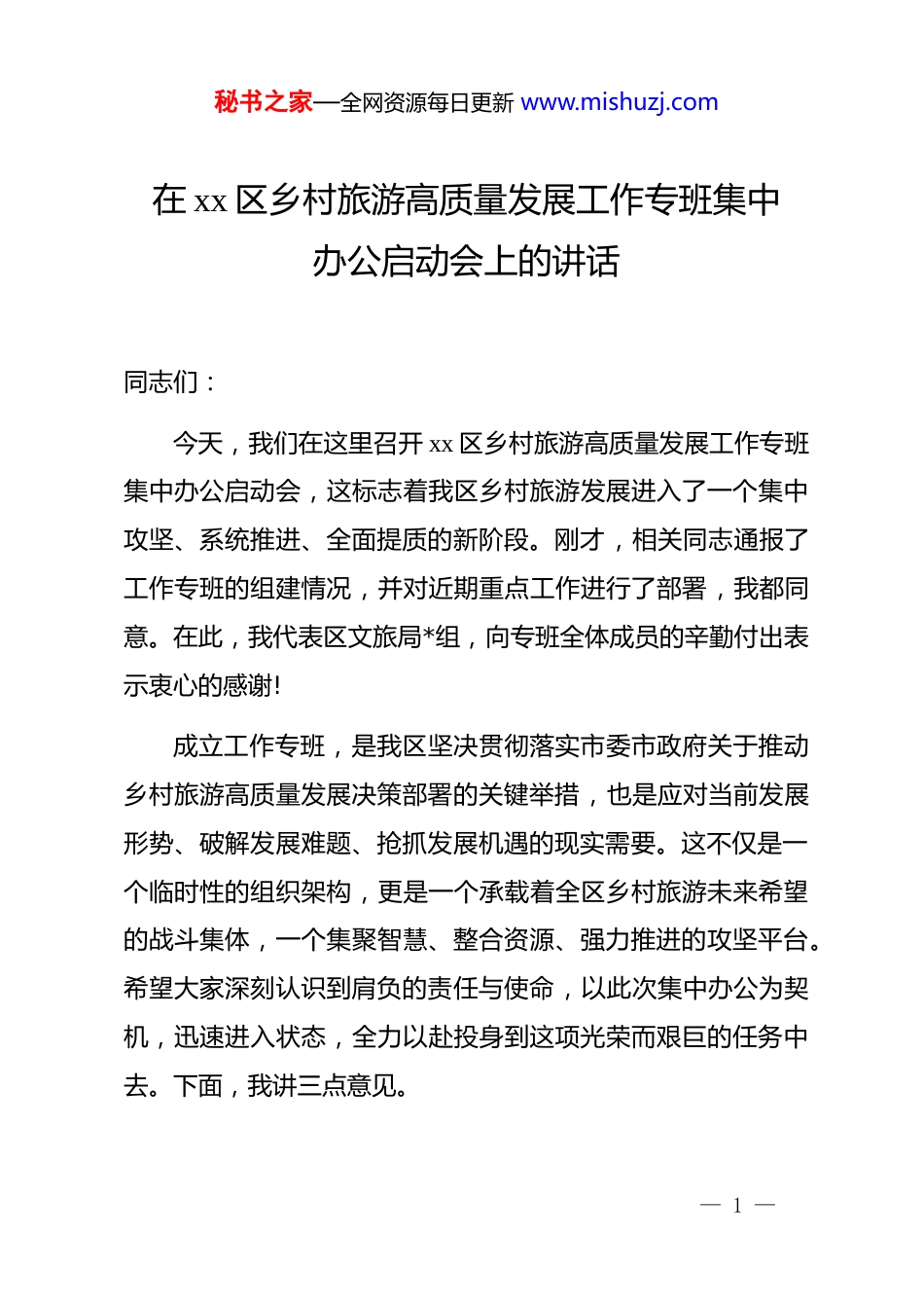 秘书之家—全网资源每日更新 www.mishuzj.com在 xx 区乡村旅游高质量发展工作专班集中办公启动会上的讲话同志们:今天,我们在这里召开 xx 区乡村旅游高质量发展工作专班集中办公启动会,这标志着我区乡村旅游发展进入了一个集中攻坚、系统推进、全面提质的新阶段。刚才,相关同志通报了工作专班的组建情况,并对近期重点工作进行了部署,我都同意。在此,我代表区文旅局*组,向专班全体成员的辛勤付出表示衷心的感谢!成立工作专班,是我区坚决贯彻落实市委市政府关于推动乡村旅游高质量发展决策部署的关键举措,也是应对当前发展形势、破解发展难题、抢抓发展机遇的现实需要。这不仅是一个临时性的组织架构,更是一个承载着全区乡村旅游未来希望的战斗集体,一个集聚智慧、整合资源、强力推进的攻坚平台。希望大家深刻认识到肩负的责任与使命,以此次集中办公为契机,迅速进入状态,全力以赴投身到这项光荣而艰巨的任务中去。下面,我讲三点意见。— 1 —秘书之家—全网资源每日更新 www.mishuzj.com第一,认清发展形势,在把握机遇与挑战中统一思想,坚定推动乡村旅游高质量发展的信心与决心推动乡村旅游高质量发展,是实施乡村振兴战略的重要引擎,是满足人民群众对美好生活向往的必然要求,更是将我区生态优势、文化优势转化为经济优势、发展优势的核心路径。当前,我区乡村旅游发展正处在一个关键的十字路口,机遇与挑战并存,动力与压力同在。我们必须保持清醒的头脑,既要看到成绩和机遇,增强发展的信心;也要正视问题和挑战,保持攻坚的决心。从宏观层面看,发展机遇前所未有。*的二十大报告明确提出要全面推进乡村振兴,坚持农业农村优先发展,扎实推动乡村产业、人才、文化、生态、组织振兴。这为乡村旅游发展提供了根本遵循和政策东风。近年来,随着城乡居民消费结构的持续升级,人们对旅游的需求已经从传统的观光览胜,转向了追求深度体验、休闲康养、文化浸润的复合型需求。乡村,以其独特的田园风光、淳朴民风、生态环境和农耕文化,成为了承载这种新需求的重要空间。特别是后疫情时代,短途游、近郊游、微度假成为常态,这为拥有丰富山水林田资源的 xx 区带来了巨大的市场红利。— 2 —秘书之家—全网资源每日更新 www.mishuzj.com从区域实践看,发展基础坚实有力。经过多年的培育和发展,我区乡村旅游已经从零散的“农家乐”模式,逐步成长为具有一定规模和影响力的区域性产业。我们欣喜地看到,全区旅游市场呈现出强劲的复苏态势。根据统计数据显示,2024 年我区 a 级及以上和重点旅游区(点)接待人数达到 1350 万人次,比上年增长 45.6%。尤其在节假日期间,乡村旅游更是表现突出。例如,2024 年国庆假期,我区乡村旅游接待了 33.52 万人次,同比实现了 232.03%的惊人增长。进入 2025 年,这一良好势头得以延续,仅“五一”假期,全区就接待游客 62.85 万人次,同比增长 24.62%。这些数据充分证明了我区乡村旅游的巨大潜力和广阔前景,是我们推动高质量发展的底气所在。然而,在肯定成绩的同时,我们更要清醒地看到发展中存在的短板与不足。一是“散”的问题依然突出。目前我区乡村旅游业态多以单点、散户为主,缺乏有效的产业联动和集群效应,尚未形成能够引领市场、具有强大竞争力的旅游产业带和目的地品牌。二是“低”的问题尚未根本解决。部分乡村旅游产品文化内涵挖掘不深,同质化现象严重,体验性、参与性不强,停留在“吃农家饭、住农家院”的初级阶段,附加值不高,产业链条短,难以满足游客日益多元化、品质化的消费需求。— 3 —秘书之家—全网资源每日更新 www.mishuzj.com三是“弱”的问题亟待破解。基础设施和公共服务体系仍是我们的薄弱环节。尽管我们持续投入,但部分地区的道路交通、停车场、旅游厕所、网络信号等设施仍不完善,服务标准、管理水平、人才支撑等方面也与高质量发展的要求存在差距。面对这些挑战,我们不能回避,更不能退缩。成立工作专班,就是要集中全局乃至全区的优势力量,聚焦这些瓶颈问题,进行靶向治疗和系统破解。全体专班成员必须将思想和行动高度统一到区委区政府的决策部署上来,深...