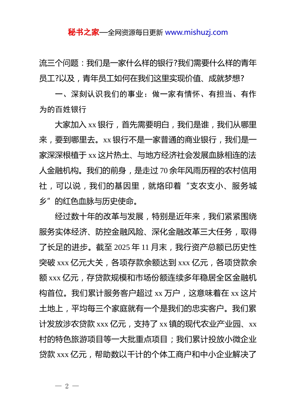 秘书之家—全网资源每日更新 www.mishuzj.com在 xx 银行新员工入职座谈会上的讲话各位新同事、同志们:大家上午好!今天,我们怀着十分欣喜的心情,在这里隆重举行新员工入职座谈会。首先,我代表 xx 银行*委和全体干部员工,向经过层层选拔、优中选优、最终脱颖而出的各位新同事,表示最热烈的欢迎和最诚挚的祝贺!欢迎你们加入 xx 银行这个温暖而又充满活力的大家庭,为我们的事业注入了新鲜血液,增添了新的力量。看着你们一张张朝气蓬勃、充满希望的脸庞,我仿佛看到了 xx 银行更加璀璨的未来。你们是全行经过严格程序、精心挑选的优秀人才,是承载着我们未来发展希望的生力军。今天我们召开这个座谈会,既是一个欢迎会,也是一个交流会,更是一个加油鼓劲的期许会。希望通过今天的面对面沟通,能帮助大家更快地融入团队,更深地理解我们的事业,更清晰地规划自己的职业生涯,与 xx 银行同成长、共奋进,携手开启我们共同事业的新篇章。同志们,新同事们,选择了一份职业,就是选择了一种人生。在大家正式开启职业生涯画卷的时刻,我想与大家深入交— 1 —秘书之家—全网资源每日更新 www.mishuzj.com流三个问题:我们是一家什么样的银行?我们需要什么样的青年员工?以及,青年员工如何在我们这里实现价值、成就梦想?一、深刻认识我们的事业:做一家有情怀、有担当、有作为的百姓银行大家加入 xx 银行,首先需要明白,我们是谁,我们从哪里来,要到哪里去。xx 银行不是一家普通的商业银行,我们是一家深深根植于 xx 这片热土、与地方经济社会发展血脉相连的法人金融机构。我们的前身,是走过 70 余年风雨历程的农村信用社,可以说,我们的基因里,就烙印着“支农支小、服务城乡”的红色血脉与历史使命。经过数十年的改革与发展,特别是近年来,我们紧紧围绕服务实体经济、防控金融风险、深化金融改革三大任务,取得了长足的进步。截至 2025 年 11 月末,我行资产总额已历史性突破 xxx 亿元大关,各项存款余额达到 xxx 亿元,各项贷款余额 xxx 亿元,存贷款规模和市场份额连续多年稳居全区金融机构首位。我们累计服务客户超过 xx 万户,这意味着在 xx 这片土地上,平均每三个家庭就有一个是我们的忠实客户。我们累计发放涉农贷款 xxx 亿元,支持了 xx 镇的现代农业产业园、xx村的特色旅游项目等一大批重点项目;我们累计投放小微企业贷款 xxx 亿元,帮助数以千计的个体工商户和中小企业解决了— 2 —秘书之家—全网资源每日更新 www.mishuzj.com融资难题,稳住了就业岗位。在数字化转型的浪潮中,我行手机银行用户数突破 xx 万户,线上信贷产品“xx 贷”累计放款超过 xx 亿元,金融服务的触角已经延伸到了城乡的每一个角落。这些数据背后,是我们作为地方金融主力军的责任与担当,是我们服务 xx 高质量发展的初心与坚守。我们的文化,是在泥泞的田埂上磨砺出的“铁脚板精神”,是在走村入户中传承下来的“挎包精神”。这种文化的核心,就是“责任、实干、卓越、关爱”。我们参观的 xx 支行,作为五星级网点,其背后是几代人数十年如一日的精耕细作;我们看到的 dj 文化厅堂,浓缩了我行从无到有、由弱到强的发展历程,每一面锦旗、每一张照片,都讲述着一个奋斗的故事。因此,大家要深刻地认识到,你们加入的,不仅仅是一个谋生的单位,更是一个承载着服务“三农”、助力小微、推动区域经济发展神圣使命的价值平台。在这里工作,你们办理的每一笔业务,不仅仅是简单的数字流转,而是为一位农户的丰收梦想提供了保障,为一家小微企业的生存发展注入了活力,为 xx 的乡村振兴大业贡献了金融力量。希望大家能从内心深处建立起这份职业认同感、归属感和自豪感,将个人的理想追求,与 xx 银行的发展愿景、与 xx 的繁荣进步,紧密地融合在一起。二、主动迎接时代的挑战:做一名有理想、有本领、有担— 3 —秘书之家—全网资源每日更新 www.mishuzj.com当的新时代农商人时代的车轮滚滚向前,金融行业的变革日新月异。面对新的形势与挑战,我们比以往任何时候都更需要一支政治过硬、作风优良、业务精湛的青年队伍。在此,...