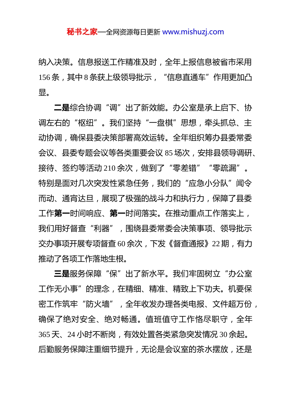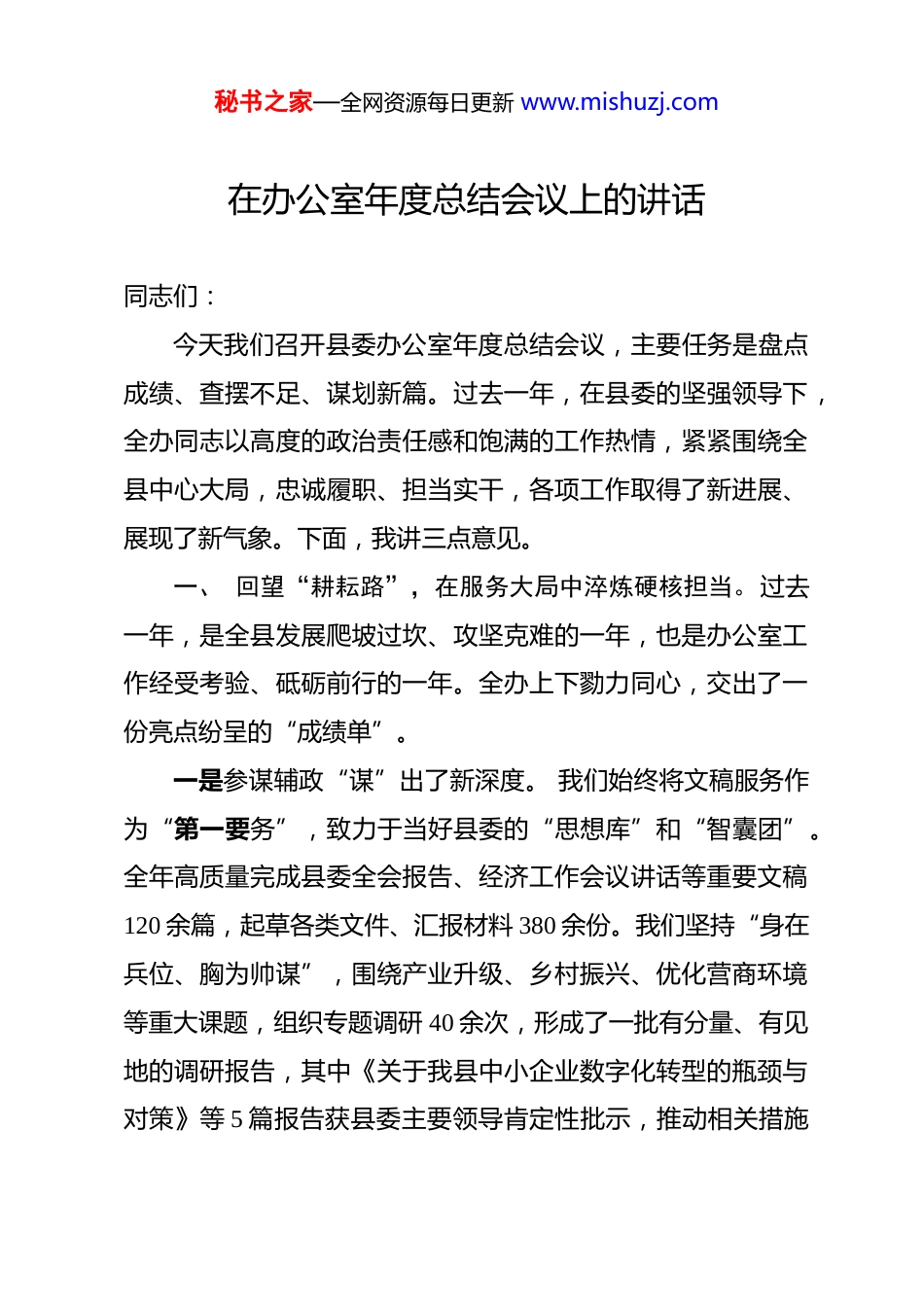 秘书之家—全网资源每日更新 www.mishuzj.com在办公室年度总结会议上的讲话 同志们:今天我们召开县委办公室年度总结会议,主要任务是盘点成绩、查摆不足、谋划新篇。过去一年,在县委的坚强领导下,全办同志以高度的政治责任感和饱满的工作热情,紧紧围绕全县中心大局,忠诚履职、担当实干,各项工作取得了新进展、展现了新气象。下面,我讲三点意见。一、 回望“耕耘路”,在服务大局中淬炼硬核担当。过去一年,是全县发展爬坡过坎、攻坚克难的一年,也是办公室工作经受考验、砥砺前行的一年。全办上下勠力同心,交出了一份亮点纷呈的“成绩单”。一是参谋辅政“谋”出了新深度。 我们始终将文稿服务作为“第一要务”,致力于当好县委的“思想库”和“智囊团”。全年高质量完成县委全会报告、经济工作会议讲话等重要文稿120 余篇,起草各类文件、汇报材料 380 余份。我们坚持“身在兵位、胸为帅谋”,围绕产业升级、乡村振兴、优化营商环境等重大课题,组织专题调研 40 余次,形成了一批有分量、有见地的调研报告,其中《关于我县中小企业数字化转型的瓶颈与对策》等 5 篇报告获县委主要领导肯定性批示,推动相关措施秘书之家—全网资源每日更新 www.mishuzj.com纳入决策。信息报送工作精准及时,全年上报信息被省市采用156 条,其中 8 条获上级领导批示,“信息直通车”作用更加凸显。二是综合协调“调”出了新效能。办公室是承上启下、协调左右的“枢纽”。我们坚持“一盘棋”思想,牵头抓总、主动协调,确保县委决策部署高效运转。全年组织筹办县委常委会议、县委专题会议等各类重要会议 85 场次,安排县领导调研、接待、签约等活动 210 余次,做到了“零差错”“零疏漏”。特别是面对几次突发性紧急任务,我们的“应急小分队”闻令而动、通宵达旦,展现了极强的战斗力和执行力,保障了县委工作第一时间响应、第一时间落实。在推动重点工作落实上,我们用好督查“利器”,围绕县委常委会决策事项、领导批示交办事项开展专项督查 60 余次,下发《督查通报》22 期,有力推动了各项工作落地生根。三是服务保障“保”出了新水平。我们牢固树立“办公室工作无小事”的理念,在精细、精准、精致上下功夫。机要保密工作筑牢“防火墙”,全年收发办理各类电报、文件超万份,确保了绝对安全、绝对畅通。值班值守工作恪尽职守,全年365 天、24 小时不断岗,有效处置各类紧急突发情况 30 余起。后勤服务保障注重细节提升,无论是会议室的茶水摆放,还是秘书之家—全网资源每日更新 www.mishuzj.com办公环境的整洁有序,都力求做到“尽善尽美”。档案工作顺利通过省级规范化管理复查,服务查档利用效率显著提高。四是队伍建设“练”出了新风貌。我们坚持把政治建设摆在首位,深入开展主题教育,引导全办同志深刻领悟“两个确立”的决定性意义,坚决做到“两个维护”。业务能力建设常抓不懈,组织开展“文稿点评会”“业务大讲堂”等活动 20 余场次,年轻干部“传帮带”机制持续深化,营造了比学赶超的浓厚氛围。作风建设从严从实,大力倡导“事不过夜、马上就办”的工作作风,全办同志甘于奉献、任劳任怨,“5+2”“白加黑”成为常态,充分展现了党办人“特别能吃苦、特别能战斗、特别能奉献”的精神风貌。二、 对镜“正衣冠”,在检视反思中查摆短板弱项。在肯定成绩的同时,我们更要保持清醒头脑,以“刀刃向内”的勇气,正视工作中存在的不足和差距。一是“参谋力”的精准度与前瞻性仍有提升空间。部分文稿有时还停留在“汇总情况”层面,思想性、战略性、对策性有待加强,“金点子”“好主意”还不够多。对经济社会发展中一些苗头性、倾向性问题的深度分析和风险预警,有时还不够敏锐、不够超前。二是“协调力”的权威性与艺术性尚需增强。在统筹协调秘书之家—全网资源每日更新 www.mishuzj.com一些跨部门、跨领域的复杂工作时,有时存在“协调变协商”的情况,运用制度力量推动落实的刚性略显不足。协调的方式方法有时可以更加灵活、更有温度,更好地凝聚工作合力。三是“落实力”的穿透力与闭环性有待强化。督查工作有时存在“重过程、轻结果”的现...