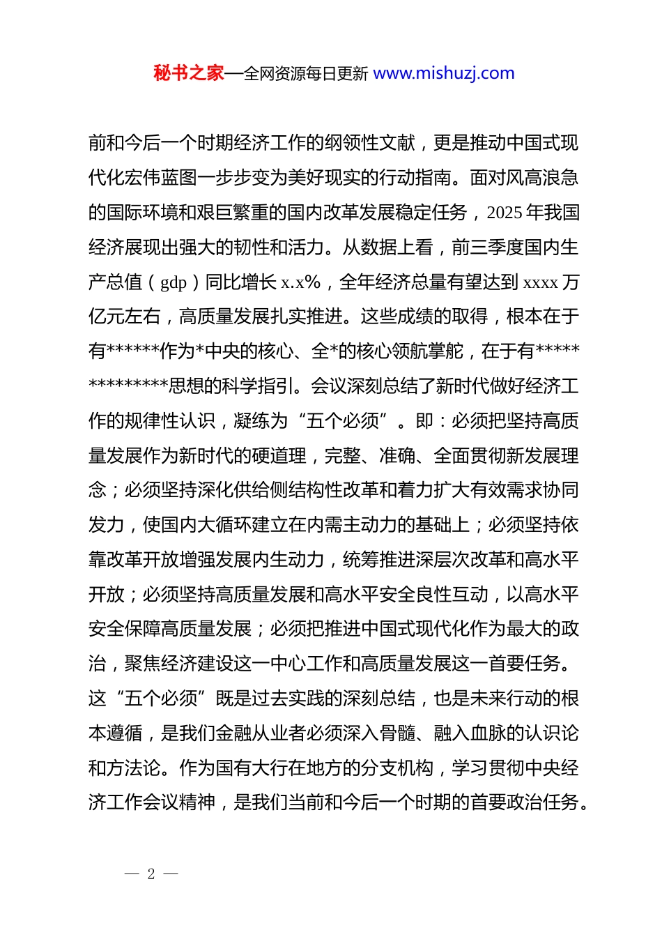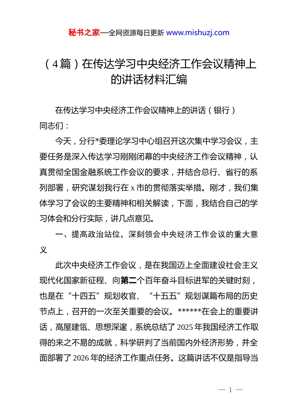 秘书之家—全网资源每日更新 www.mishuzj.com(4 篇)在传达学习中央经济工作会议精神上的讲话材料汇编在传达学习中央经济工作会议精神上的讲话(银行)同志们:今天,分行*委理论学习中心组召开这次集中学习会议,主要任务是深入传达学习刚刚闭幕的中央经济工作会议精神,认真贯彻全国金融系统工作会议的要求,并结合总行、省行的系列部署,研究谋划我行在 x 市的贯彻落实举措。刚才,我们集体学习了会议的主要精神和相关解读,下面,我结合自己的学习体会和分行实际,讲几点意见。一、提高政治站位,深刻领会中央经济工作会议的重大意义此次中央经济工作会议,是在我国迈上全面建设社会主义现代化国家新征程、向第二个百年奋斗目标进军的关键时刻,也是在“十四五”规划收官、“十五五”规划谋篇布局的历史节点上,召开的一次至关重要的会议。******在会上的重要讲话,高屋建瓴、思想深邃,系统总结了 2025 年我国经济工作取得的来之不易的成就,科学研判了当前国内外经济形势,并全面部署了 2026 年的经济工作重点任务。这篇讲话不仅是指导当— 1 —秘书之家—全网资源每日更新 www.mishuzj.com前和今后一个时期经济工作的纲领性文献,更是推动中国式现代化宏伟蓝图一步步变为美好现实的行动指南。面对风高浪急的国际环境和艰巨繁重的国内改革发展稳定任务,2025 年我国经济展现出强大的韧性和活力。从数据上看,前三季度国内生产总值(gdp)同比增长 x.x%,全年经济总量有望达到 xxxx 万亿元左右,高质量发展扎实推进。这些成绩的取得,根本在于有******作为*中央的核心、全*的核心领航掌舵,在于有**************思想的科学指引。会议深刻总结了新时代做好经济工作的规律性认识,凝练为“五个必须”。即:必须把坚持高质量发展作为新时代的硬道理,完整、准确、全面贯彻新发展理念;必须坚持深化供给侧结构性改革和着力扩大有效需求协同发力,使国内大循环建立在内需主动力的基础上;必须坚持依靠改革开放增强发展内生动力,统筹推进深层次改革和高水平开放;必须坚持高质量发展和高水平安全良性互动,以高水平安全保障高质量发展;必须把推进中国式现代化作为最大的政治,聚焦经济建设这一中心工作和高质量发展这一首要任务。这“五个必须”既是过去实践的深刻总结,也是未来行动的根本遵循,是我们金融从业者必须深入骨髓、融入血脉的认识论和方法论。作为国有大行在地方的分支机构,学习贯彻中央经济工作会议精神,是我们当前和今后一个时期的首要政治任务。— 2 —秘书之家—全网资源每日更新 www.mishuzj.com全行上下必须将思想和行动统一到*中央对经济形势的重大判断和决策部署上来,将学习成果与贯彻*的二十大和二十届历次全会精神结合起来,与落实总省行工作要求结合起来,找准我行服务 x 市高质量发展的切入点和着力点,切实履行好国有大行的责任担当。二、聚焦重点任务,奋力谱写金融服务 x 高质量发展新篇章******指出,做好明年经济工作,要坚持稳中求进、以进促稳、先立后破。会议明确了“八个坚持”的重点任务,为我们指明了主攻方向。全行必须闻令而动,对标对表,将中央的宏观政策蓝图转化为我行服务的具体施工图,为 x 市在“十五五”时期实现良好开局贡献坚实的金融力量。第一,坚持*的领导,以高质量 dj 引领高质量发展。金融是国之重器,金融工作的政治性、人民性决定了必须毫不动摇地坚持和加强*对金融工作的全面领导。这是我们一切工作的根本保证。要始终把政治建设摆在首位。全行各级*组织和全体*员干部要深刻领悟“两个确立”的决定性意义,增强“四个意识”、坚定“四个自信”、做到“两个维护”,确保分行各项工作始终沿着*中央指引的正确方向前进。要持续深化*的创新理论武装,巩固拓展 zt 教育成果,将**************思想,特— 3 —秘书之家—全网资源每日更新 www.mishuzj.com别是***经济思想,贯穿于经营管理、业务发展、风险防控的全过程、各环节,真正做到学思用贯通、知信行统一。要大力弘扬求真务实的工作作风。中央强调要不折不扣抓落实、雷厉风行抓落实、求真务实抓落实、敢作善为抓落实。我们要坚决反...