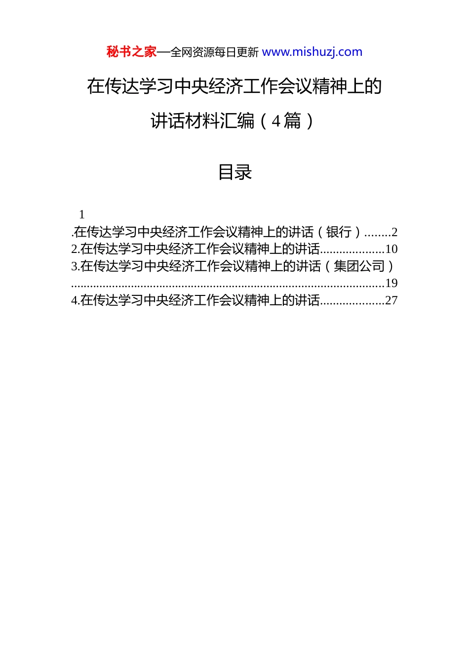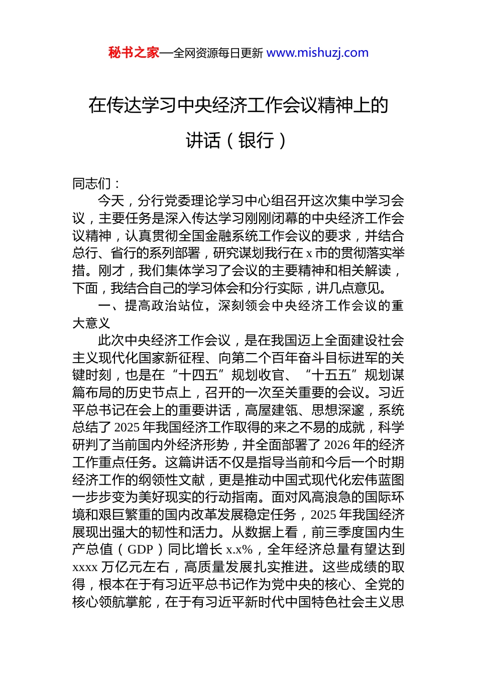 秘书之家—全网资源每日更新 www.mishuzj.com在传达学习中央经济工作会议精神上的讲话材料汇编(4 篇)目录1.在传达学习中央经济工作会议精神上的讲话(银行)........22.在传达学习中央经济工作会议精神上的讲话....................103.在传达学习中央经济工作会议精神上的讲话(集团公司)...................................................................................................194.在传达学习中央经济工作会议精神上的讲话....................27秘书之家—全网资源每日更新 www.mishuzj.com在传达学习中央经济工作会议精神上的讲话(银行)同志们:今天,分行党委理论学习中心组召开这次集中学习会议,主要任务是深入传达学习刚刚闭幕的中央经济工作会议精神,认真贯彻全国金融系统工作会议的要求,并结合总行、省行的系列部署,研究谋划我行在 x 市的贯彻落实举措。刚才,我们集体学习了会议的主要精神和相关解读,下面,我结合自己的学习体会和分行实际,讲几点意见。一、提高政治站位,深刻领会中央经济工作会议的重大意义此次中央经济工作会议,是在我国迈上全面建设社会主义现代化国家新征程、向第二个百年奋斗目标进军的关键时刻,也是在“十四五”规划收官、“十五五”规划谋篇布局的历史节点上,召开的一次至关重要的会议。习近平总书记在会上的重要讲话,高屋建瓴、思想深邃,系统总结了 2025 年我国经济工作取得的来之不易的成就,科学研判了当前国内外经济形势,并全面部署了 2026 年的经济工作重点任务。这篇讲话不仅是指导当前和今后一个时期经济工作的纲领性文献,更是推动中国式现代化宏伟蓝图一步步变为美好现实的行动指南。面对风高浪急的国际环境和艰巨繁重的国内改革发展稳定任务,2025 年我国经济展现出强大的韧性和活力。从数据上看,前三季度国内生产总值(GDP)同比增长 x.x%,全年经济总量有望达到xxxx 万亿元左右,高质量发展扎实推进。这些成绩的取得,根本在于有习近平总书记作为党中央的核心、全党的核心领航掌舵,在于有习近平新时代中国特色社会主义思秘书之家—全网资源每日更新 www.mishuzj.com想的科学指引。会议深刻总结了新时代做好经济工作的规律性认识,凝练为“五个必须”。即:必须把坚持高质量发展作为新时代的硬道理,完整、准确、全面贯彻新发展理念;必须坚持深化供给侧结构性改革和着力扩大有效需求协同发力,使国内大循环建立在内需主动力的基础上;必须坚持依靠改革开放增强发展内生动力,统筹推进深层次改革和高水平开放;必须坚持高质量发展和高水平安全良性互动,以高水平安全保障高质量发展;必须把推进中国式现代化作为最大的政治,聚焦经济建设这一中心工作和高质量发展这一首要任务。这“五个必须”既是过去实践的深刻总结,也是未来行动的根本遵循,是我们金融从业者必须深入骨髓、融入血脉的认识论和方法论。作为国有大行在地方的分支机构,学习贯彻中央经济工作会议精神,是我们当前和今后一个时期的首要政治任务。全行上下必须将思想和行动统一到党中央对经济形势的重大判断和决策部署上来,将学习成果与贯彻党的二十大和二十届历次全会精神结合起来,与落实总省行工作要求结合起来,找准我行服务 x 市高质量发展的切入点和着力点,切实履行好国有大行的责任担当。二、聚焦重点任务,奋力谱写金融服务 x 高质量发展新篇章习近平总书记指出,做好明年经济工作,要坚持稳中求进、以进促稳、先立后破。会议明确了“八个坚持”的重点任务,为我们指明了主攻方向。全行必须闻令而动,对标对表,将中央的宏观政策蓝图转化为我行服务的具体施工图,为 x 市在“十五五”时期实现良好开局贡献坚实的金融力量。第一,坚持党的领导,以高质量党建引领高质量发展。金融是国之重器,金融工作的政治性、人民性决定了必须毫不动摇地坚持和加强党对金融工作的全面领导。这是我们一切工作的根本保证。要始终把政治建设摆在首秘书之家—全网资源每日更新 www.mishuzj.com位。全行各级党组织和全体党员干部要深刻领悟“两个确立”的决定性意义,增强“四个意识”、坚定“四个自信”、做到“两个维...