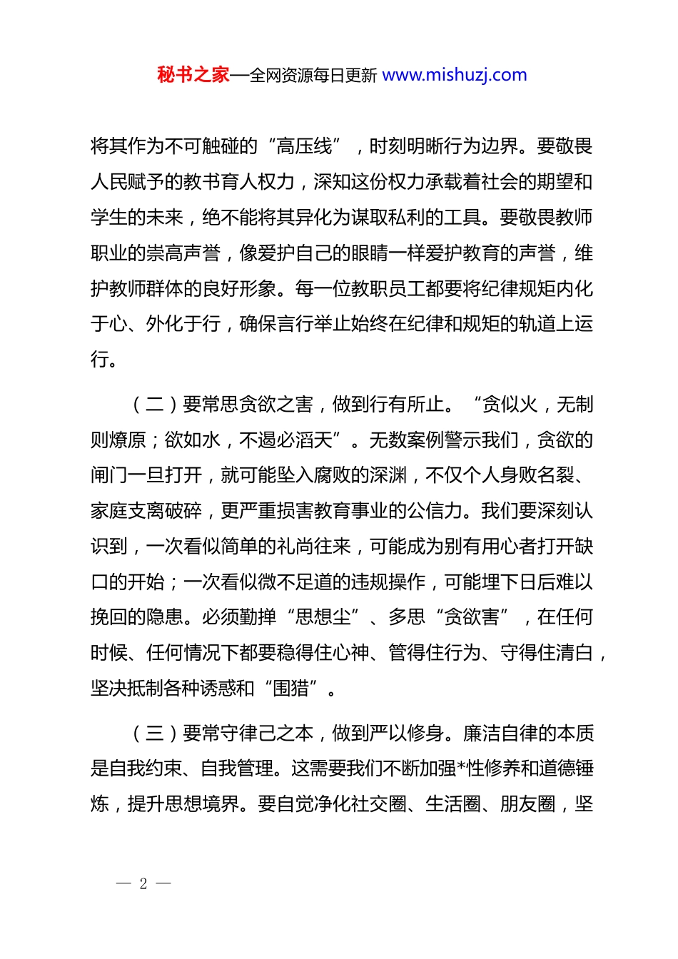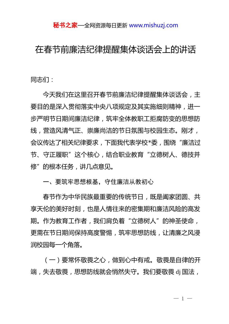 秘书之家—全网资源每日更新 www.mishuzj.com在春节前廉洁纪律提醒集体谈话会上的讲话同志们:今天我们在这里召开春节前廉洁纪律提醒集体谈话会,主要目的是深入贯彻落实中央八项规定及其实施细则精神,进一步严明节日期间廉洁纪律,筑牢全体教职工拒腐防变的思想防线,营造风清气正、崇廉尚洁的节日氛围与校园生态。刚才,会议传达了相关纪律要求,下面我代表学校*委,围绕“廉洁过节、守正履职”这个核心,结合职业教育“立德树人、德技并修”的根本任务,讲几点意见。一、要筑牢思想根基,守住廉洁从教初心春节作为中华民族最重要的传统节日,既是阖家团圆、共享天伦的美好时刻,也是人情往来的密集期和廉洁风险的高发期。作为教育工作者,我们肩负着“立德树人”的神圣使命,更需在节日期间保持高度警惕,筑牢思想防线,让清廉之风浸润校园每一个角落。(一)要常怀敬畏之心,做到心中有戒。敬畏是自律的开端,失去敬畏,思想防线就会悄然失守。我们要敬畏 dj 国法,— 1 —秘书之家—全网资源每日更新 www.mishuzj.com将其作为不可触碰的“高压线”,时刻明晰行为边界。要敬畏人民赋予的教书育人权力,深知这份权力承载着社会的期望和学生的未来,绝不能将其异化为谋取私利的工具。要敬畏教师职业的崇高声誉,像爱护自己的眼睛一样爱护教育的声誉,维护教师群体的良好形象。每一位教职员工都要将纪律规矩内化于心、外化于行,确保言行举止始终在纪律和规矩的轨道上运行。(二)要常思贪欲之害,做到行有所止。“贪似火,无制则燎原;欲如水,不遏必滔天”。无数案例警示我们,贪欲的闸门一旦打开,就可能坠入腐败的深渊,不仅个人身败名裂、家庭支离破碎,更严重损害教育事业的公信力。我们要深刻认识到,一次看似简单的礼尚往来,可能成为别有用心者打开缺口的开始;一次看似微不足道的违规操作,可能埋下日后难以挽回的隐患。必须勤掸“思想尘”、多思“贪欲害”,在任何时候、任何情况下都要稳得住心神、管得住行为、守得住清白,坚决抵制各种诱惑和“围猎”。(三)要常守律己之本,做到严以修身。廉洁自律的本质是自我约束、自我管理。这需要我们不断加强*性修养和道德锤炼,提升思想境界。要自觉净化社交圈、生活圈、朋友圈,坚— 2 —秘书之家—全网资源每日更新 www.mishuzj.com持择善而交,远离那些阿谀奉承、别有用心之人。要注重培养健康的生活情趣,保持高尚的精神追求,摆脱低级趣味。要发扬艰苦奋斗的优良传统,反对铺张浪费和奢靡之风,在简朴平淡中涵养清正廉洁的品格。要时刻以《新时代高校教师职业行为十项准则》等规范为镜,检视自身言行,做到慎独慎微慎初,在无人时、细微处更能守住原则,筑牢拒腐防变的“内防线”。二、要严明纪律规矩,划清廉洁过节底线“廉不廉,看过年;洁不洁,看过节”。节日期间的风气,是观察*员干部和教师队伍作风的重要窗口。我们必须将严明纪律规矩摆在突出位置,划出清晰底线,确保节日风清气正,让新春的喜庆沐浴在廉洁的阳光之下。(一)要严守纪律红线,做到令行禁止。纪律是刚性约束,是不可逾越的底线。全体教职工必须严格遵守中央八项规定及其实施细则精神,坚决抵制“四风”问题变异反弹。要严禁违规收送礼品礼金、电子红包、购物卡券等财物;严禁违规接受管理服务对象安排的宴请、旅游、健身、娱乐等活动;严禁违规使用公车、公款旅游或变相公款旅游;严禁违规发放津贴、补贴、奖金和实物;严禁违规操办婚丧喜庆事宜并借机敛财;严禁在节日期间参与赌博、酒驾醉驾等违纪违法活动。这些纪— 3 —秘书之家—全网资源每日更新 www.mishuzj.com律要求是“硬杠杠”,必须不折不扣地执行,绝不能有丝毫侥幸心理和变通想法。(二)要规范日常小节,做到防微杜渐。“小节不守,大节难保”。许多干部的蜕化变质,往往始于对小事小节的失守。春节期间,人情往来相对集中,更要注重规范自身行为。在人际交往中,要坚持原则,分清人情与公权的界限,不能因为讲人情而丢了原则,因为顾面子而触犯了底线。对于学生及家长表达心意的正常问候,要妥善处理,引导其转化为尊师重教的良好风尚,坚决拒收可能影响公平公正的...