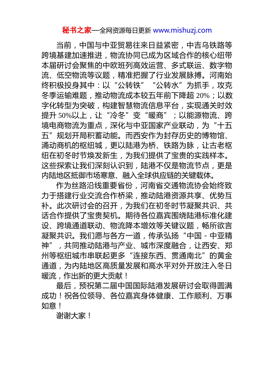秘书之家—全网资源每日更新 www.mishuzj.com在第二届中国国际陆港发展研讨会上的致辞尊敬的各位领导、各位嘉宾,丝路沿线业界同仁、朋友们:大家下午好!在这初冬清和、暖意融融的时节,我们齐聚十三朝古都西安,共同见证第二届中国国际陆港发展研讨会隆重召开。河南省交通物流协会作为本次研讨会的联合主办单位向远道而来的各位领导、嘉宾和业界同仁表示最热烈的欢迎!向给予本次研讨会悉心指导的中国物流与采购联合会中国物流学会,向发起单位陕西省物流学会、西安朝华管理科学研究院,以及联合主办的 23 个省市行业机构和相关单位,致以最衷心的感谢!“建港兴市,开发内陆”这一核心主题,深刻契合了新时代区域协调发展战略的内在要求,更与召开的“2025 中国-中亚物流协同发展大会”精神同频共振。从长安初冬的驼铃古道到西安今冬的陆港枢纽,从丝路商队的御寒行囊到中欧班列的恒温货箱,西安作为文明互鉴的千年驿站连接中外的丝路起点,正以“冬藏蓄力、向新而行”的姿态,为中国与中亚及“一带一路”沿线国家物流合作锚定方向。作为内陆经济大省和交通枢纽强省,河南与西安地缘相近、使命相通,始终以陆港建设为抓手激活开放新动能——郑州国际陆港“空中丝绸之路+陆上丝绸之路”双向联动,中欧班列(中豫号)寒冬不停运、全年不打烊,累计开行超 9000 列,覆盖 40 多个国家 140 多个城市;洛阳、新乡、商丘等区域陆港协同发力,形成“一核多极”格局让河南从“内陆腹地”跃升为开放“前沿高地”,生动诠释了“陆港兴则产业兴,产业兴则城市兴”的发展逻辑。秘书之家—全网资源每日更新 www.mishuzj.com当前,中国与中亚贸易往来日益紧密,中吉乌铁路等跨境基建加速推进,物流协同已成为区域合作的核心纽带本届研讨会聚焦的中欧班列高效运营、多式联运、数字物流、低空物流等议题,精准把握了行业发展脉搏。河南始终积极投身其中:以“公转铁”“公转水”为抓手,攻克冬季运输难题,推动物流成本较五年前下降超 20%;以数字化转型为突破,构建智慧物流信息平台,实现通关时效提升 50%以上,让“冷冬”变“暖商”;以能源物流、跨境电商物流为重点,深化与中亚国家产业联动,为“十五五”规划开局积蓄动能。而西安作为封存历史的博物馆、涌动商机的枢纽城,更以陆港为桥、铁路为脉,让古老枢纽在初冬时节焕发新生,为我们提供了宝贵的实践样本。这些探索让我们深刻认识到,陆港不仅是物流节点,更是内陆地区抵御市场寒意、融入全球供应链的关键载体。作为丝路沿线重要省份,河南省交通物流协会始终致力于搭建行业交流合作桥梁,推动陆港资源共享、优势互补。此次研讨会的召开,为我们在初冬时节凝聚共识、共话合作提供了宝贵契机。期待各位嘉宾围绕陆港标准化建设、跨境通道联动、物流降本增效等关键议题,畅所欲言凝聚共识。我们愿与各方一道,传承弘扬“中国-中亚精神”,共同推动陆港与产业、城市深度融合,让西安、郑州等枢纽城市串联起更多“连接东西、贯通南北”的黄金通道,为内陆地区高质量发展和高水平对外开放注入冬日暖流,作出新的更大贡献!最后,预祝第二届中国国际陆港发展研讨会取得圆满成功!祝各位领导、各位嘉宾身体健康、工作顺利、万事如意!谢谢大家!