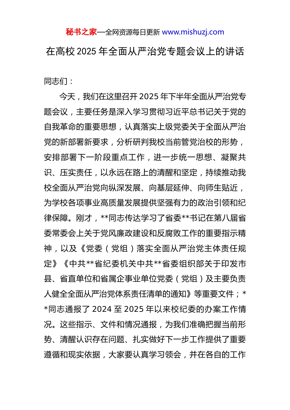 秘书之家—全网资源每日更新 www.mishuzj.com在高校 2025 年全面从严治党专题会议上的讲话 同志们:今天,我们在这里召开 2025 年下半年全面从严治党专题会议,主要任务是深入学习贯彻习近平总书记关于党的自我革命的重要思想,认真落实上级党委关于全面从严治党的新部署新要求,分析研判我校当前管党治校的形势,安排部署下一阶段重点工作,进一步统一思想、凝聚共识、压实责任,以永远在路上的清醒和坚定,持续推动我校全面从严治党向纵深发展、向基层延伸、向师生贴近,为学校各项事业高质量发展提供坚强有力的政治引领和纪律保障。刚才,**同志传达学习了省委**书记在第八届省委常委会上关于党风廉政建设和反腐败工作的重要指示精神,以及《党委(党组)落实全面从严治党主体责任规定》《中共**省纪委机关中共**省委组织部关于印发市县、省直单位和省属企事业单位党委(党组)及主要负责人健全全面从严治党体系责任清单的通知》等重要文件;**同志通报了 2024 至 2025 年以来校纪委的办案工作情况。这些指示、文件和情况通报,为我们准确把握当前形势、清醒认识存在问题、扎实做好下一步工作提供了重要遵循和现实依据,大家要认真学习领会,并在各自的工作秘书之家—全网资源每日更新 www.mishuzj.com中不折不扣地抓好贯彻落实。下面,我结合学校实际,讲三点意见。一、提高政治站位,深化思想认识,深刻领悟全面从严治党是引领保障学校事业发展的“定盘星”和“压舱石”党的十八大以来,以习近平同志为核心的党中央以前所未有的决心和力度推进全面从严治党,开辟了百年大党自我革命的新境界。习近平总书记关于党的自我革命的重要思想,为我们深入推进全面从严治党提供了根本遵循和行动指南。我们必须清醒地认识到,办好中国特色社会主义大学,必须旗帜鲜明地坚持和加强党的全面领导,必须坚定不移地推进全面从严治党。这既是重大政治原则,也是推动学校事业发展的根本保证。第一,深刻把握全面从严治党是落实立德树人根本任务的必然要求。为党育人、为国育才是我们高等学校的初心和使命。立德树人,关键在“德”,这个“德”不仅包括学生的品德,更首先要求我们教育者自身的政德、师德。一所大学的风气,直接影响着青年学生的价值观塑造。如果管党治党宽松软,校园风气不清正,各种歪风邪气滋生,我们如何培养出堪当民族复兴大任的时代新人?因此,我们必须把全面从严治党贯穿于办学治校、教书育人秘书之家—全网资源每日更新 www.mishuzj.com全过程,以风清气正的政治生态、廉洁高效的管理生态和潜心治学的学术生态,为学生成长成才营造一片纯净的蓝天。我们要通过从严治党,确保党的教育方针不折不扣地落到实处,确保社会主义办学方向坚定不移。第二,深刻把握全面从严治党是服务国家重大战略和区域发展的坚强保障。当前,我国正处在以中国式现代化全面推进中华民族伟大复兴的关键时期,**也正处在高质量建设**自贸港的攻坚阶段。作为地处**的高等学府,我校的发展与国家和区域的命运紧密相连。我们承担着为**自贸港建设培养高素质人才、提供智力支持和科技支撑的重要职责。要完成好这份时代赋予的答卷,离不开一个坚强有力的领导核心,离不开一支忠诚干净担当的干部队伍,离不开风清气正的干事创业环境。全面从严治党,就是要锻造这样一支队伍,营造这样的环境。只有把党建设得更加坚强有力,我们才能更好地凝聚全校师生的智慧和力量,心无旁骛地聚焦“国之大者”,精准对接**自贸港建设需求,在人才培养、科学研究、社会服务等方面展现新担当、实现新作为,真正将学校的发展融入国家和地方发展的宏伟蓝图。第三,深刻把握全面从严治党是推动学校自身高质量发展的内生动力。逆水行舟,不进则退。当前高等教育竞秘书之家—全网资源每日更新 www.mishuzj.com争日趋激烈,我校正处在爬坡过坎、转型升级的关键时期。要实现更高质量的发展,就必须破解前进道路上的各种难题,就必须向管理要效益、向改革要动力。全面从严治党,正是破解难题、激发动力的重要法宝。它能够帮助我们破除体制机制障碍,整治不担当、不作为、慢作为等顽瘴痼疾;它能够推动我们优化资源配...