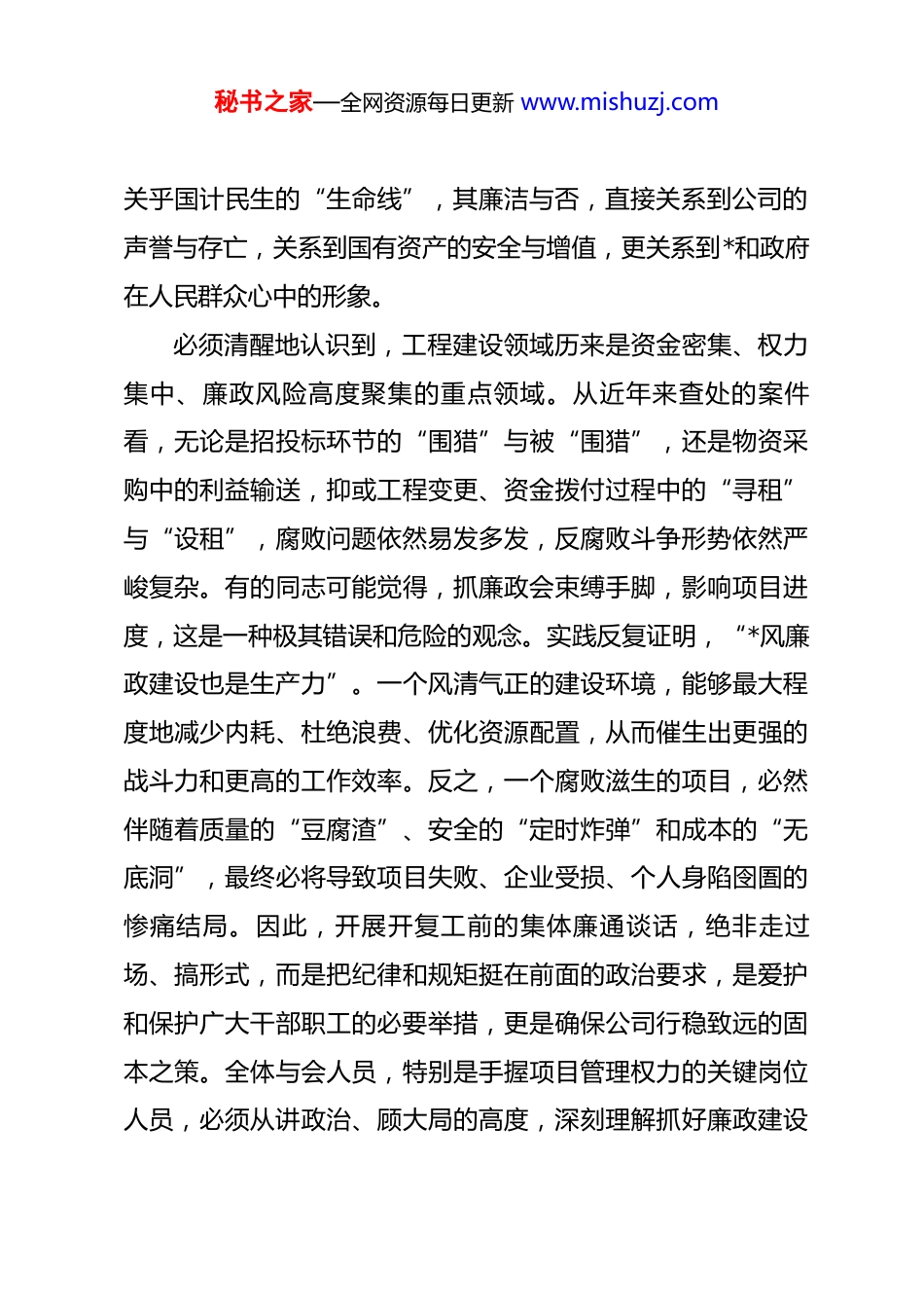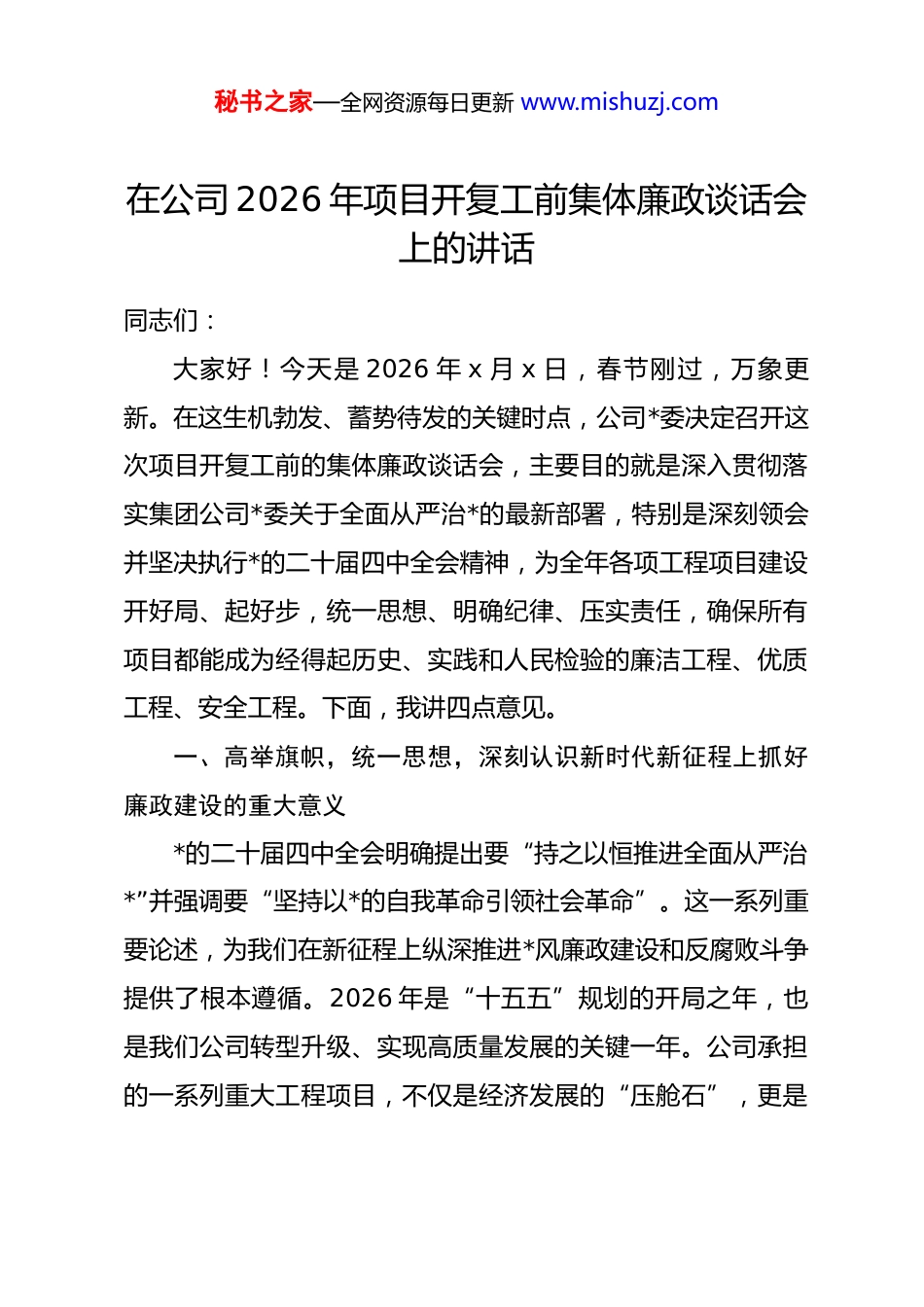 秘书之家—全网资源每日更新 www.mishuzj.com在公司 2026 年项目开复工前集体廉政谈话会上的讲话同志们:大家好!今天是 2026 年 x 月 x 日,春节刚过,万象更新。在这生机勃发、蓄势待发的关键时点,公司*委决定召开这次项目开复工前的集体廉政谈话会,主要目的就是深入贯彻落实集团公司*委关于全面从严治*的最新部署,特别是深刻领会并坚决执行*的二十届四中全会精神,为全年各项工程项目建设开好局、起好步,统一思想、明确纪律、压实责任,确保所有项目都能成为经得起历史、实践和人民检验的廉洁工程、优质工程、安全工程。下面,我讲四点意见。一、高举旗帜,统一思想,深刻认识新时代新征程上抓好廉政建设的重大意义*的二十届四中全会明确提出要“持之以恒推进全面从严治*”并强调要“坚持以*的自我革命引领社会革命”。这一系列重要论述,为我们在新征程上纵深推进*风廉政建设和反腐败斗争提供了根本遵循。2026 年是“十五五”规划的开局之年,也是我们公司转型升级、实现高质量发展的关键一年。公司承担的一系列重大工程项目,不仅是经济发展的“压舱石”,更是秘书之家—全网资源每日更新 www.mishuzj.com关乎国计民生的“生命线”,其廉洁与否,直接关系到公司的声誉与存亡,关系到国有资产的安全与增值,更关系到*和政府在人民群众心中的形象。必须清醒地认识到,工程建设领域历来是资金密集、权力集中、廉政风险高度聚集的重点领域。从近年来查处的案件看,无论是招投标环节的“围猎”与被“围猎”,还是物资采购中的利益输送,抑或工程变更、资金拨付过程中的“寻租”与“设租”,腐败问题依然易发多发,反腐败斗争形势依然严峻复杂。有的同志可能觉得,抓廉政会束缚手脚,影响项目进度,这是一种极其错误和危险的观念。实践反复证明,“*风廉政建设也是生产力”。一个风清气正的建设环境,能够最大程度地减少内耗、杜绝浪费、优化资源配置,从而催生出更强的战斗力和更高的工作效率。反之,一个腐败滋生的项目,必然伴随着质量的“豆腐渣”、安全的“定时炸弹”和成本的“无底洞”,最终必将导致项目失败、企业受损、个人身陷囹圄的惨痛结局。因此,开展开复工前的集体廉通谈话,绝非走过场、搞形式,而是把纪律和规矩挺在前面的政治要求,是爱护和保护广大干部职工的必要举措,更是确保公司行稳致远的固本之策。全体与会人员,特别是手握项目管理权力的关键岗位人员,必须从讲政治、顾大局的高度,深刻理解抓好廉政建设秘书之家—全网资源每日更新 www.mishuzj.com的极端重要性和现实紧迫性,切实把思想和行动统一到中央的决策部署和公司的具体要求上来。二、明确责任,固本培元,全面构筑拒腐防变的坚固防线*的二十届四中全会强调,要压实各级*组织全面从严治*政治责任。构筑坚固的廉政防线,核心在于责任体系的健全与落实。如果责任悬空,制度就会成为“稻草人”,监督就会沦为“橡皮筋”。第一,要全面压实“两个责任”。各项目*支部、临时*支部要坚决扛起主体责任,支部书记作为第一责任人,必须做到守土有责、守土尽责,将*风廉政建设与项目建设同谋划、同部署、同推进。要真正做到“抓业务必须抓廉政”,把廉洁要求贯穿于项目决策、执行、监督的全过程。班子成员要严格履行“一岗双责”,对自己分管领域内的*风廉政建设负领导责任,既要抓好工程进度、质量和安全,更要管好自己的人、看好自己的门,确保分管领域不出问题。纪检部门要聚焦主责主业,履行好监督责任,敢于较真碰硬,对发现的苗头性、倾向性问题早提醒、早纠正,对违规违纪行为坚决查处、绝不姑息。第二,要持续完善制度笼子。制度是防范风险的“防火墙”。必须对照国家法律法规和行业最新规范,结合公司实际,对现行的项目管理、招投标管理、物资采购、资金使用、秘书之家—全网资源每日更新 www.mishuzj.com合同管理等一系列制度进行全面梳理和评估。看看哪些制度已经过时,哪些存在漏洞,哪些在执行中走了样。要坚持问题导向,紧盯项目实施过程中的关键环节和廉政风险点加快建章立制、堵塞漏洞的步伐,形成一套覆盖全面、衔接紧密、执行有力的内控管理体系,真正做到用制度管权...