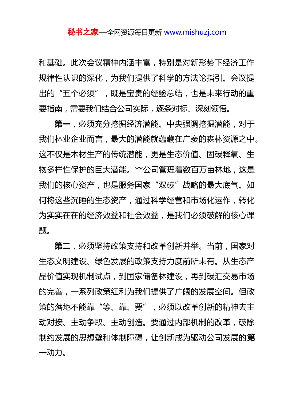 秘书之家—全网资源每日更新 www.mishuzj.com在公司学习贯彻中央经济工作会议精神专题部署会上的讲话 同志们:今天,我们召开这次党委扩大会议,主要任务是深入传达学习前不久闭幕的中央经济工作会议精神,结合公司发展的实际,研究部署我们下一阶段,特别是 2026 年全年的工作思路与具体举措。这次中央经济工作会议,是在全党全国深入学习贯彻党的二十届四中全会精神、全面推进中国式现代化建设的关键节点召开的一次重要会议。习近平总书记的重要讲话,高屋建瓴、思想深邃,全面总结了 2025 年的经济工作,深刻剖析了当前国内外经济形势,系统部署了 2026 年的经济工作重点,为我们做好明年乃至“十五五”时期的各项工作指明了前进方向、提供了根本遵循。公司上下必须将思想和行动迅速统一到总书记重要讲话精神上来,统一到党中央对经济形势的科学判断和重大决策部署上来,以高度的政治自觉和行动自觉,确保中央精神在**公司落地生根、开花结果。下面,我讲三个方面的意见。一、深刻领会会议精神,精准把握发展大势学深悟透中央经济工作会议精神,是做好一切工作的前提秘书之家—全网资源每日更新 www.mishuzj.com和基础。此次会议精神内涵丰富,特别是对新形势下经济工作规律性认识的深化,为我们提供了科学的方法论指引。会议提出的“五个必须”,既是宝贵的经验总结,也是未来行动的重要指南,需要我们结合公司实际,逐条对标、深刻领悟。第一,必须充分挖掘经济潜能。中央强调挖掘潜能,对于我们林业企业而言,最大的潜能就蕴藏在广袤的森林资源之中。这不仅是木材生产的传统潜能,更是生态价值、固碳释氧、生物多样性保护的巨大潜能。**公司管理着数百万亩林地,这是我们的核心资产,也是服务国家“双碳”战略的最大底气。如何将这些沉睡的生态资产,通过科学经营和市场化运作,转化为实实在在的经济效益和社会效益,是我们必须破解的核心课题。第二,必须坚持政策支持和改革创新并举。当前,国家对生态文明建设、绿色发展的政策支持力度前所未有。从生态产品价值实现机制试点,到国家储备林建设,再到碳汇交易市场的完善,一系列政策红利为我们提供了广阔的发展空间。但政策的落地不能靠“等、靠、要”,必须以改革创新的精神去主动对接、主动争取、主动创造。要通过内部机制的改革,破除制约发展的思想壁和体制障碍,让创新成为驱动公司发展的第一动力。秘书之家—全网资源每日更新 www.mishuzj.com第三,必须做到既“放得活”又“管得好”。这体现了辩证思维和系统观念。对于公司而言,就是要处理好集团总部与各权属单位之间的关系。要深化扁平化管理模式改革,给予基层单位更多经营自主权,鼓励他们放开手脚、大胆尝试,在市场竞争中激发活力。同时,放活绝不等于放任。总部的穿透式监管必须同步加强,在战略方向、重大投资、财务风控、安全生产等关键领域要“管得住、管得好”,确保企业在健康轨道上行稳致远。第四,必须坚持投资于物和投资于人紧密结合。林业是长周期产业,既需要对林地、设备、基础设施等有形资产的持续投入,更需要对人才这一最宝贵的无形资产进行长期投资。先进的装备可以购买,但高素质的林业科技人才、经营管理人才、复合型技能人才队伍,必须依靠我们自己来培养。要建立健全人才引进、培养、使用、激励的长效机制,让想干事、能干事、干成事的人才有舞台、有回报、有发展。第五,必须以苦练内功来应对外部挑战。当前,国内外环境复杂多变,市场竟争日趋激烈。应对外部不确定性的最好办法,就是做好自己的事,把内部功底练扎实。要持续推进精细化管理,向管理要效益;要加强核心技术攻关,向科技要动力;要优化产业结构,向市场要空间。只有内功深厚,才能在风浪秘书之家—全网资源每日更新 www.mishuzj.com中站稳脚跟,牢牢把握发展的主动权。二、回顾过往知得失,筑牢高质量发展根基2025 年是“十四五”规划的收官之年,面对复杂严峻的外部环境和艰巨繁重的改革发展任务,公司全体干部职工迎难而上、砥砺奋进,各项工作取得了来之不易的成绩。在森林经营方面,全年完成高质量造林与更新改造超过 30 万亩,森林蓄积量稳步提升,核...