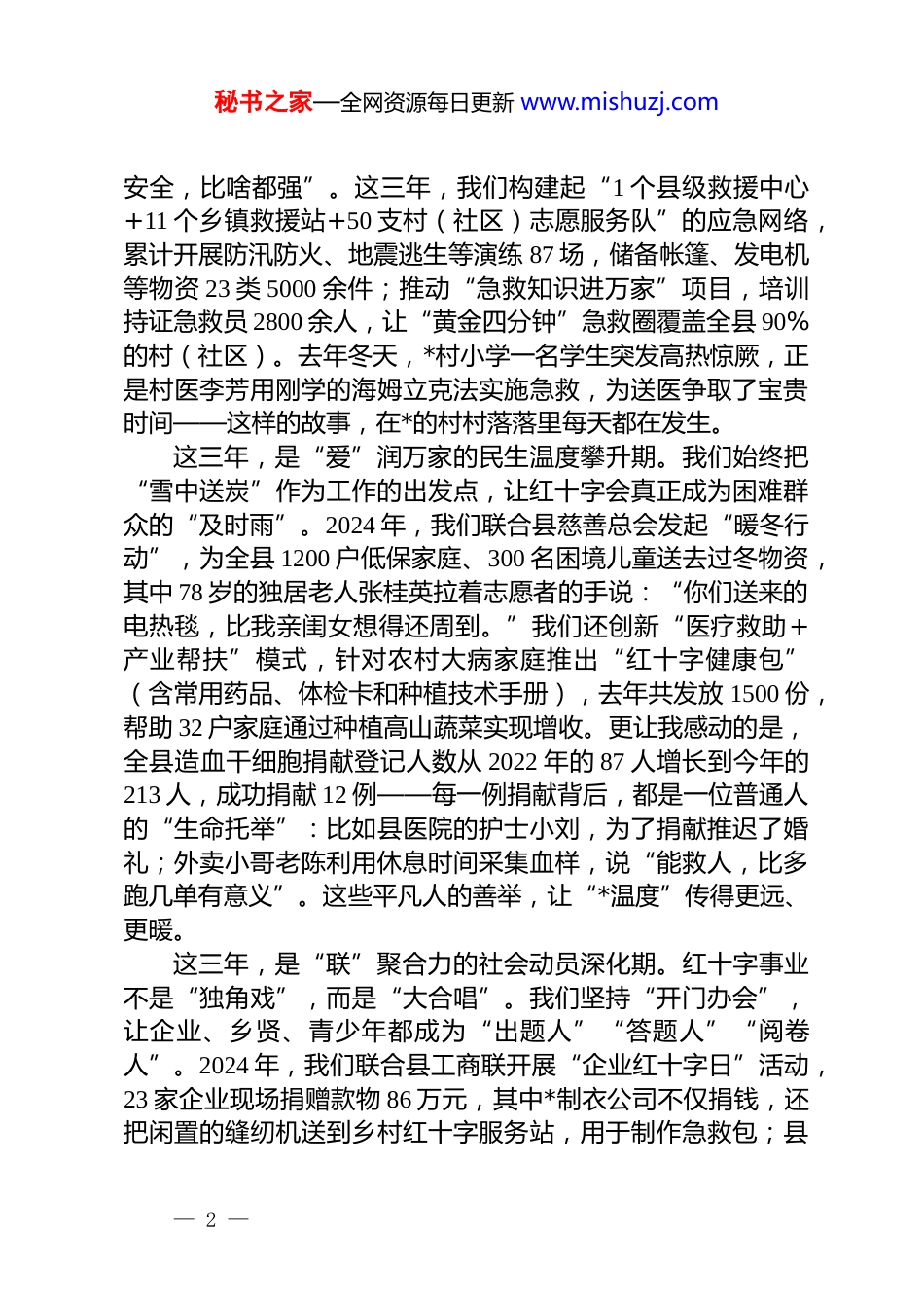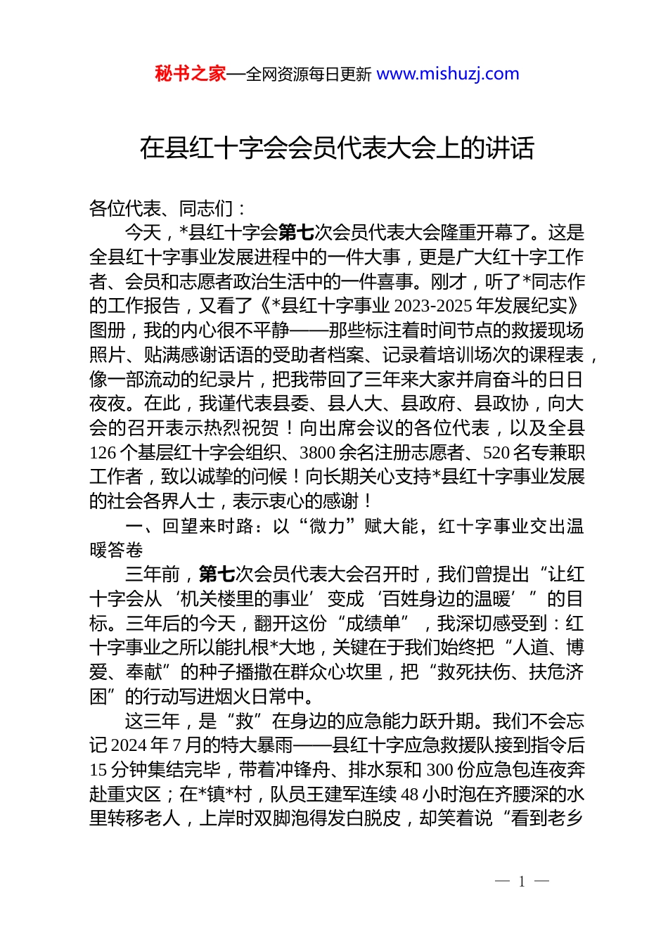 秘书之家—全网资源每日更新 www.mishuzj.com在县红十字会会员代表大会上的讲话各位代表、同志们:今天,*县红十字会第七次会员代表大会隆重开幕了。这是全县红十字事业发展进程中的一件大事,更是广大红十字工作者、会员和志愿者政治生活中的一件喜事。刚才,听了*同志作的工作报告,又看了《*县红十字事业 2023-2025 年发展纪实》图册,我的内心很不平静——那些标注着时间节点的救援现场照片、贴满感谢话语的受助者档案、记录着培训场次的课程表,像一部流动的纪录片,把我带回了三年来大家并肩奋斗的日日夜夜。在此,我谨代表县委、县人大、县政府、县政协,向大会的召开表示热烈祝贺!向出席会议的各位代表,以及全县126 个基层红十字会组织、3800 余名注册志愿者、520 名专兼职工作者,致以诚挚的问候!向长期关心支持*县红十字事业发展的社会各界人士,表示衷心的感谢!一、回望来时路:以“微力”赋大能,红十字事业交出温暖答卷三年前,第七次会员代表大会召开时,我们曾提出“让红十字会从‘机关楼里的事业’变成‘百姓身边的温暖’”的目标。三年后的今天,翻开这份“成绩单”,我深切感受到:红十字事业之所以能扎根*大地,关键在于我们始终把“人道、博爱、奉献”的种子播撒在群众心坎里,把“救死扶伤、扶危济困”的行动写进烟火日常中。这三年,是“救”在身边的应急能力跃升期。我们不会忘记 2024 年 7 月的特大暴雨——县红十字应急救援队接到指令后15 分钟集结完毕,带着冲锋舟、排水泵和 300 份应急包连夜奔赴重灾区;在*镇*村,队员王建军连续 48 小时泡在齐腰深的水里转移老人,上岸时双脚泡得发白脱皮,却笑着说“看到老乡— 1 —秘书之家—全网资源每日更新 www.mishuzj.com安全,比啥都强”。这三年,我们构建起“1 个县级救援中心+11 个乡镇救援站+50 支村(社区)志愿服务队”的应急网络,累计开展防汛防火、地震逃生等演练 87 场,储备帐篷、发电机等物资 23 类 5000 余件;推动“急救知识进万家”项目,培训持证急救员 2800 余人,让“黄金四分钟”急救圈覆盖全县 90%的村(社区)。去年冬天,*村小学一名学生突发高热惊厥,正是村医李芳用刚学的海姆立克法实施急救,为送医争取了宝贵时间——这样的故事,在*的村村落落里每天都在发生。这三年,是“爱”润万家的民生温度攀升期。我们始终把“雪中送炭”作为工作的出发点,让红十字会真正成为困难群众的“及时雨”。2024 年,我们联合县慈善总会发起“暖冬行动”,为全县 1200 户低保家庭、300 名困境儿童送去过冬物资,其中 78 岁的独居老人张桂英拉着志愿者的手说:“你们送来的电热毯,比我亲闺女想得还周到。”我们还创新“医疗救助+产业帮扶”模式,针对农村大病家庭推出“红十字健康包”(含常用药品、体检卡和种植技术手册),去年共发放 1500 份,帮助 32 户家庭通过种植高山蔬菜实现增收。更让我感动的是,全县造血干细胞捐献登记人数从 2022 年的 87 人增长到今年的213 人,成功捐献 12 例——每一例捐献背后,都是一位普通人的“生命托举”:比如县医院的护士小刘,为了捐献推迟了婚礼;外卖小哥老陈利用休息时间采集血样,说“能救人,比多跑几单有意义”。这些平凡人的善举,让“*温度”传得更远、更暖。这三年,是“联”聚合力的社会动员深化期。红十字事业不是“独角戏”,而是“大合唱”。我们坚持“开门办会”,让企业、乡贤、青少年都成为“出题人”“答题人”“阅卷人”。2024 年,我们联合县工商联开展“企业红十字日”活动,23 家企业现场捐赠款物 86 万元,其中*制衣公司不仅捐钱,还把闲置的缝纫机送到乡村红十字服务站,用于制作急救包;县— 2 —秘书之家—全网资源每日更新 www.mishuzj.com实验中学把红十字课纳入校本课程,孩子们自己设计的“校园急救漫画手册”被省红十字会收录推广;我们还培育了“红领巾志愿者”“银龄互助队”等特色队伍,其中“五老”志愿者李奶奶牵头成立的“隔代关爱小组”,三年来陪伴照顾留守儿童 400 余人次——这些创新实践,让红十字会从“小众公益”变成了“全民行动”。同志们,...