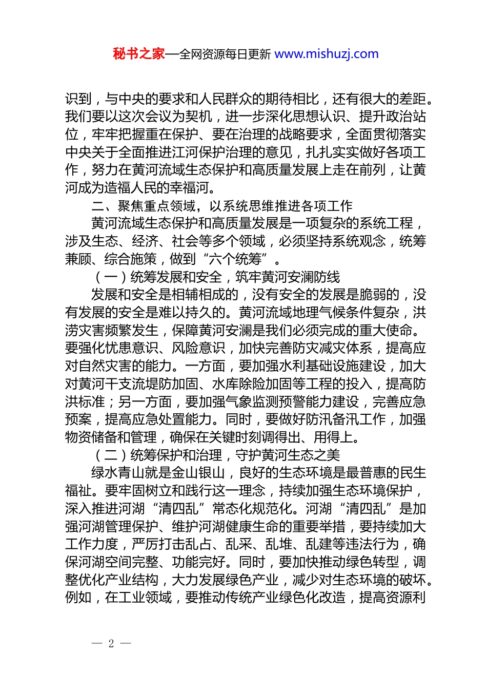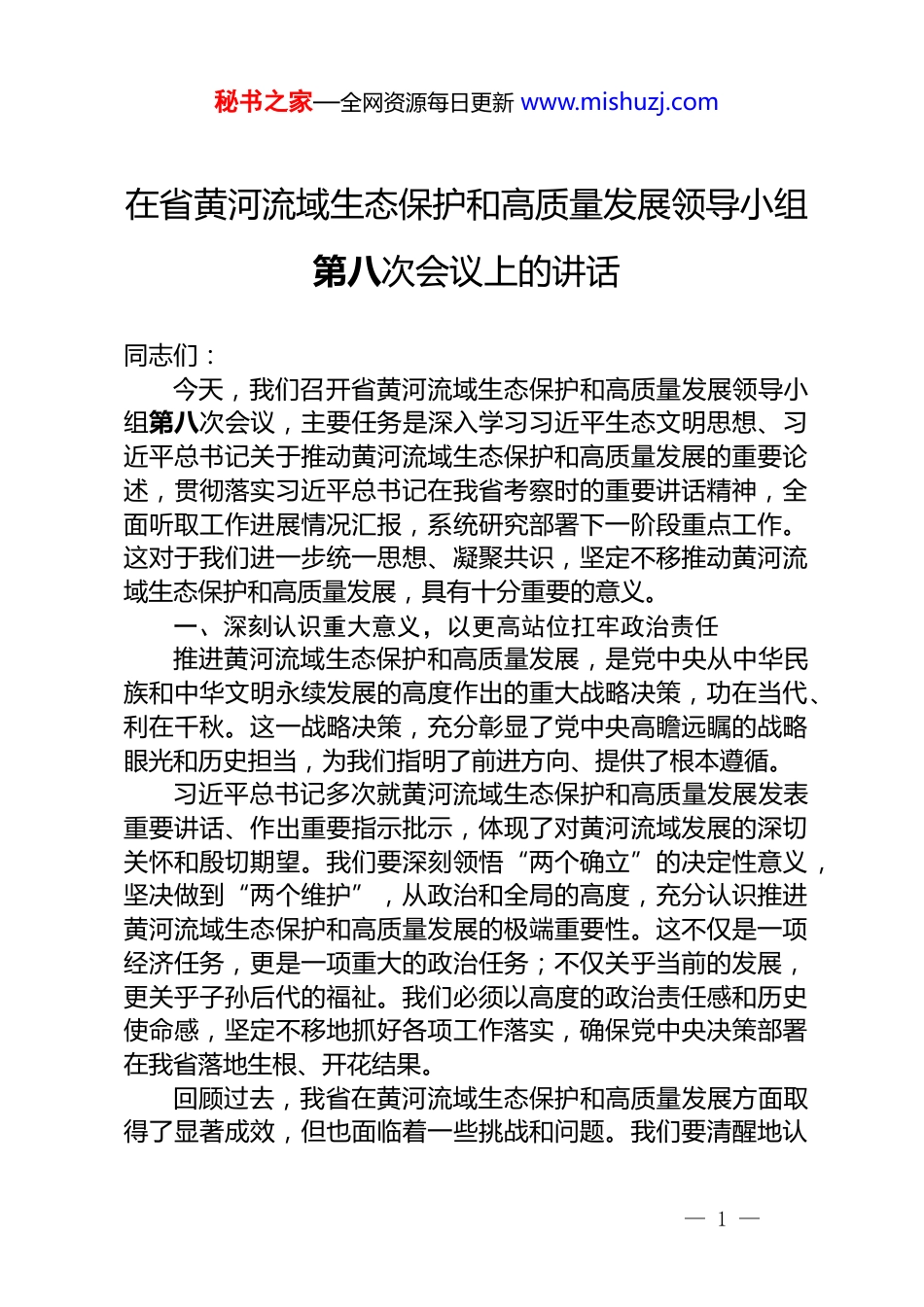 秘书之家—全网资源每日更新 www.mishuzj.com在省黄河流域生态保护和高质量发展领导小组第八次会议上的讲话同志们:今天,我们召开省黄河流域生态保护和高质量发展领导小组第八次会议,主要任务是深入学习习近平生态文明思想、习近平总书记关于推动黄河流域生态保护和高质量发展的重要论述,贯彻落实习近平总书记在我省考察时的重要讲话精神,全面听取工作进展情况汇报,系统研究部署下一阶段重点工作。这对于我们进一步统一思想、凝聚共识,坚定不移推动黄河流域生态保护和高质量发展,具有十分重要的意义。一、深刻认识重大意义,以更高站位扛牢政治责任推进黄河流域生态保护和高质量发展,是党中央从中华民族和中华文明永续发展的高度作出的重大战略决策,功在当代、利在千秋。这一战略决策,充分彰显了党中央高瞻远瞩的战略眼光和历史担当,为我们指明了前进方向、提供了根本遵循。习近平总书记多次就黄河流域生态保护和高质量发展发表重要讲话、作出重要指示批示,体现了对黄河流域发展的深切关怀和殷切期望。我们要深刻领悟“两个确立”的决定性意义,坚决做到“两个维护”,从政治和全局的高度,充分认识推进黄河流域生态保护和高质量发展的极端重要性。这不仅是一项经济任务,更是一项重大的政治任务;不仅关乎当前的发展,更关乎子孙后代的福祉。我们必须以高度的政治责任感和历史使命感,坚定不移地抓好各项工作落实,确保党中央决策部署在我省落地生根、开花结果。回顾过去,我省在黄河流域生态保护和高质量发展方面取得了显著成效,但也面临着一些挑战和问题。我们要清醒地认— 1 —秘书之家—全网资源每日更新 www.mishuzj.com识到,与中央的要求和人民群众的期待相比,还有很大的差距。我们要以这次会议为契机,进一步深化思想认识、提升政治站位,牢牢把握重在保护、要在治理的战略要求,全面贯彻落实中央关于全面推进江河保护治理的意见,扎扎实实做好各项工作,努力在黄河流域生态保护和高质量发展上走在前列,让黄河成为造福人民的幸福河。二、聚焦重点领域,以系统思维推进各项工作黄河流域生态保护和高质量发展是一项复杂的系统工程,涉及生态、经济、社会等多个领域,必须坚持系统观念,统筹兼顾、综合施策,做到“六个统筹”。(一)统筹发展和安全,筑牢黄河安澜防线发展和安全是相辅相成的,没有安全的发展是脆弱的,没有发展的安全是难以持久的。黄河流域地理气候条件复杂,洪涝灾害频繁发生,保障黄河安澜是我们必须完成的重大使命。要强化忧患意识、风险意识,加快完善防灾减灾体系,提高应对自然灾害的能力。一方面,要加强水利基础设施建设,加大对黄河干支流堤防加固、水库除险加固等工程的投入,提高防洪标准;另一方面,要加强气象监测预警能力建设,完善应急预案,提高应急处置能力。同时,要做好防汛备汛工作,加强物资储备和管理,确保在关键时刻调得出、用得上。(二)统筹保护和治理,守护黄河生态之美绿水青山就是金山银山,良好的生态环境是最普惠的民生福祉。要牢固树立和践行这一理念,持续加强生态环境保护,深入推进河湖“清四乱”常态化规范化。河湖“清四乱”是加强河湖管理保护、维护河湖健康生命的重要举措,要持续加大工作力度,严厉打击乱占、乱采、乱堆、乱建等违法行为,确保河湖空间完整、功能完好。同时,要加快推动绿色转型,调整优化产业结构,大力发展绿色产业,减少对生态环境的破坏。例如,在工业领域,要推动传统产业绿色化改造,提高资源利— 2 —秘书之家—全网资源每日更新 www.mishuzj.com用效率,降低污染物排放;在农业领域,要推广生态农业模式,减少化肥农药使用量,保护土壤和水源。(三)统筹节水和用水,优化水资源配置水是生命之源、生产之要、生态之基。黄河流域水资源短缺,是制约经济社会发展的关键因素。要全方位贯彻“四水四定”原则,即以水定城、以水定地、以水定人、以水定产,加强重点领域节水,优化水资源配置。在农业方面,要推广节水灌溉技术,提高农业用水效率;在工业方面,要加强工业用水管理,鼓励企业采用节水工艺和设备;在城市方面,要加强城市供水管网改造,减少漏损。同时,...