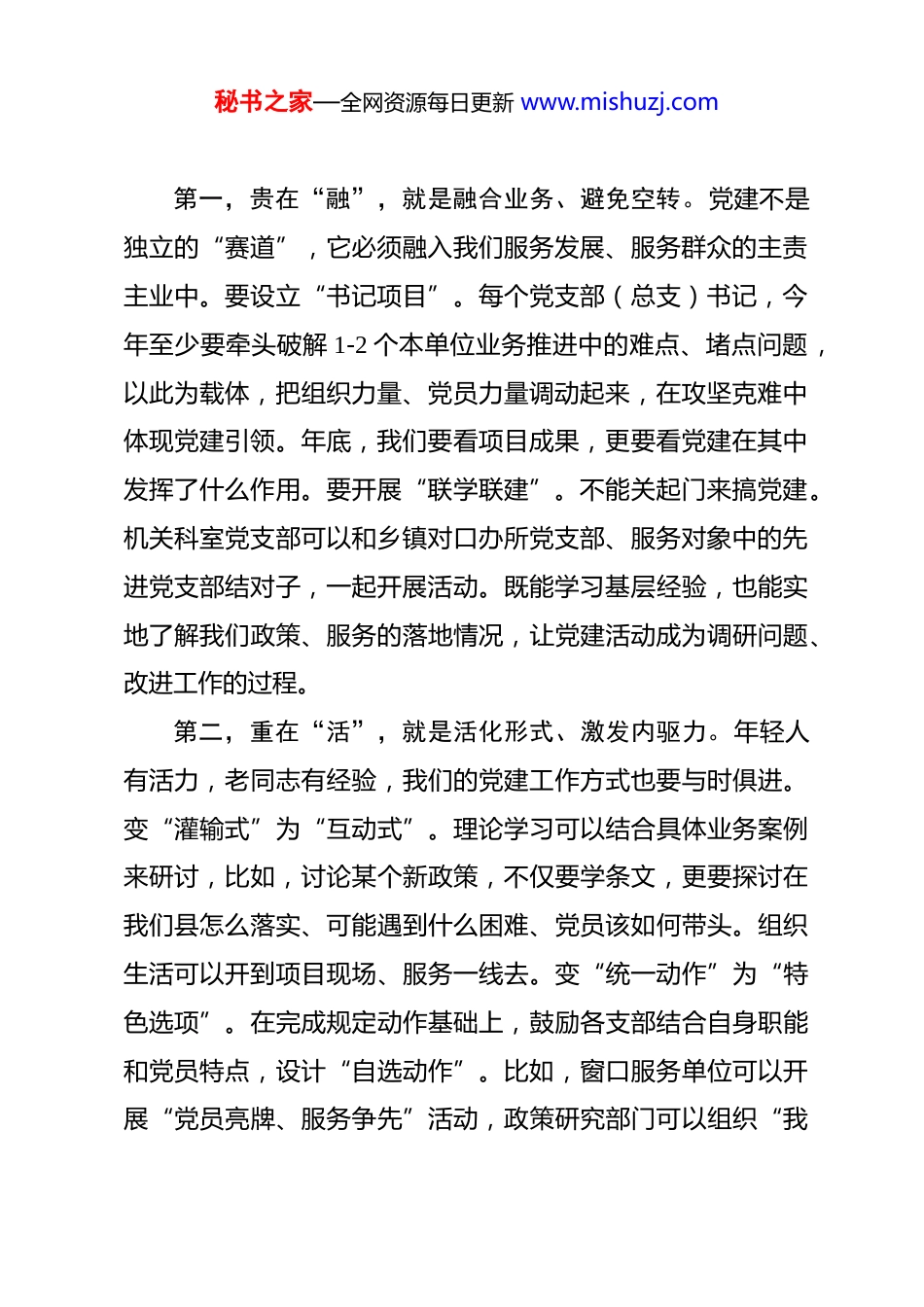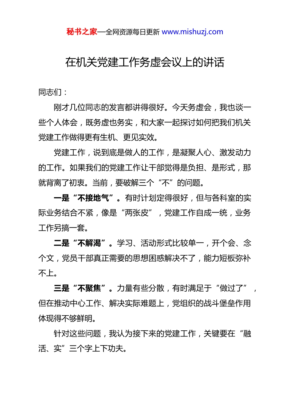 秘书之家—全网资源每日更新 www.mishuzj.com在机关党建工作务虚会议上的讲话同志们:刚才几位同志的发言都讲得很好。今天务虚会,我也谈一些个人体会,既务虚也务实,和大家一起探讨如何把我们机关党建工作做得更有生机、更见实效。党建工作,说到底是做人的工作,是凝聚人心、激发动力的工作。如果我们的党建工作让干部觉得是负担、是形式,那就背离了初衷。当前,要破解三个“不”的问题。一是“不接地气”。有时计划定得很好,但与各科室的实际业务结合不紧,像是“两张皮”,党建工作自成一统,业务工作另搞一套。二是“不解渴”。学习、活动形式比较单一,开个会、念个文,党员干部真正需要的思想困惑解决不了,能力短板弥补不上。三是“不聚焦”。力量有些分散,有时满足于“做过了”,但在推动中心工作、解决实际难题上,党组织的战斗堡垒作用体现得不够鲜明。针对这些问题,我认为接下来的党建工作,关键要在“融活、实”三个字上下功夫。秘书之家—全网资源每日更新 www.mishuzj.com第一,贵在“融”,就是融合业务、避免空转。党建不是独立的“赛道”,它必须融入我们服务发展、服务群众的主责主业中。要设立“书记项目”。每个党支部(总支)书记,今年至少要牵头破解 1-2 个本单位业务推进中的难点、堵点问题,以此为载体,把组织力量、党员力量调动起来,在攻坚克难中体现党建引领。年底,我们要看项目成果,更要看党建在其中发挥了什么作用。要开展“联学联建”。不能关起门来搞党建。机关科室党支部可以和乡镇对口办所党支部、服务对象中的先进党支部结对子,一起开展活动。既能学习基层经验,也能实地了解我们政策、服务的落地情况,让党建活动成为调研问题、改进工作的过程。第二,重在“活”,就是活化形式、激发内驱力。年轻人有活力,老同志有经验,我们的党建工作方式也要与时俱进。变“灌输式”为“互动式”。理论学习可以结合具体业务案例来研讨,比如,讨论某个新政策,不仅要学条文,更要探讨在我们县怎么落实、可能遇到什么困难、党员该如何带头。组织生活可以开到项目现场、服务一线去。变“统一动作”为“特色选项”。在完成规定动作基础上,鼓励各支部结合自身职能和党员特点,设计“自选动作”。比如,窗口服务单位可以开展“党员亮牌、服务争先”活动,政策研究部门可以组织“我秘书之家—全网资源每日更新 www.mishuzj.com为发展献一策”专题研讨。让支部有空间,活动才有活力。第三,成在“实”,就是务实管用、见到效果。党建工作的成效,最终要看是否推动了工作、改进了作风、凝聚了人心。建立“效果回溯”机制。开展一项重要的党建活动或学习教育后,不能简单写个总结就完了。过一两个月,要回头看看,活动中提出的思路、凝聚的共识、明确的整改措施,有没有真正落实到工作中?干部的思想状态、工作作风有没有积极变化?做实“关心关爱”。党建工作既要教育人、引导人,也要关心人、温暖人。要关注党员干部的思想动态和实际困难,建立健全谈心谈话制度。特别是对工作中遇到挫折、生活上有困难的同志,组织上要及时伸出援手,让每一位同志都能感受到组织的温暖和依靠,这样才能真正凝聚人心。同志们,党建工作就像春风化雨,看起来不是“显绩”,但却是强基固本、滋养生态的根本。它不可能立竿见影,但必须持之以恒;它需要规范严谨,但更需充满温度。希望大家都能把党建责任记在心上、扛在肩上,共同把我们机关的党组织建设得更加坚强有力,让每一名党员都成为一面鲜红的旗帜,为推动全县高质量发展贡献我们应有的力量。我就讲这些,谢谢大家。
