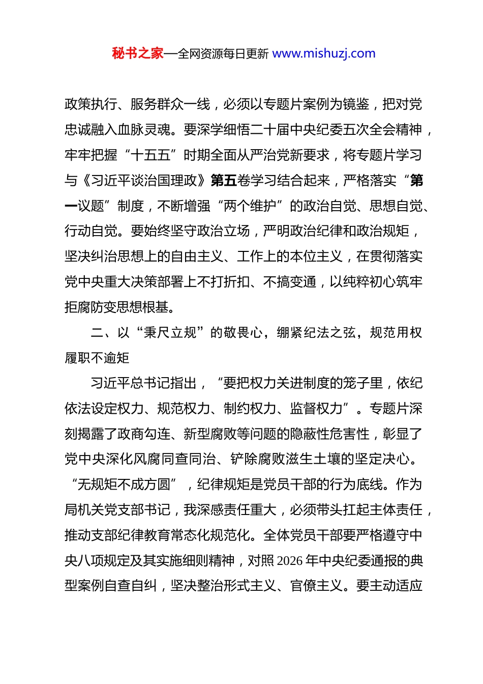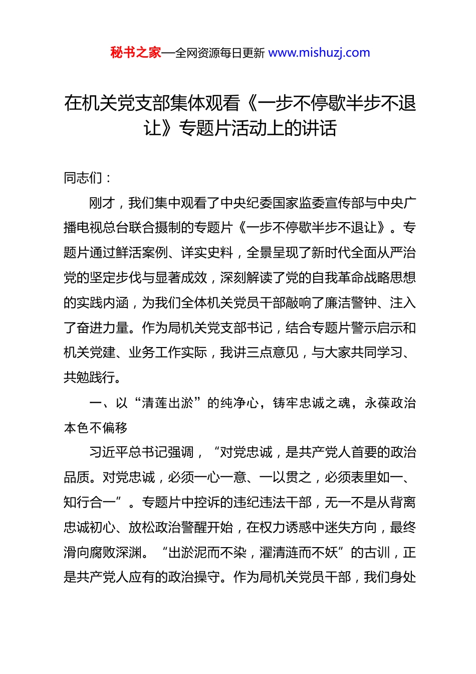 秘书之家—全网资源每日更新 www.mishuzj.com在机关党支部集体观看《一步不停歇半步不退让》专题片活动上的讲话 同志们:刚才,我们集中观看了中央纪委国家监委宣传部与中央广播电视总台联合摄制的专题片《一步不停歇半步不退让》。专题片通过鲜活案例、详实史料,全景呈现了新时代全面从严治党的坚定步伐与显著成效,深刻解读了党的自我革命战略思想的实践内涵,为我们全体机关党员干部敲响了廉洁警钟、注入了奋进力量。作为局机关党支部书记,结合专题片警示启示和机关党建、业务工作实际,我讲三点意见,与大家共同学习、共勉践行。一、以“清莲出淤”的纯净心,铸牢忠诚之魂,永葆政治本色不偏移习近平总书记强调,“对党忠诚,是共产党人首要的政治品质。对党忠诚,必须一心一意、一以贯之,必须表里如一、知行合一”。专题片中控诉的违纪违法干部,无一不是从背离忠诚初心、放松政治警醒开始,在权力诱惑中迷失方向,最终滑向腐败深渊。“出淤泥而不染,濯清涟而不妖”的古训,正是共产党人应有的政治操守。作为局机关党员干部,我们身处秘书之家—全网资源每日更新 www.mishuzj.com政策执行、服务群众一线,必须以专题片案例为镜鉴,把对党忠诚融入血脉灵魂。要深学细悟二十届中央纪委五次全会精神,牢牢把握“十五五”时期全面从严治党新要求,将专题片学习与《习近平谈治国理政》第五卷学习结合起来,严格落实“第一议题”制度,不断增强“两个维护”的政治自觉、思想自觉、行动自觉。要始终坚守政治立场,严明政治纪律和政治规矩,坚决纠治思想上的自由主义、工作上的本位主义,在贯彻落实党中央重大决策部署上不打折扣、不搞变通,以纯粹初心筑牢拒腐防变思想根基。二、以“秉尺立规”的敬畏心,绷紧纪法之弦,规范用权履职不逾矩习近平总书记指出,“要把权力关进制度的笼子里,依纪依法设定权力、规范权力、制约权力、监督权力”。专题片深刻揭露了政商勾连、新型腐败等问题的隐蔽性危害性,彰显了党中央深化风腐同查同治、铲除腐败滋生土壤的坚定决心。“无规矩不成方圆”,纪律规矩是党员干部的行为底线。作为局机关党支部书记,我深感责任重大,必须带头扛起主体责任,推动支部纪律教育常态化规范化。全体党员干部要严格遵守中央八项规定及其实施细则精神,对照 2026 年中央纪委通报的典型案例自查自纠,坚决整治形式主义、官僚主义。要主动适应秘书之家—全网资源每日更新 www.mishuzj.com纪检监察工作规范化法治化正规化要求,严格执行机关内控管理制度,在项目审批、资金监管、执法执纪等关键环节,坚持按制度办事、按程序履职,主动接受监督,坚决抵制“围猎”诱惑。支部将持续完善监督机制,把严的基调贯穿工作全程,引导大家心有所畏、言有所戒、行有所止,让依规用权、廉洁履职成为行动自觉。三、以“笃行不怠”的实干心,扛起担当之责,服务发展大局不停步习近平总书记强调,“要坚持真抓实干、狠抓落实,一切工作都要往实里走、做出经得起实践、人民、历史检验的实绩”。专题片展现的纪检监察干部“一步不停歇、半步不退让”的奋斗姿态,正是实干担当精神的生动诠释。当前,我们正处在“十五五”开局起步的关键阶段,推动新质生产力发展、服务地方高质量发展,需要全体党员干部以实干作答。“道虽迩,不行不至”,我们要把专题片学习成果转化为履职尽责的实际行动,聚焦主责主业,对照党中央战略部署和省市工作要求,梳理工作短板、细化落实举措,着力解决不担当、不作为、乱作为等问题。要深入践行以人民为中心的发展思想,深化“我为群众办实事”实践活动,聚焦群众急难愁盼问题,精准发力、靶向施策,以务实举措增强群众获得感。要推动党建与秘书之家—全网资源每日更新 www.mishuzj.com业务深度融合,把廉洁自律与担当作为有机统一,在严守纪律规矩的前提下奋勇争先,以“时时放心不下”的责任感,为推动中国式现代化建设贡献机关力量。同志们,全面从严治党永远在路上,党的自我革命永远在路上。专题片的警示仍在耳畔,奋斗的号角已然吹响。让我们以此次观看学习为契机,牢记初心使命、严守纪法底线、勇于担当实干,以“永远吹冲锋号”的姿态...