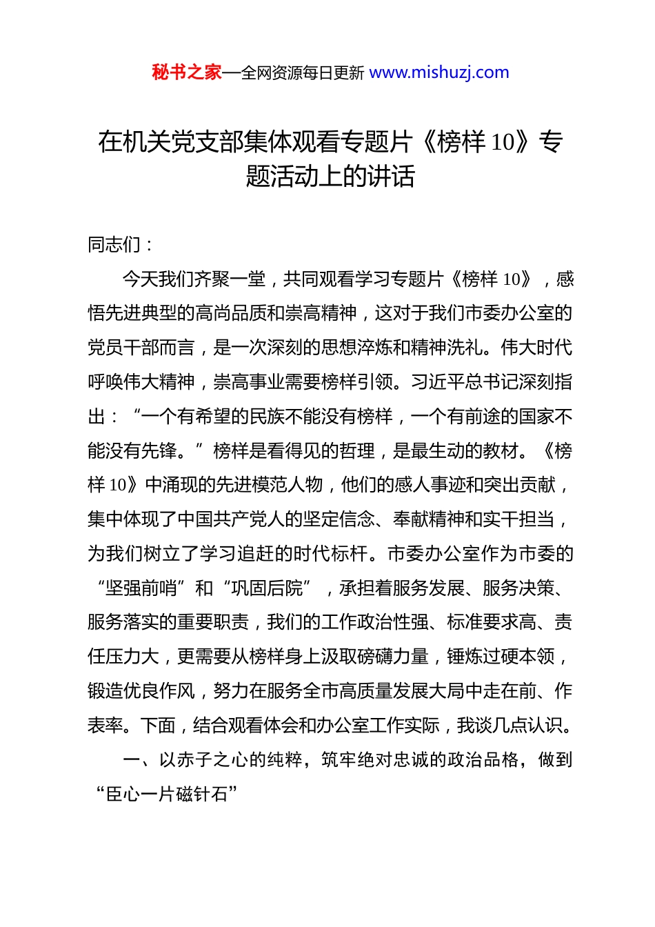 秘书之家—全网资源每日更新 www.mishuzj.com在机关党支部集体观看专题片《榜样 10》专题活动上的讲话 同志们:今天我们齐聚一堂,共同观看学习专题片《榜样 10》,感悟先进典型的高尚品质和崇高精神,这对于我们市委办公室的党员干部而言,是一次深刻的思想淬炼和精神洗礼。伟大时代呼唤伟大精神,崇高事业需要榜样引领。习近平总书记深刻指出:“一个有希望的民族不能没有榜样,一个有前途的国家不能没有先锋。”榜样是看得见的哲理,是最生动的教材。《榜样 10》中涌现的先进模范人物,他们的感人事迹和突出贡献,集中体现了中国共产党人的坚定信念、奉献精神和实干担当,为我们树立了学习追赶的时代标杆。市委办公室作为市委的“坚强前哨”和“巩固后院”,承担着服务发展、服务决策、服务落实的重要职责,我们的工作政治性强、标准要求高、责任压力大,更需要从榜样身上汲取磅礴力量,锤炼过硬本领,锻造优良作风,努力在服务全市高质量发展大局中走在前、作表率。下面,结合观看体会和办公室工作实际,我谈几点认识。一、以赤子之心的纯粹,筑牢绝对忠诚的政治品格,做到“臣心一片磁针石”秘书之家—全网资源每日更新 www.mishuzj.com习近平总书记强调:“对党忠诚,是共产党人首要的政治品质。”对党绝对忠诚是市委办公室的生命线,是做好一切工作的根本点。《榜样 10》中的英模人物,无不是用毕生奋斗乃至生命诠释了对党和人民的无限忠诚。他们信念如磐,在各自岗位上矢志不渝、攻坚克难,生动展现了“虽九死其犹未悔”的忠诚本色。对照榜样,我们办公室干部必须把旗帜鲜明讲政治摆在首位,持续深化对新时代党的创新理论的学习领悟,深刻把握其核心要义、精神实质、丰富内涵和实践要求,不断提高政治判断力、政治领悟力、政治执行力。要始终胸怀“两个大局”,心系“国之大者”,自觉将办公室工作置于全市发展全局中去思考、去定位、去推进,确保在思想上政治上行动上同党中央保持高度一致,确保市委各项决策部署在我们这里得到不折不扣的贯彻执行。要把忠诚体现在具体行动上,无论是起草文稿、协调事务、督查落实,还是信息报送、机要保密、后勤保障,都要坚持最高标准、最严要求,做到一丝不苟、精益求精,确保“文经我手无差错、事交我办请放心”,以极端负责的态度当好市委的“千里眼”“顺风耳”和“左右手”。当前,要紧密结合学习贯彻党的二十大精神及市委最新工作部署,将忠诚融入血脉、见诸行动,转化为推动“三服务”事业高质量发展的实际成效。秘书之家—全网资源每日更新 www.mishuzj.com二、以精卫填海的执着,锤炼担当作为的过硬本领,践行“绝知此事要躬行”“社会主义是干出来的,新时代是奋斗出来的。”总书记的殷殷嘱托,激励我们勇毅前行。《榜样 10》中的先进典型,无一不是在本职岗位上担当实干、奋发有为的典范。他们面对困难不退缩,面对挑战不回避,以“功成不必在我”的精神境界和“功成必定有我”的历史担当,在平凡的岗位上创造了不平凡的业绩。作为市委办公室的干部,我们身处枢纽,责任重大,必须深刻认识到,我们的工作成效直接关系到市委决策部署的落地生根。学习榜样,就是要学习他们那种求真务实、埋头苦干的作风,学习他们那种攻坚克难、勇于创新的锐气。要大兴调查研究之风,深入基层、深入群众、深入实际,摸清真实情况,找准问题症结,提出切实可行的对策建议,努力成为服务市委科学决策的“智囊团”。要聚焦全市中心工作和重点任务,特别是要围绕市委提出的贯彻新发展理念、构建新发展格局、推动高质量发展等一系列战略部署,以及优化营商环境、推进科技创新、增进民生福祉等具体工作,主动靠前服务,加强统筹协调,强化督查问效,打通政策落实的“最后一公里”。要不断锤炼履职能力,既要提升办文办会办事等基本功,也要增强把握宏观、分析研判、应急处突等综合能力,努力成为提笔秘书之家—全网资源每日更新 www.mishuzj.com能写、开口能讲、问策能对、遇事能办的行家里手,切实担负起新时代赋予办公室干部的光荣使命。三、以白圭无玷的坚守,永葆清正廉洁的公仆本色,涵养“要留清白在人间”“廉洁奉公,是保持党的先...