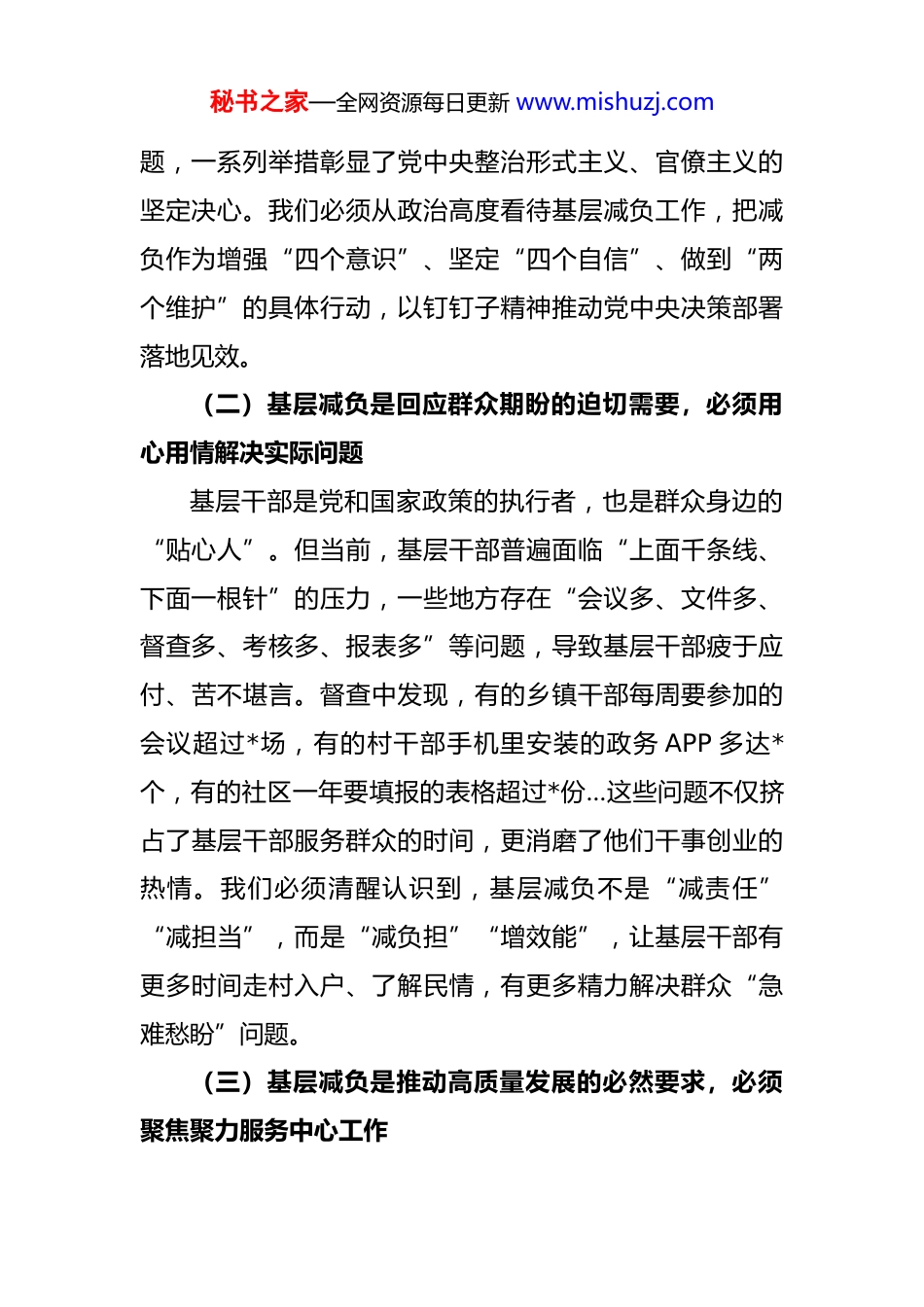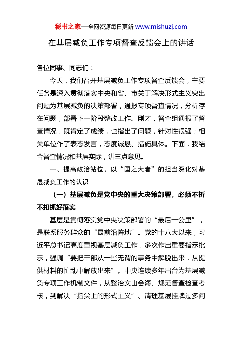 秘书之家—全网资源每日更新 www.mishuzj.com在基层减负工作专项督查反馈会上的讲话 各位同事、同志们:今天,我们召开基层减负工作专项督查反馈会,主要任务是深入贯彻落实中央和省、市关于解决形式主义突出问题为基层减负的决策部署,通报专项督查情况,分析存在问题,部署下一阶段整改工作。刚才,督查组通报了督查情况,既肯定了成绩,也指出了问题,针对性很强;相关单位作了表态发言,态度诚恳、措施具体。下面,我结合督查情况和基层实际,讲三点意见。一、提高政治站位,以“国之大者”的担当深化对基层减负工作的认识(一)基层减负是党中央的重大决策部署,必须不折不扣抓好落实基层是贯彻落实党中央决策部署的“最后一公里”,是联系服务群众的“最前沿阵地”。党的十八大以来,习近平总书记高度重视基层减负工作,多次作出重要指示批示,强调“要把干部从一些无谓的事务中解脱出来,从提供材料的忙乱中解放出来”。中央连续多年出台为基层减负专项工作机制文件,从整治文山会海、规范督查检查考核,到解决“指尖上的形式主义”、清理基层挂牌过多问秘书之家—全网资源每日更新 www.mishuzj.com题,一系列举措彰显了党中央整治形式主义、官僚主义的坚定决心。我们必须从政治高度看待基层减负工作,把减负作为增强“四个意识”、坚定“四个自信”、做到“两个维护”的具体行动,以钉钉子精神推动党中央决策部署落地见效。(二)基层减负是回应群众期盼的迫切需要,必须用心用情解决实际问题基层干部是党和国家政策的执行者,也是群众身边的“贴心人”。但当前,基层干部普遍面临“上面千条线、下面一根针”的压力,一些地方存在“会议多、文件多、督查多、考核多、报表多”等问题,导致基层干部疲于应付、苦不堪言。督查中发现,有的乡镇干部每周要参加的会议超过*场,有的村干部手机里安装的政务 APP 多达*个,有的社区一年要填报的表格超过*份…这些问题不仅挤占了基层干部服务群众的时间,更消磨了他们干事创业的热情。我们必须清醒认识到,基层减负不是“减责任”“减担当”,而是“减负担”“增效能”,让基层干部有更多时间走村入户、了解民情,有更多精力解决群众“急难愁盼”问题。(三)基层减负是推动高质量发展的必然要求,必须聚焦聚力服务中心工作秘书之家—全网资源每日更新 www.mishuzj.com当前,我们正处于高质量发展的关键期,无论是乡村振兴、基层治理,还是民生改善、安全稳定,都需要基层干部全力以赴、真抓实干。如果基层被形式主义、官僚主义束缚住手脚,就难以集中精力抓落实、促发展。督查中发现,部分单位在部署工作时存在“重痕迹、轻实效”倾向,把“留痕”当“落实”,把“材料”当“政绩”,导致基层干部忙于“造台账”“编总结”,而忽视了实际工作成效。例如,某村为迎接检查,花费大量时间整理迎检资料,却对群众反映的饮水安全问题拖延不决,最终引发矛盾。这样的例子警示我们,基层减负必须紧扣中心工作,坚决纠治“重形式、轻内容”“重过程、轻结果”的错误倾向,以减负赋能推动高质量发展。二、坚持问题导向,以“刀刃向内”的勇气直面基层减负中的痛点堵点从督查情况看,近年来通过持续整治,基层减负工作取得阶段性成效,文山会海、督查检查考核过多过频等问题得到有效遏制。但也要清醒看到,一些深层次问题尚未彻底解决,新情况新问题不断涌现,必须引起高度重视。(一)“文山会海”隐形变异,基层干部“文山会海”中“喘不过气”虽然中央三令五申严控会议、文件数量,但部分单位秘书之家—全网资源每日更新 www.mishuzj.com存在“红头文件变白头通知”“正式会议变工作群部署”等现象。例如,某县今年*月以“工作提示”“便签通知”等形式下发任务的数量,比去年同期增加了*%;某街道干部反映,部分会议要求“一把手”参加,但会议内容与本单位无关,导致“陪会”现象突出。此外,一些文件存在“上下一般粗”问题,照搬照抄上级文件,缺乏针对性、操作性,基层干部看了“一头雾水”,落实起来“无从下手”。(二)“督检考核”过多过滥,基层工作“被检查”牵着鼻子走督查检查考核是推动工作的重要手段,但部分单位存...