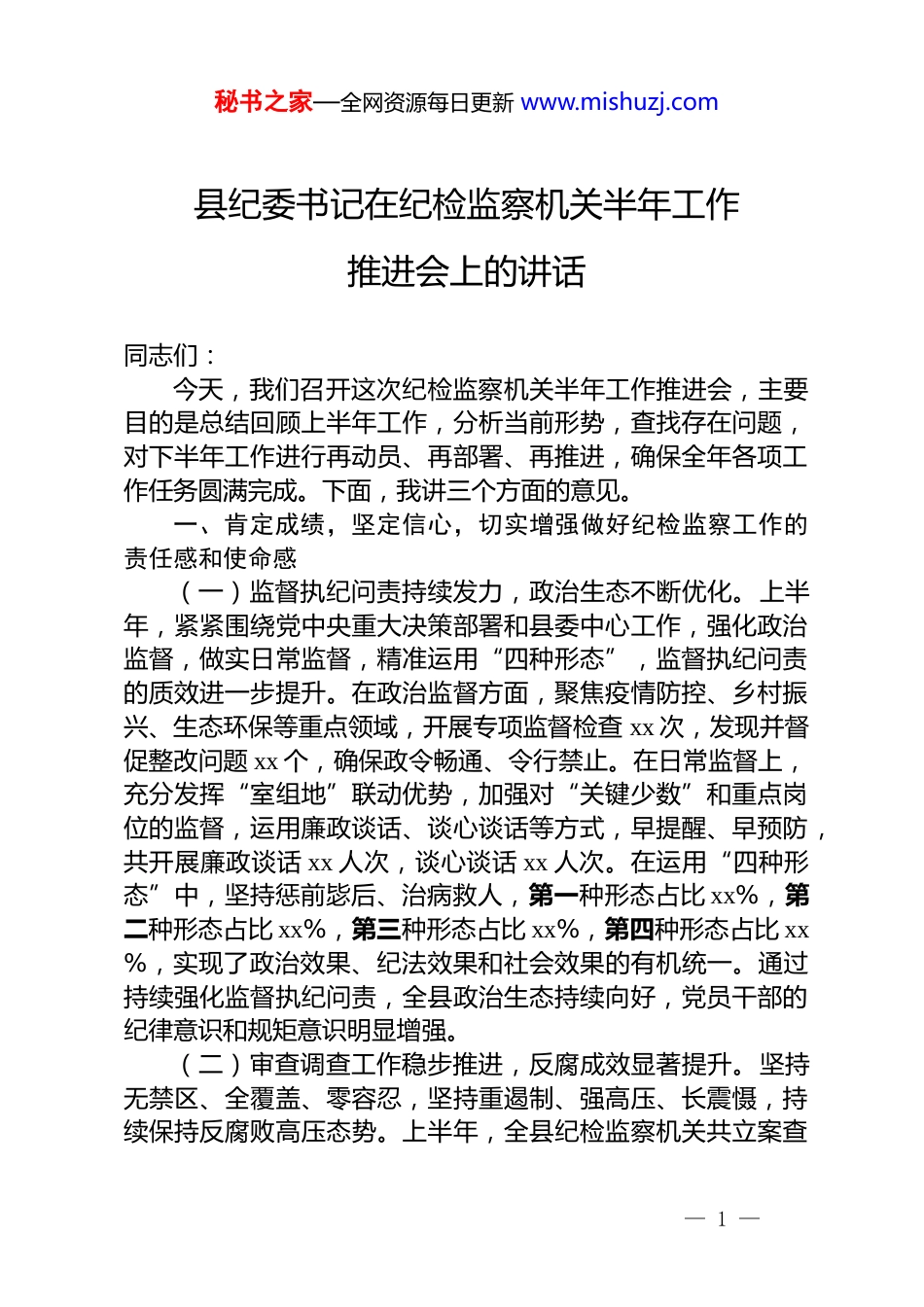 秘书之家—全网资源每日更新 www.mishuzj.com县纪委书记在纪检监察机关半年工作推进会上的讲话同志们:今天,我们召开这次纪检监察机关半年工作推进会,主要目的是总结回顾上半年工作,分析当前形势,查找存在问题,对下半年工作进行再动员、再部署、再推进,确保全年各项工作任务圆满完成。下面,我讲三个方面的意见。一、肯定成绩,坚定信心,切实增强做好纪检监察工作的责任感和使命感(一)监督执纪问责持续发力,政治生态不断优化。上半年,紧紧围绕党中央重大决策部署和县委中心工作,强化政治监督,做实日常监督,精准运用“四种形态”,监督执纪问责的质效进一步提升。在政治监督方面,聚焦疫情防控、乡村振兴、生态环保等重点领域,开展专项监督检查 xx 次,发现并督促整改问题 xx 个,确保政令畅通、令行禁止。在日常监督上,充分发挥“室组地”联动优势,加强对“关键少数”和重点岗位的监督,运用廉政谈话、谈心谈话等方式,早提醒、早预防,共开展廉政谈话 xx 人次,谈心谈话 xx 人次。在运用“四种形态”中,坚持惩前毖后、治病救人,第一种形态占比 xx%,第二种形态占比 xx%,第三种形态占比 xx%,第四种形态占比 xx%,实现了政治效果、纪法效果和社会效果的有机统一。通过持续强化监督执纪问责,全县政治生态持续向好,党员干部的纪律意识和规矩意识明显增强。(二)审查调查工作稳步推进,反腐成效显著提升。坚持无禁区、全覆盖、零容忍,坚持重遏制、强高压、长震慑,持续保持反腐败高压态势。上半年,全县纪检监察机关共立案查— 1 —秘书之家—全网资源每日更新 www.mishuzj.com处各类违纪违法案件 xx 件,处分 xx 人,其中涉及科级干部 xx人。在案件查办过程中,我们注重深化标本兼治,坚持一案一总结、一案一剖析,深入查找案件背后的制度漏洞和廉政风险点,督促案发单位完善制度、加强管理、强化监督,共发出纪检监察建议书 xx 份,推动建立健全制度 xx 项。同时,加大通报曝光力度,定期发布审查调查信息,点名道姓通报曝光典型案例 xx 起,形成了有力震慑,达到了“查处一案、警示一片、治理一域”的综合效果。(三)作风建设常抓不懈,“四风”问题得到有效遏制。持之以恒落实中央八项规定及其实施细则精神,紧盯重要节点、关键环节,开展明察暗访 xx 次,查处违反中央八项规定精神问题 xx 起,处理 xx 人,给予党纪政务处分 xx 人。深入开展形式主义、官僚主义专项整治,聚焦文山会海、过度留痕、督查检查考核过多过频等突出问题,加大整治力度,共查处形式主义、官僚主义问题 xx 起,处 xx 人。通过持续整治“四风”问题,全县党员干部的工作作风明显转变,干事创业的精气神更加饱满,为全县经济社会发展提供了坚强的作风保障。(四)自身建设不断加强,干部队伍素质显著提高。坚持打铁必须自身硬,以“纪检监察工作规范化法治化正规化建设年”活动为契机,全面加强纪检监察干部队伍建设。加强政治理论学习,通过举办专题培训班、开展主题党日活动等方式,不断提高干部的政治判断力、政治领悟力、政治执行力。加强业务培训,采取“请进来、走出去”相结合的方式,邀请专家学者授课 xx 次,组织干部外出学习培训 xx 人次,开展内部业务交流 xx 次,有效提升了干部的业务能力和综合素质。加强自我监督,严格执行纪检监察干部“十严禁”等规定,对干部身上的苗头性、倾向性问题及时提醒纠正,对不适合在纪检监察岗位工作的坚决调整,共处理纪检监察干部 xx 人,切实维护了纪检监察队伍的纯洁性和先进性。— 2 —秘书之家—全网资源每日更新 www.mishuzj.com二、正视问题,找准差距,切实增强做好下半年工作的紧迫感和危机感(一)监督精准度有待提高。虽然我们在监督工作中采取了一系列措施,但监督的精准度还不够高,存在泛化、虚化的问题。在政治监督方面,对党中央重大决策部署和县委中心工作的结合点把握还不够精准,监督的重点不够突出,方式方法还不够创新。在日常监督中,对一些重点领域、关键环节的监督还不够深入,存在表面化、形式化的现象,对一些潜在的风险隐患发现不及时、处置不到位。...