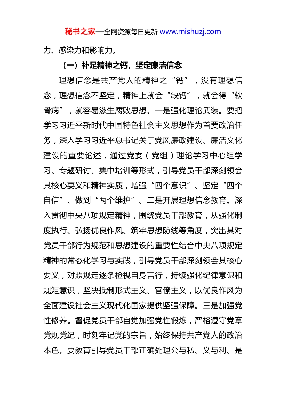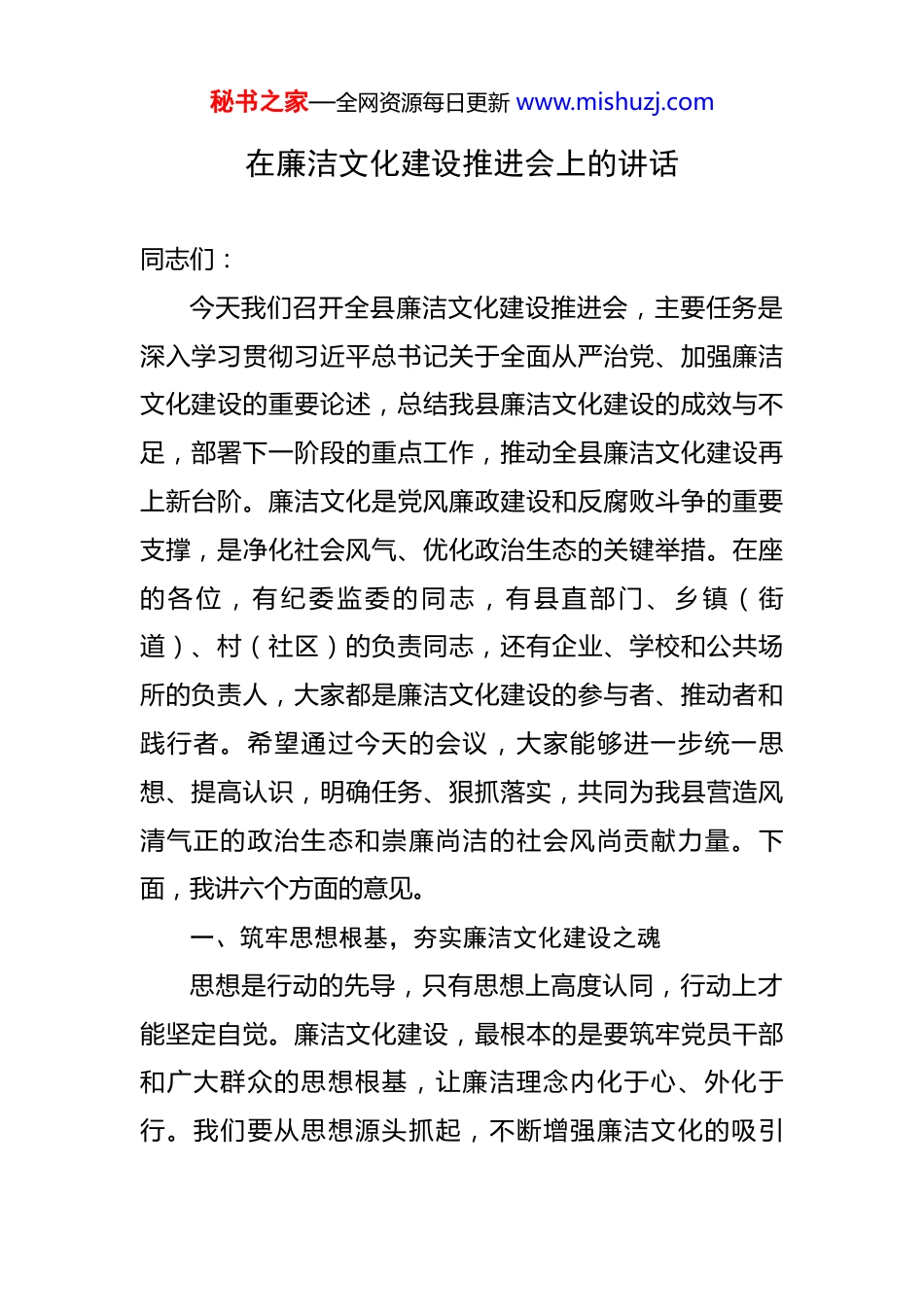 秘书之家—全网资源每日更新 www.mishuzj.com在廉洁文化建设推进会上的讲话 同志们:今天我们召开全县廉洁文化建设推进会,主要任务是深入学习贯彻习近平总书记关于全面从严治党、加强廉洁文化建设的重要论述,总结我县廉洁文化建设的成效与不足,部署下一阶段的重点工作,推动全县廉洁文化建设再上新台阶。廉洁文化是党风廉政建设和反腐败斗争的重要支撑,是净化社会风气、优化政治生态的关键举措。在座的各位,有纪委监委的同志,有县直部门、乡镇(街道)、村(社区)的负责同志,还有企业、学校和公共场所的负责人,大家都是廉洁文化建设的参与者、推动者和践行者。希望通过今天的会议,大家能够进一步统一思想、提高认识,明确任务、狠抓落实,共同为我县营造风清气正的政治生态和崇廉尚洁的社会风尚贡献力量。下面,我讲六个方面的意见。一、筑牢思想根基,夯实廉洁文化建设之魂思想是行动的先导,只有思想上高度认同,行动上才能坚定自觉。廉洁文化建设,最根本的是要筑牢党员干部和广大群众的思想根基,让廉洁理念内化于心、外化于行。我们要从思想源头抓起,不断增强廉洁文化的吸引秘书之家—全网资源每日更新 www.mishuzj.com力、感染力和影响力。(一)补足精神之钙,坚定廉洁信念理想信念是共产党人的精神之“钙”,没有理想信念,理想信念不坚定,精神上就会“缺钙”,就会得“软骨病”,就容易滋生腐败思想。一是强化理论武装。要把学习习近平新时代中国特色社会主义思想作为首要政治任务,深入学习习近平总书记关于党风廉政建设、廉洁文化建设的重要论述,通过党委(党组)理论学习中心组学习、专题研讨、集中培训等形式,引导党员干部深刻领会其核心要义和精神实质,增强“四个意识”、坚定“四个自信”、做到“两个维护”。二是开展理想信念教育。深入贯彻中央八项规定精神,围绕党员干部教育,从强化制度执行、弘扬优良作风、筑牢思想防线等角度,突出其对党员干部行为规范和思想建设的重要性结合中央八项规定精神的常态化学习与实践,引导党员干部深刻领会其核心要义,对照规定逐条检视自身言行,持续强化纪律意识和规矩意识,坚决抵制形式主义、官僚主义,以优良作风为全面建设社会主义现代化国家提供坚强保障。三是加强党性修养。督促党员干部自觉加强党性锻炼,严格遵守党章党规党纪,时刻牢记党的宗旨,始终保持共产党人的政治本色。要教育引导党员干部正确处理公与私、义与利、是秘书之家—全网资源每日更新 www.mishuzj.com与非、情与法、亲与清、俭与奢、苦与乐、得与失的关系,做到心有所畏、言有所戒、行有所止。(二)传承红色基因,汲取廉洁力量我县有着丰富的红色资源,这些红色资源中蕴含着宝贵的廉洁基因。我们要充分挖掘和利用这些资源,让红色文化成为廉洁文化建设的重要源泉。一是挖掘红色廉洁故事。组织专人深入挖掘革命先辈、英雄模范在我县留下的廉洁故事,整理成册、拍成短片,通过各种媒体平台广泛传播。让党员干部和群众在聆听故事中感受廉洁精神,接受廉洁教育。二是打造红色廉洁教育基地。依托我县的革命旧址、纪念馆等红色资源,打造一批红色廉洁教育基地,定期组织党员干部参观学习,开展主题党日活动,让大家在实地感悟中传承红色基因,汲取廉洁力量。三是开展红色文化活动。举办红色文化节、红色歌曲传唱、红色故事演讲等活动,将廉洁元素融入其中,让红色文化和廉洁文化相互交融、相得益彰,在全县营造崇尚红色文化、践行廉洁理念的浓厚氛围。(三)弘扬传统美德,涵养廉洁品格中华优秀传统文化是中华民族的精神命脉,其中蕴含着丰富的廉洁思想和道德规范。我们要传承和弘扬中华优秀传统美德,从中汲取廉洁养分,涵养廉洁品格。一是挖秘书之家—全网资源每日更新 www.mishuzj.com掘传统廉洁文化。深入研究我县地方传统民俗、家规家训中的廉洁元素,如“克勤克俭”“清白传家”等,整理提炼出具有地方特色的廉洁理念和道德规范,让传统廉洁文化焕发新的生机与活力。二是开展传统美德教育。将传统廉洁文化纳入中小学教育、干部教育培训的重要内容,通过开设专题课程、举办讲座、开展实践活动等形式,引导青少年和党员干部学习...