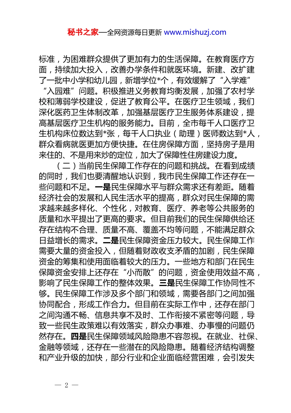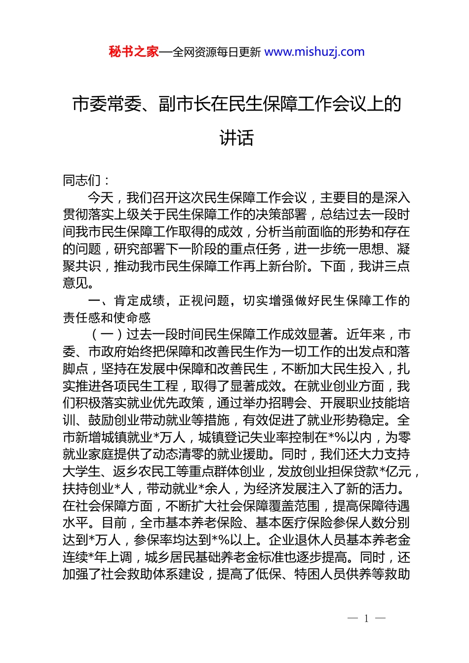 秘书之家—全网资源每日更新 www.mishuzj.com市委常委、副市长在民生保障工作会议上的讲话同志们:今天,我们召开这次民生保障工作会议,主要目的是深入贯彻落实上级关于民生保障工作的决策部署,总结过去一段时间我市民生保障工作取得的成效,分析当前面临的形势和存在的问题,研究部署下一阶段的重点任务,进一步统一思想、凝聚共识,推动我市民生保障工作再上新台阶。下面,我讲三点意见。一、肯定成绩,正视问题,切实增强做好民生保障工作的责任感和使命感(一)过去一段时间民生保障工作成效显著。近年来,市委、市政府始终把保障和改善民生作为一切工作的出发点和落脚点,坚持在发展中保障和改善民生,不断加大民生投入,扎实推进各项民生工程,取得了显著成效。在就业创业方面,我们积极落实就业优先政策,通过举办招聘会、开展职业技能培训、鼓励创业带动就业等措施,有效促进了就业形势稳定。全市新增城镇就业*万人,城镇登记失业率控制在*%以内,为零就业家庭提供了动态清零的就业援助。同时,我们还大力支持大学生、返乡农民工等重点群体创业,发放创业担保贷款*亿元,扶持创业*人,带动就业*余人,为经济发展注入了新的活力。在社会保障方面,不断扩大社会保障覆盖范围,提高保障待遇水平。目前,全市基本养老保险、基本医疗保险参保人数分别达到*万人,参保率均达到*%以上。企业退休人员基本养老金连续*年上调,城乡居民基础养老金标准也逐步提高。同时,还加强了社会救助体系建设,提高了低保、特困人员供养等救助— 1 —秘书之家—全网资源每日更新 www.mishuzj.com标准,为困难群众提供了更加有力的生活保障。在教育医疗方面,持续加大投入,改善办学条件和就医环境。新建、改扩建了一批中小学和幼儿园,新增学位*个,有效缓解了“入学难”“入园难”问题。积极推进义务教育均衡发展,加强了农村学校和薄弱学校建设,促进了教育公平。在医疗卫生领域,我们深化医药卫生体制改革,加强基层医疗卫生服务体系建设,提高基层医疗卫生机构的服务能力。目前,全市每千人口医疗卫生机构床位数达到*张,每千人口执业(助理)医师数达到*人,群众看病就医更加方便快捷。在住房保障方面,坚持房子是用来住的、不是用来炒的定位,加大了保障性住房建设力度。(二)当前民生保障工作存在的问题和挑战。在看到成绩的同时,我们也要清醒地认识到,我市民生保障工作还存在一些问题和不足。一是民生保障水平与群众需求还有差距。随着经济社会的发展和人民生活水平的提高,群众对民生保障的需求越来越多样化、个性化,对教育、医疗、养老等公共服务的质量和水平提出了更高的要求。但目前我们的民生保障供给还存在结构不合理、质量不高、覆盖不均等问题,不能满足群众日益增长的需求。二是民生保障资金压力较大。民生保障工作需要大量的资金投入,但随着财政收支矛盾的加剧,民生保障资金的筹集和使用面临着较大的压力。一些地方和部门在民生保障资金安排上还存在“小而散”的问题,资金使用效益不高,影响了民生保障工作的整体效果。三是民生保障工作协同性不够。民生保障工作涉及多个部门和领域,需要各部门之间加强协同配合,形成工作合力。但目前在实际工作中,还存在部门之间沟通不畅、信息共享不及时、工作衔接不紧密等问题,导致一些民生政策难以有效落实,群众办事难、办事慢的问题仍然存在。四是民生保障领域风险隐患不容忽视。在就业、社保、金融等领域,还存在一些潜在的风险隐患。随着经济结构调整和产业升级的加快,部分行业和企业面临经营困难,会引发失— 2 —秘书之家—全网资源每日更新 www.mishuzj.com业风险;社保基金收支平衡压力增大,存在一定的支付风险;一些非法集资、金融诈骗等活动时有发生,给群众财产安全带来了威胁。二、突出重点,精准发力,扎实推进下一阶段民生保障工作(一)着力稳定和扩大就业。就业是民生之本,是最大的民生工程、民心工程、根基工程。要坚持就业优先战略和积极就业政策,实现更高质量和更充分就业。一是加强就业政策支持。落实好创业担保贷款、社会保险补贴、职业培训补贴等政策,鼓励企业吸纳就业、劳动者自主创业和灵...