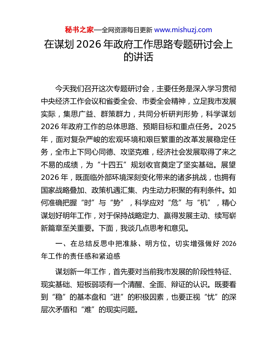 秘书之家—全网资源每日更新 www.mishuzj.com在谋划 2026 年政府工作思路专题研讨会上的讲话今天我们召开这次专题研讨会,主要任务是深入学习贯彻中央经济工作会议和省委全会、市委全会精神,立足我市发展实际,集思广益、群策群力,共同分析研判形势,科学谋划2026 年政府工作的总体思路、预期目标和重点任务。2025年,面对复杂严峻的宏观环境和艰巨繁重的改革发展稳定任务,全市上下同心同德、攻坚克难,经济社会发展取得了来之不易的成绩,为“十四五”规划收官奠定了坚实基础。展望2026 年,既面临外部环境深刻变化带来的诸多挑战,也拥有国家战略叠加、政策机遇汇集、内生动力积聚的有利条件。如何准确把握“时”与“势”,科学应对“危”与“机”,精心谋划好明年工作,对于保持战略定力、赢得发展主动、续写崭新篇章至关重要。下面,我谈几点思考和意见。一、在总结反思中把准脉、明方位,切实增强做好 2026年工作的责任感和紧迫感谋划新一年工作,首先要对当前我市发展的阶段性特征、现实基础、短板弱项有一个清醒、全面、辩证的认识。既要看到“稳”的基本盘和“进”的积极因素,也要正视“忧”的深层次矛盾和“难”的现实问题。秘书之家—全网资源每日更新 www.mishuzj.com(一)客观审视发展成就,坚定乘势而上的信心决心。过去一年,全市经济运行总体平稳、稳中有进、稳中提质,高质量发展取得新进展。具体表现在:一是经济增长保持在合理区间。主要经济指标增速高于全省平均水平,经济总量和综合实力稳步提升,发展的韧性和回旋余地进一步显现。二是产业转型升级步伐加快。传统优势产业改造提升效果初显,战略性新兴产业、高新技术产业增加值占比持续提高,现代服务业发展势头良好,新经济新业态不断涌现。三是发展动能加速转换。科技创新投入持续加大,一批创新平台落地建设,人才集聚效应增强。重点领域改革向纵深推进,营商环境不断优化,市场主体活力得到激发。四是城乡面貌持续改善。城市更新行动扎实推进,基础设施网络日益完善,乡村振兴战略深入实施,生态环境质量稳步提升。五是民生福祉不断增进。就业、教育、医疗、社保等民生事业全面发展,社会大局保持和谐稳定。这些成绩的取得,为我们谋划和推进 2026 年工作积累宝贵经验,奠定坚实基础,更坚定应对挑战、开拓前进的信心。(二)清醒认识问题短板,明晰攻坚突破的靶向方向。在肯定成绩的同时,我们必须坚持问题导向,正视发展中的不平衡不充分问题。一是经济结构优化升级任务艰巨。传统产业“大而不强”、新兴产业“势强力弱”的局面尚未根本改变,产业链现代化水平有待提高,科技创新对产业发展的支撑引领作用亟待加强。二是有效需求支撑仍显不足。投资增长后劲乏秘书之家—全网资源每日更新 www.mishuzj.com力,大项目、好项目储备不足;消费潜能尚未充分释放,高品质供给与多样化需求匹配不够;外贸出口面临较大不确定性。三是区域协调发展存在短板。县域经济实力偏弱,城乡发展差距依然明显,基础设施和公共服务均等化水平有待提升。四是重点领域风险隐患不容忽视。财政收支平衡压力加大,部分企业生产经营困难,房地产、金融等领域风险防控需持续用力,安全生产、社会稳定等方面的基础仍需加固。五是政府治理效能有待提升。部分干部思想观念、能力作风与新阶段新要求不相适应,形式主义、官僚主义问题仍不同程度存在,营商环境的便利化、法治化、国际化水平仍需提高。这些问题是我们谋划明年工作必须直面并着力破解的重点。(三)科学研判宏观形势,抢抓稍纵即逝的战略机遇。2026 年,是我国发展进程中具有重要意义的一年。从宏观层面看,我国经济长期向好的基本面没有改变,制度优势显著,治理效能提升,物质基础雄厚,市场空间广阔,发展韧性强大,社会大局稳定。中央坚持稳中求进工作总基调,加强宏观政策逆周期和跨周期调节,持续推动经济实现质的有效提升和量的合理增长,特别是围绕发展新质生产力、深化重点领域改革、扩大高水平对外开放、推进乡村全面振兴、促进绿色低碳转型等方面,将推出一系列重大举措。我省也正处于多重国家战略交汇叠加的机遇期,发展潜能加速释放。我们...