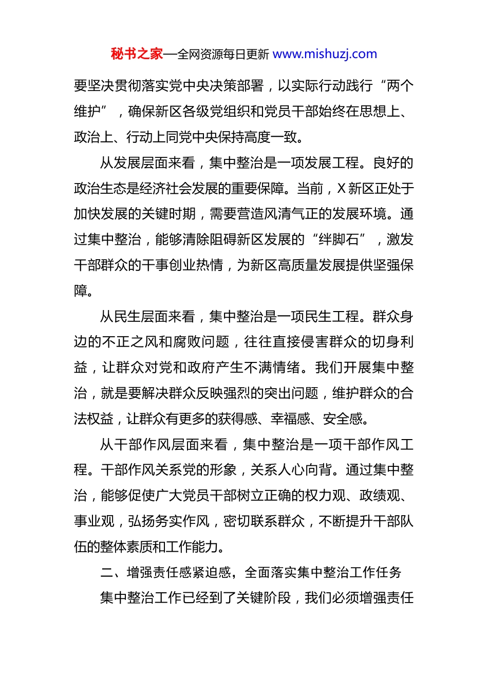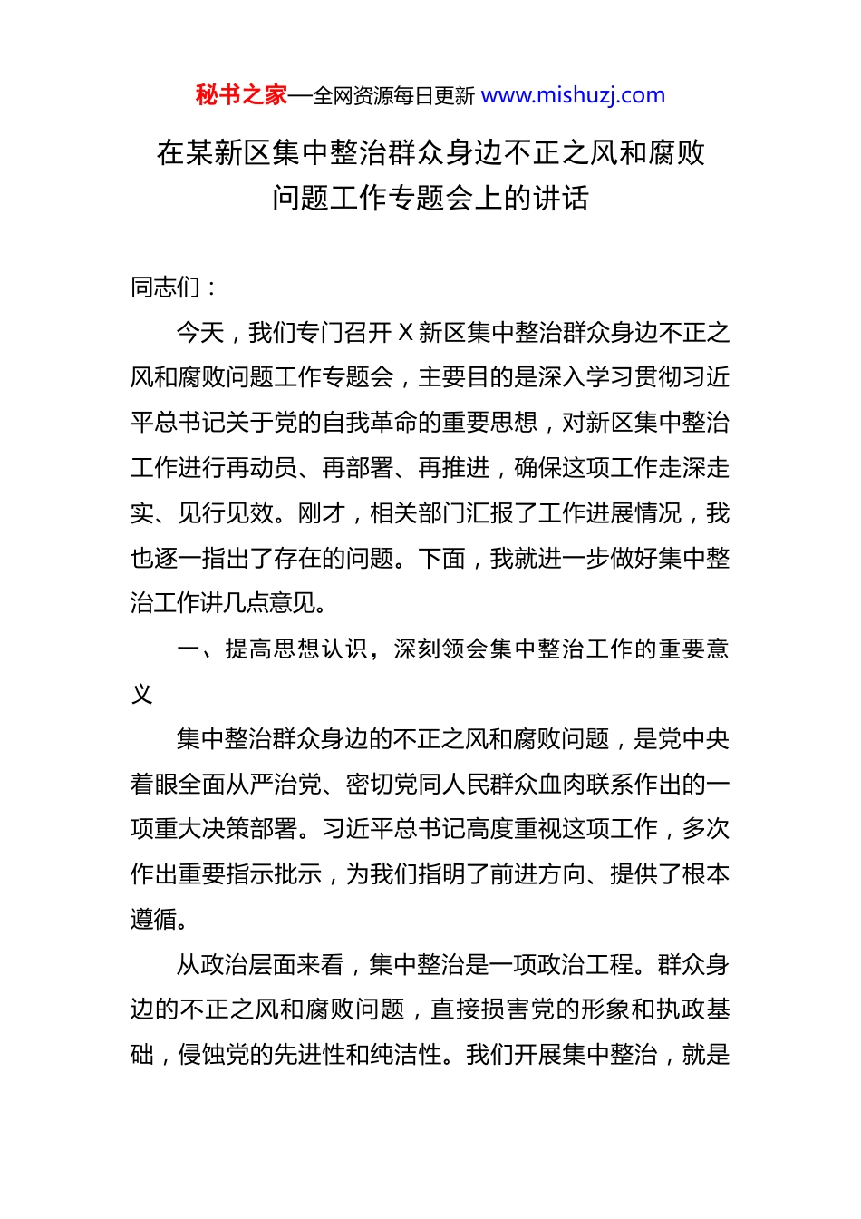 秘书之家—全网资源每日更新 www.mishuzj.com在某新区集中整治群众身边不正之风和腐败问题工作专题会上的讲话 同志们:今天,我们专门召开 X 新区集中整治群众身边不正之风和腐败问题工作专题会,主要目的是深入学习贯彻习近平总书记关于党的自我革命的重要思想,对新区集中整治工作进行再动员、再部署、再推进,确保这项工作走深走实、见行见效。刚才,相关部门汇报了工作进展情况,我也逐一指出了存在的问题。下面,我就进一步做好集中整治工作讲几点意见。一、提高思想认识,深刻领会集中整治工作的重要意义集中整治群众身边的不正之风和腐败问题,是党中央着眼全面从严治党、密切党同人民群众血肉联系作出的一项重大决策部署。习近平总书记高度重视这项工作,多次作出重要指示批示,为我们指明了前进方向、提供了根本遵循。从政治层面来看,集中整治是一项政治工程。群众身边的不正之风和腐败问题,直接损害党的形象和执政基础,侵蚀党的先进性和纯洁性。我们开展集中整治,就是秘书之家—全网资源每日更新 www.mishuzj.com要坚决贯彻落实党中央决策部署,以实际行动践行“两个维护”,确保新区各级党组织和党员干部始终在思想上、政治上、行动上同党中央保持高度一致。从发展层面来看,集中整治是一项发展工程。良好的政治生态是经济社会发展的重要保障。当前,X 新区正处于加快发展的关键时期,需要营造风清气正的发展环境。通过集中整治,能够清除阻碍新区发展的“绊脚石”,激发干部群众的干事创业热情,为新区高质量发展提供坚强保障。从民生层面来看,集中整治是一项民生工程。群众身边的不正之风和腐败问题,往往直接侵害群众的切身利益,让群众对党和政府产生不满情绪。我们开展集中整治,就是要解决群众反映强烈的突出问题,维护群众的合法权益,让群众有更多的获得感、幸福感、安全感。从干部作风层面来看,集中整治是一项干部作风工程。干部作风关系党的形象,关系人心向背。通过集中整治,能够促使广大党员干部树立正确的权力观、政绩观、事业观,弘扬务实作风,密切联系群众,不断提升干部队伍的整体素质和工作能力。二、增强责任感紧迫感,全面落实集中整治工作任务集中整治工作已经到了关键阶段,我们必须增强责任秘书之家—全网资源每日更新 www.mishuzj.com感和紧迫感,以更高的标准、更严的要求、更实的举措,全力推动各项工作落实。(一)落实好责任。各级党组织要切实履行主体责任,党组织书记要履行第一责任人职责,班子成员要落实“一岗双责”,形成一级抓一级、层层抓落实的工作格局。纪检监察机关要履行好监督责任,加强对集中整治工作的监督检查,严肃查处违纪违法行为。各相关部门要密切配合、协同作战,形成工作合力。(二)完成好任务。要严格按照集中整治的工作方案和任务清单,明确时间节点和工作要求,一项一项抓落实,一件一件求实效。要聚焦重点领域和关键环节,深入排查问题线索,建立问题台账,实行销号管理,确保问题整改到位。(三)锤炼好作风。要把集中整治工作作为锤炼干部作风的重要契机,引导广大党员干部树立正确的价值观和工作态度。要坚决反对形式主义、官僚主义,杜绝敷衍塞责、推诿扯皮等现象,以严谨的工作作风推动集中整治工作取得实效。(四)联系好群众。集中整治工作的出发点和落脚点都是为了群众。我们要始终坚持群众路线,广泛听取群众意见和建议,切实解决群众反映强烈的突出问题。要通过秘书之家—全网资源每日更新 www.mishuzj.com集中整治,进一步密切党同人民群众的血肉联系,赢得群众的信任和支持。三、强化工作举措,不断提升集中整治工作质效为了确保集中整治工作取得实效,我们要从以下几个方面强化工作举措。(一)强统筹。要结合新区实际,统筹好工作机制、工作任务、工作重点和工作举措。建立健全集中整治工作协调机制,加强部门之间的沟通协作,形成工作合力。要明确工作目标和任务,突出重点领域和关键环节,制定切实可行的工作计划和措施。要加强对工作进展情况的调度和评估,及时发现问题、解决问题,确保集中整治工作有序推进。(二)强联动。集中整治工作涉及多个部门和层面,需要加强联动协...