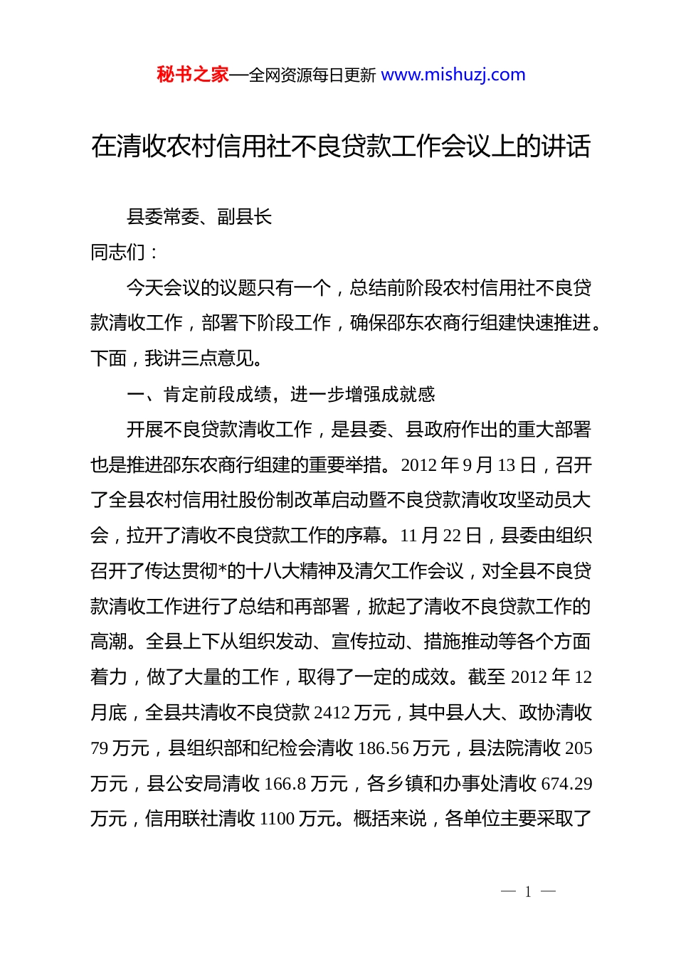 秘书之家—全网资源每日更新 www.mishuzj.com在清收农村信用社不良贷款工作会议上的讲话县委常委、副县长同志们:今天会议的议题只有一个,总结前阶段农村信用社不良贷款清收工作,部署下阶段工作,确保邵东农商行组建快速推进。下面,我讲三点意见。一、肯定前段成绩,进一步增强成就感开展不良贷款清收工作,是县委、县政府作出的重大部署也是推进邵东农商行组建的重要举措。2012 年 9 月 13 日,召开了全县农村信用社股份制改革启动暨不良贷款清收攻坚动员大会,拉开了清收不良贷款工作的序幕。11 月 22 日,县委由组织召开了传达贯彻*的十八大精神及清欠工作会议,对全县不良贷款清收工作进行了总结和再部署,掀起了清收不良贷款工作的高潮。全县上下从组织发动、宣传拉动、措施推动等各个方面着力,做了大量的工作,取得了一定的成效。截至 2012 年 12月底,全县共清收不良贷款 2412 万元,其中县人大、政协清收79 万元,县组织部和纪检会清收 186.56 万元,县法院清收 205万元,县公安局清收 166.8 万元,各乡镇和办事处清收 674.29万元,信用联社清收 1100 万元。概括来说,各单位主要采取了— 1 —秘书之家—全网资源每日更新 www.mishuzj.com如下工作举措:(一)搭建了清收工作平台。县直各相关单位和各乡镇、办事处及时召开专题会议传达全县清收工作动员大会精神,认真学习了《清收和处置邵东县农村信用社不良贷款工作方案》、《不良贷款清收通告》等文件;组建了清收工作小组,成立了专职或兼职收贷队伍。部分乡镇还分解清收任务,落实了工作责任,与辖内各村签订了清收目标责任状。(二)营造了良好工作氛围。自全县清收工作开始之后,通过县、乡、村三级联动,全县上下形成了强大的社会宣传声势。各乡镇、农村信用社各网点组织力量共计张贴县人民政府农村信用社不良贷款清收通告 3000 余份,张贴宣传标语 15000余张,悬挂清收横幅 400 余条。录制了不良贷款清收工作县长电视讲话,并在县电视台滚动播出 1 个月。县信用联社出动 4台大型宣传车,分两批次在各街道巡回宣传 30 余天。在强大的宣传攻势下,部分长期拖欠农村信用社不良贷款的贷款户主动上门还贷,收到了较好效果。(三)实施了可行的工作措施。具体包括六个方面:一是县人大、政协利用换届选举的契机,对拟当选人大代表、政协委员的相关人员,严格资格审查,把拖欠农村信用社贷款的归还情况作为资格审核的重要内容,督促欠款人及时还款,起到— 2 —秘书之家—全网资源每日更新 www.mishuzj.com了很好的成效。二是优化调整了县金融维权领导小组人员结构,从县政府办、县组织部、县纪委、县人社局、县财政局、县公安局、县法院、县国资局、人民银行邵东县支行抽调 10 人,组成工作小组负责全县不良贷款的清收和督查工作。三是县组织部和纪检会严格落实“三停五不”政策,对欠款的公职人员下发了催收通知书,从元月 1 日开始,对全县拖欠农村信用社不良贷款的公职人员分批次执行媒体曝光制度,做到“两上”(上电视、上报纸)。目前,第一批次的 83 人,已经执行到位,并将从元月 10 日起,对还款不到位的人员执行“三停五不”政策。四是司法机关采取了清收措施。县法院专门成立了三个工作小组,由副院长和执行局长带队,开展了专项整治活动;县公安局由经侦大队牵头,对部分涉案欠款人员采取了强制清收,刑拘 2 人,其中信用社内部违规放贷人员 1 人,诈骗贷款人员 1人。五是部分乡镇对所辖行政村、社区、组进行了逐村、逐户的“地毯式”清收。其中流光岭镇的经验是值得我们借鉴的,该镇清收工作由*委书记亲自抓,成立了两个工作小组,明确了清收任务,由副镇长带队扎扎实实开展了逐村、逐户的清收工作,超额完成了县政府下达的任务。六是信用联社通过强化员工考核、加大对不良贷款的核销力度、加强工作督查等措施,取得了非常好的成效。2012 年,信用联社对 10 名客户经理做出— 3 —秘书之家—全网资源每日更新 www.mishuzj.com了相应处理,其中 2 人做停岗处理,8 人做专职收贷处理,每月只发 350 元基本生活费。二、正视当前问题,进...