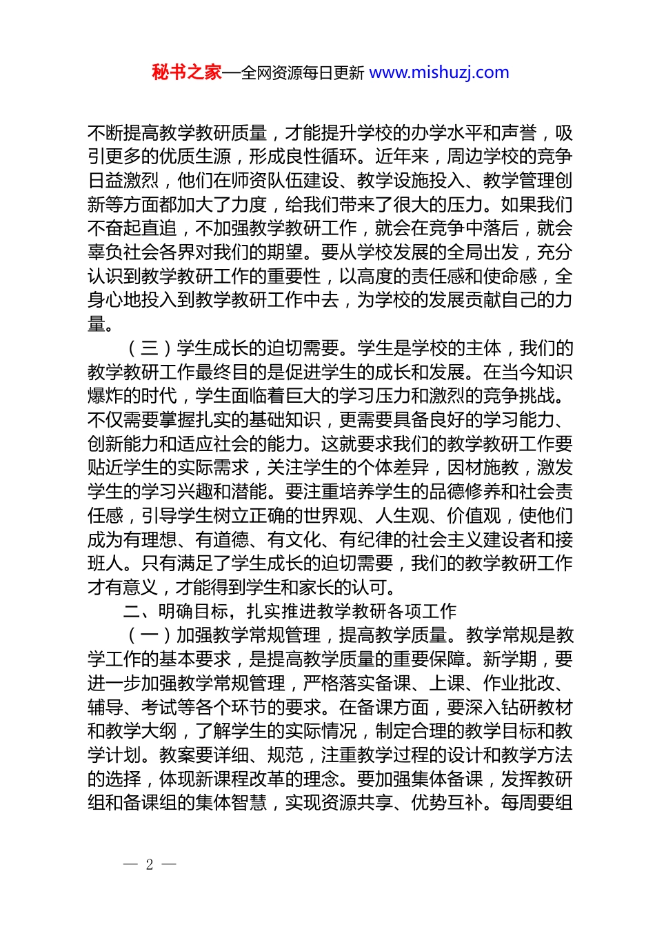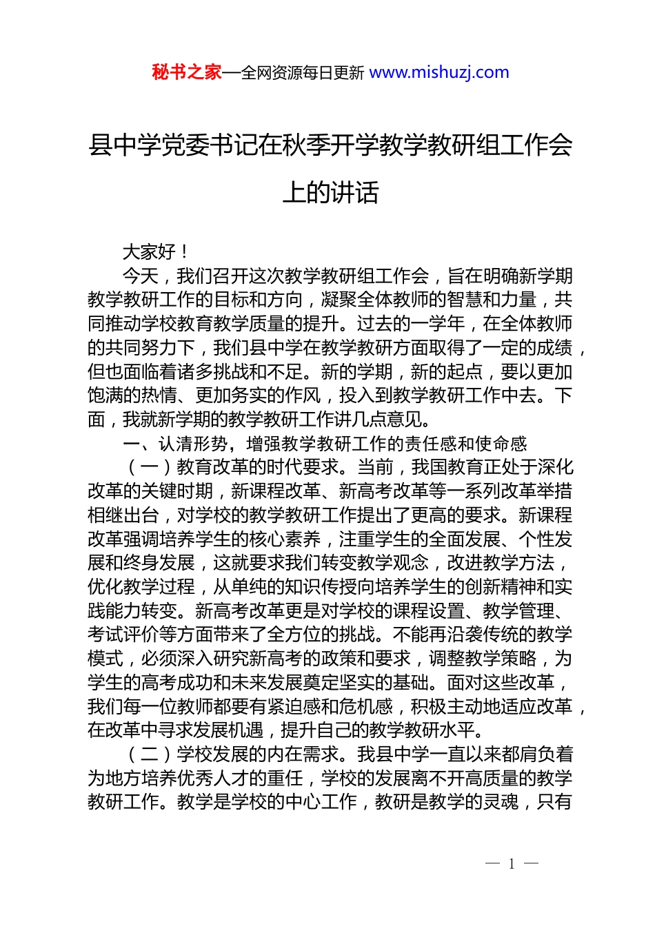 秘书之家—全网资源每日更新 www.mishuzj.com县中学党委书记在秋季开学教学教研组工作会上的讲话大家好!今天,我们召开这次教学教研组工作会,旨在明确新学期教学教研工作的目标和方向,凝聚全体教师的智慧和力量,共同推动学校教育教学质量的提升。过去的一学年,在全体教师的共同努力下,我们县中学在教学教研方面取得了一定的成绩,但也面临着诸多挑战和不足。新的学期,新的起点,要以更加饱满的热情、更加务实的作风,投入到教学教研工作中去。下面,我就新学期的教学教研工作讲几点意见。一、认清形势,增强教学教研工作的责任感和使命感(一)教育改革的时代要求。当前,我国教育正处于深化改革的关键时期,新课程改革、新高考改革等一系列改革举措相继出台,对学校的教学教研工作提出了更高的要求。新课程改革强调培养学生的核心素养,注重学生的全面发展、个性发展和终身发展,这就要求我们转变教学观念,改进教学方法,优化教学过程,从单纯的知识传授向培养学生的创新精神和实践能力转变。新高考改革更是对学校的课程设置、教学管理、考试评价等方面带来了全方位的挑战。不能再沿袭传统的教学模式,必须深入研究新高考的政策和要求,调整教学策略,为学生的高考成功和未来发展奠定坚实的基础。面对这些改革,我们每一位教师都要有紧迫感和危机感,积极主动地适应改革,在改革中寻求发展机遇,提升自己的教学教研水平。(二)学校发展的内在需求。我县中学一直以来都肩负着为地方培养优秀人才的重任,学校的发展离不开高质量的教学教研工作。教学是学校的中心工作,教研是教学的灵魂,只有— 1 —秘书之家—全网资源每日更新 www.mishuzj.com不断提高教学教研质量,才能提升学校的办学水平和声誉,吸引更多的优质生源,形成良性循环。近年来,周边学校的竞争日益激烈,他们在师资队伍建设、教学设施投入、教学管理创新等方面都加大了力度,给我们带来了很大的压力。如果我们不奋起直追,不加强教学教研工作,就会在竞争中落后,就会辜负社会各界对我们的期望。要从学校发展的全局出发,充分认识到教学教研工作的重要性,以高度的责任感和使命感,全身心地投入到教学教研工作中去,为学校的发展贡献自己的力量。(三)学生成长的迫切需要。学生是学校的主体,我们的教学教研工作最终目的是促进学生的成长和发展。在当今知识爆炸的时代,学生面临着巨大的学习压力和激烈的竞争挑战。不仅需要掌握扎实的基础知识,更需要具备良好的学习能力、创新能力和适应社会的能力。这就要求我们的教学教研工作要贴近学生的实际需求,关注学生的个体差异,因材施教,激发学生的学习兴趣和潜能。要注重培养学生的品德修养和社会责任感,引导学生树立正确的世界观、人生观、价值观,使他们成为有理想、有道德、有文化、有纪律的社会主义建设者和接班人。只有满足了学生成长的迫切需要,我们的教学教研工作才有意义,才能得到学生和家长的认可。二、明确目标,扎实推进教学教研各项工作(一)加强教学常规管理,提高教学质量。教学常规是教学工作的基本要求,是提高教学质量的重要保障。新学期,要进一步加强教学常规管理,严格落实备课、上课、作业批改、辅导、考试等各个环节的要求。在备课方面,要深入钻研教材和教学大纲,了解学生的实际情况,制定合理的教学目标和教学计划。教案要详细、规范,注重教学过程的设计和教学方法的选择,体现新课程改革的理念。要加强集体备课,发挥教研组和备课组的集体智慧,实现资源共享、优势互补。每周要组— 2 —秘书之家—全网资源每日更新 www.mishuzj.com织一次集体备课活动,共同探讨教学中遇到的问题和解决方案,提高备课的质量和效率。上课是教学的中心环节,直接关系到教学质量的高低。教师要严格按照教学计划和教案进行教学,遵循教学规律,运用恰当的教学方法,充分调动学生的学习积极性和主动性。要注重课堂教学的互动性,鼓励学生积极参与课堂讨论和实践活动,培养学生的思维能力和创新精神。要合理运用现代教育技术手段,丰富教学内容,提高教学效果。学校将加大对课堂教学的检查力度,通过推门听课、公开课等形式,及时了解教...