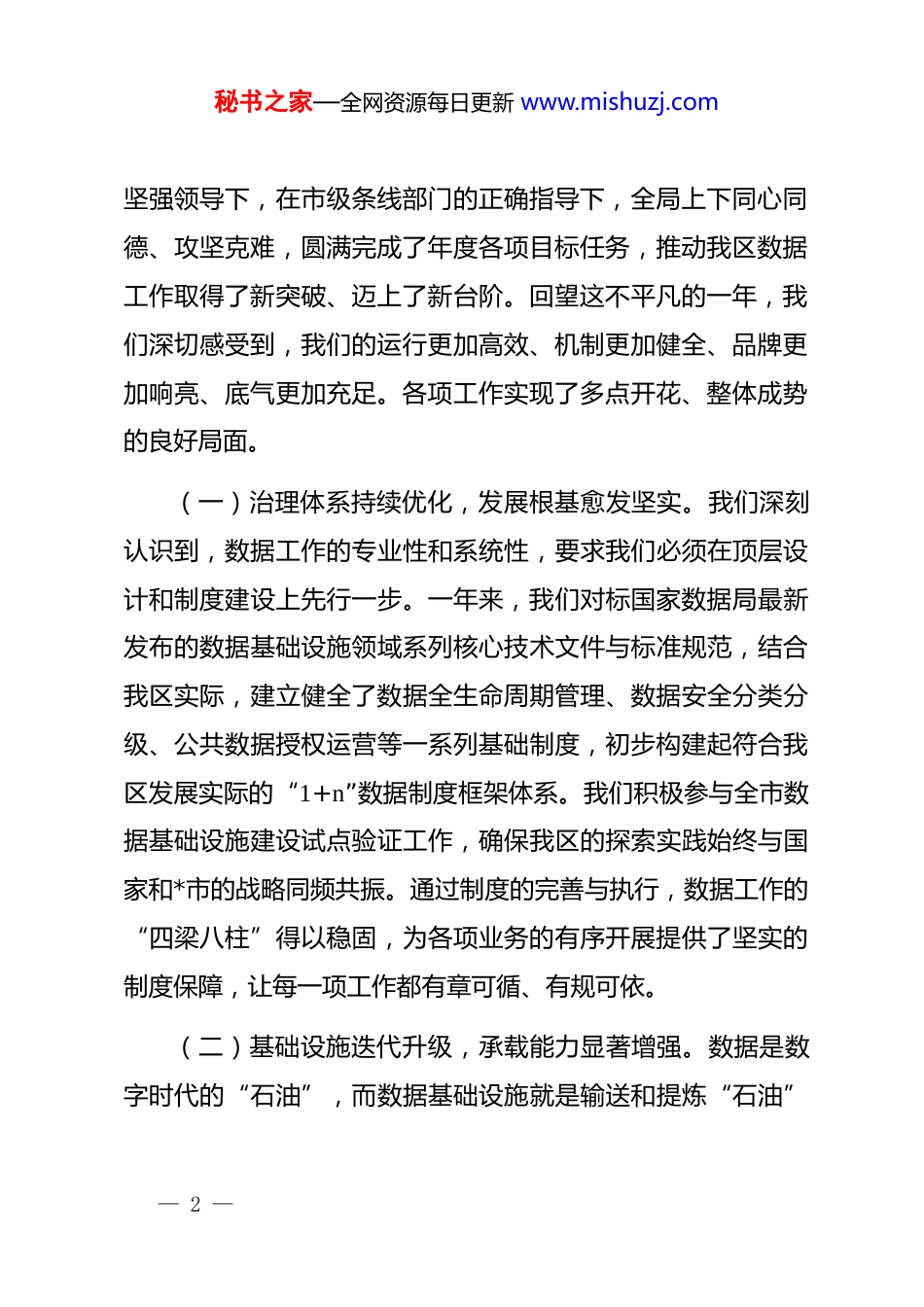 秘书之家—全网资源每日更新 www.mishuzj.com在区数据局 2026 年度务虚工作会议上的讲话稿同志们:大家好!今天,我们在这里召开区数据局年度务虚工作会议,主要任务是深入贯彻落实国家和*市关于数据发展的战略部署,全面总结 2025 年工作,系统分析当前我们面临的新形势、新挑战,共同谋划 2026 年乃至“十五五”时期的发展思路和关键举措。今天的会议既是一次总结复盘会,更是一次集思广益、凝聚共识、擘画未来的战略研讨会。刚才,各科室、各部门的同志都作了很好的发言,既有对过去一年工作的深刻反思,也有对未来发展的独到见解,听了很受启发。大家提出的问题实事求是,建议具体可行,充分体现了我们这支队伍想干事、能干事、干成事的精神风貌。下面,结合大家的发言和我的思考,我讲四点意见。一、回顾 2025:砥砺奋进,硕果累累,数据事业整体成势2025 年是“十四五”规划的收官之年,也是我们数据事业承前启后、积厚成势的关键一年。一年来,在区委、区政府的— 1 —秘书之家—全网资源每日更新 www.mishuzj.com坚强领导下,在市级条线部门的正确指导下,全局上下同心同德、攻坚克难,圆满完成了年度各项目标任务,推动我区数据工作取得了新突破、迈上了新台阶。回望这不平凡的一年,我们深切感受到,我们的运行更加高效、机制更加健全、品牌更加响亮、底气更加充足。各项工作实现了多点开花、整体成势的良好局面。(一)治理体系持续优化,发展根基愈发坚实。我们深刻认识到,数据工作的专业性和系统性,要求我们必须在顶层设计和制度建设上先行一步。一年来,我们对标国家数据局最新发布的数据基础设施领域系列核心技术文件与标准规范,结合我区实际,建立健全了数据全生命周期管理、数据安全分类分级、公共数据授权运营等一系列基础制度,初步构建起符合我区发展实际的“1+n”数据制度框架体系。我们积极参与全市数据基础设施建设试点验证工作,确保我区的探索实践始终与国家和*市的战略同频共振。通过制度的完善与执行,数据工作的“四梁八柱”得以稳固,为各项业务的有序开展提供了坚实的制度保障,让每一项工作都有章可循、有规可依。(二)基础设施迭代升级,承载能力显著增强。数据是数字时代的“石油”,而数据基础设施就是输送和提炼“石油”— 2 —秘书之家—全网资源每日更新 www.mishuzj.com的管道与工厂。我们深刻理解其基础性、战略性地位。2025 年,我们坚持适度超前原则,全力推进全区数据基础设施的迭代优化。我区“一网统管”的城市数字体征系统算力资源池完成新一轮扩容,核心数据中心新增部署超过 500 个标准机柜,总规模已突破 2500 个。我们与通信运营商深化合作,在全区重点产业园区、交通枢纽实现了 5g 网络信号的深度覆盖和质量优化。更值得一提的是,我们初步建成了区级算力统一调度平台,尝试对全区范围内的政务算力、社会算力进行有效纳管和智能调度,全年数据处理总量历史性地突破了 500pb,数据汇聚、存储、计算、传输能力得到质的飞跃。这些坚实的“底座”,为我区数字经济的蓬勃发展和城市智慧化治理提供了强有力的支撑。(三)应用场景深度赋能,价值释放成效凸显。数据的价值在于应用。我们始终将“赋能”作为数据工作的核心使命,致力于将数据资源转化为现实生产力和治理效能。在政务服务领域,我们持续深化“一网通办”改革,通过数据共享和业务流程再造,推动更多高频服务事项实现“免申即享”“智能秒办”,企业群众的办事体验和获得感显著提升。在城市治理领域,我们围绕公共安全、交通出行、生态环保等重点场景,打— 3 —秘书之家—全网资源每日更新 www.mishuzj.com造了多个数据驱动的精细化管理应用,城市运行的“智”治水平不断提高。在产业发展领域,我们聚焦汽车、生物医药、智能制造等我区优势产业,推动工业互联网平台建设,引导企业“上云用数赋智”,帮助一批传统企业实现了数字化转型,全区数字经济核心产业增加值预计同比增长超过 15%,数据要素的乘数效应开始显现。(四)产业生态加速繁荣,区域品牌效应初显。我们着力培育和发展数据产业,加大对“数商”企业的培育力度。通过政策引...