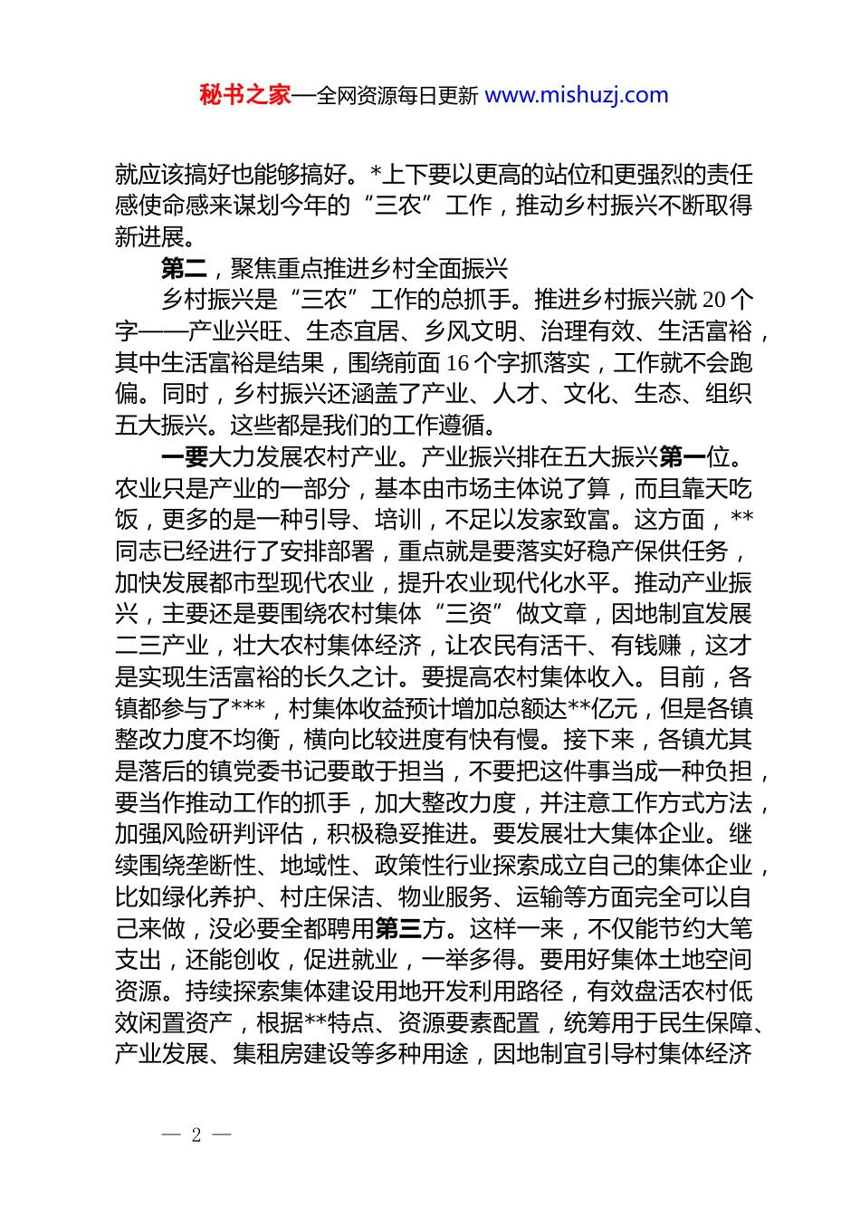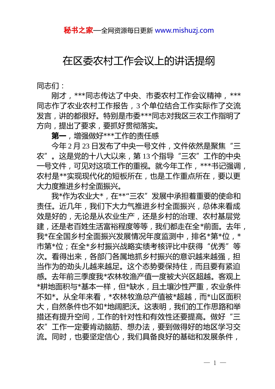 秘书之家—全网资源每日更新 www.mishuzj.com在区委农村工作会议上的讲话提纲同志们:刚才,***同志传达了中央、市委农村工作会议精神,***同志作了农业农村工作报告,3 个单位结合工作实际作了交流发言,讲的都很好。特别是市委***同志对我区三农工作指明了方向,提出了要求,要抓好贯彻落实。第一,增强做好***工作的责任感今年 2 月 23 日发布了中央一号文件,文件依然是聚焦“三农”。这是党的十八大以来,第 13 个指导“三农”工作的中央一号文件,可见对这项工作的重视。就今年工作,***书记强调,农村是**实现现代化的短板所在,也是工作重点所在,要以更大力度推进乡村全面振兴。我*作为农业大*,在**“三农”发展中承担着重要的使命和责任。近几年,我们下大力气推进乡村全面振兴,总体来看成效是好的,无论是从农业生产,还是乡村的治理、农村基层党建,还是老百姓生活富裕程度等等,我们都走在全*前面。去年,我*在全国乡村全面振兴发展情况年度监测中,排名*第*位,*市第*位;在全*乡村振兴战略实绩考核评比中获得“优秀”等次。看得出来,各部门各属地抓乡村振兴的意识越来越强,担当作为的劲头儿越来越足。这个态势要保持住,而且要有紧迫感。去年前三季度我*农林牧渔产值一度被大兴区超越。客观上*耕地面积与*基本一样,但*缺水,且土壤沙性严重,农业条件不如*。从全年来看,*农林牧渔总产值被*超越,而*山区面积大,自然条件也不如*地阔肥沃。这表明,我们的工作思路和举措还有提升空间,工作的针对性和有效性还要提高。做好“三农”工作一定要肯动脑筋、想办法,要到做得好的地区学习交流。同时,也要坚定信心,我们具备良好的基础和发展条件,— 1 —秘书之家—全网资源每日更新 www.mishuzj.com就应该搞好也能够搞好。*上下要以更高的站位和更强烈的责任感使命感来谋划今年的“三农”工作,推动乡村振兴不断取得新进展。第二,聚焦重点推进乡村全面振兴乡村振兴是“三农”工作的总抓手。推进乡村振兴就 20 个字——产业兴旺、生态宜居、乡风文明、治理有效、生活富裕,其中生活富裕是结果,围绕前面 16 个字抓落实,工作就不会跑偏。同时,乡村振兴还涵盖了产业、人才、文化、生态、组织五大振兴。这些都是我们的工作遵循。一要大力发展农村产业。产业振兴排在五大振兴第一位。农业只是产业的一部分,基本由市场主体说了算,而且靠天吃饭,更多的是一种引导、培训,不足以发家致富。这方面,**同志已经进行了安排部署,重点就是要落实好稳产保供任务,加快发展都市型现代农业,提升农业现代化水平。推动产业振兴,主要还是要围绕农村集体“三资”做文章,因地制宜发展二三产业,壮大农村集体经济,让农民有活干、有钱赚,这才是实现生活富裕的长久之计。要提高农村集体收入。目前,各镇都参与了***,村集体收益预计增加总额达**亿元,但是各镇整改力度不均衡,横向比较进度有快有慢。接下来,各镇尤其是落后的镇党委书记要敢于担当,不要把这件事当成一种负担,要当作推动工作的抓手,加大整改力度,并注意工作方式方法,加强风险研判评估,积极稳妥推进。要发展壮大集体企业。继续围绕垄断性、地域性、政策性行业探索成立自己的集体企业,比如绿化养护、村庄保洁、物业服务、运输等方面完全可以自己来做,没必要全都聘用第三方。这样一来,不仅能节约大笔支出,还能创收,促进就业,一举多得。要用好集体土地空间资源。持续探索集体建设用地开发利用路径,有效盘活农村低效闲置资产,根据**特点、资源要素配置,统筹用于民生保障、产业发展、集租房建设等多种用途,因地制宜引导村集体经济— 2 —秘书之家—全网资源每日更新 www.mishuzj.com组织与企业合作。二要切实提升基层治理效能。实现治理有效,关键还是要夯实基层基础,加强基层党组织建设,通过务实管用的治理方式,规范村干部、村民等群体的行为。要突出抓好农村党组织建设。组织振兴是核心,组织建设有力,乡村振兴才有可能,各镇党委书记要把这个牢牢抓在手里,特别是要着力锻造一支村书记“带头人”队伍。要提前谋划村换届工作,摸清村情民意和矛盾隐患,10 月底前上账问题全...