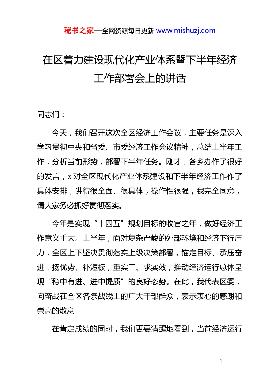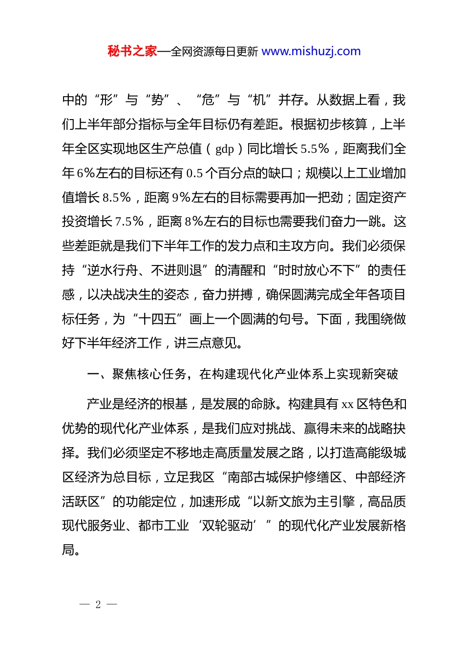 秘书之家—全网资源每日更新 www.mishuzj.com在区着力建设现代化产业体系暨下半年经济工作部署会上的讲话同志们:今天,我们召开这次全区经济工作会议,主要任务是深入学习贯彻中央和省委、市委经济工作会议精神,总结上半年工作,分析当前形势,部署下半年任务。刚才,各乡办作了很好的发言,x 对全区现代化产业体系建设和下半年经济工作作了具体安排,讲得很全面、很具体,操作性很强,我完全同意,请大家务必抓好贯彻落实。今年是实现“十四五”规划目标的收官之年,做好经济工作意义重大。上半年,面对复杂严峻的外部环境和经济下行压力,全区上下坚决贯彻落实上级决策部署,锚定目标、承压奋进,扬优势、补短板,重实干、求实效,推动经济运行总体呈现“稳中有进、进中提质”的良好态势。在此,我代表区委,向奋战在全区各条战线上的广大干部群众,表示衷心的感谢和崇高的敬意!在肯定成绩的同时,我们更要清醒地看到,当前经济运行— 1 —秘书之家—全网资源每日更新 www.mishuzj.com中的“形”与“势”、“危”与“机”并存。从数据上看,我们上半年部分指标与全年目标仍有差距。根据初步核算,上半年全区实现地区生产总值(gdp)同比增长 5.5%,距离我们全年 6%左右的目标还有 0.5 个百分点的缺口;规模以上工业增加值增长 8.5%,距离 9%左右的目标需要再加一把劲;固定资产投资增长 7.5%,距离 8%左右的目标也需要我们奋力一跳。这些差距就是我们下半年工作的发力点和主攻方向。我们必须保持“逆水行舟、不进则退”的清醒和“时时放心不下”的责任感,以决战决生的姿态,奋力拼搏,确保圆满完成全年各项目标任务,为“十四五”画上一个圆满的句号。下面,我围绕做好下半年经济工作,讲三点意见。一、聚焦核心任务,在构建现代化产业体系上实现新突破产业是经济的根基,是发展的命脉。构建具有 xx 区特色和优势的现代化产业体系,是我们应对挑战、赢得未来的战略抉择。我们必须坚定不移地走高质量发展之路,以打造高能级城区经济为总目标,立足我区“南部古城保护修缮区、中部经济活跃区”的功能定位,加速形成“以新文旅为主引擎,高品质现代服务业、都市工业‘双轮驱动’”的现代化产业发展新格局。— 2 —秘书之家—全网资源每日更新 www.mishuzj.com第一,倾力做强“新文旅”这一主引擎。文旅产业是我区的核心优势和最大潜力所在。我们要跳出传统观光模式,向“新文旅”深度转型,推动文旅产业从“门票经济”向“产业经济”迈进。一是要在项目建设上求突破。坚持项目为王,用大项目、好项目撑起产业发展的“四梁八柱”。我们谋划的总投资超过 135 亿元的一批重点文旅项目,是未来发展的希望所在。要全力推进 xx、xx、xx 等重大项目建设进度,确保早日形成新的增长点。特别是城市更新首开区项目,总投资预算达 41亿元,是牵一发而动全身的龙头工程,必须以超常规的力度加以推进。二是要在业态创新上做文章。要紧跟市场消费新趋势,大力发展沉浸式、体验式、互动式文旅新业态。xx 共享际沉浸式剧本娱乐孵化基地、短剧影视主题街区、大型室内乐园等项目,代表了文旅产业的前沿方向,要加快建设,打造消费新场景。要支持 xx 皇城旅游度假区提升品质,支持半亩园及周边区域打造集非遗展示、文创商店、精品民宿、特色小吃于一体的高品质民宿聚集区。三是要在融合发展上下功夫。要深化“文旅+”战略,推动文旅与文化、科技、农业、康养等深度融合。依托仓颉造字等历史文化资源,高标准建设 xx 文化产业园;依托 xx 河生态资源,打造 xx 康养文化民宿村等项目,形成多点支撑、全域共建的融合发展格局。清明上河园的智慧旅游提升— 3 —秘书之家—全网资源每日更新 www.mishuzj.com工程、官瓷文化展示基地等项目,要利用数字技术赋能传统文化,让历史“活”起来、文化“火”起来。第二,协同驱动“现代服务业”和“都市工业”这两个轮子。如果说新文旅是火车头,那么现代服务业和都市工业就是承载火车前行的两个坚实车轮,三者缺一不可。一是要大力发展高品质现代服务业。要围绕文旅主引擎,延伸产业链、提升价值链,大力发展与之配...