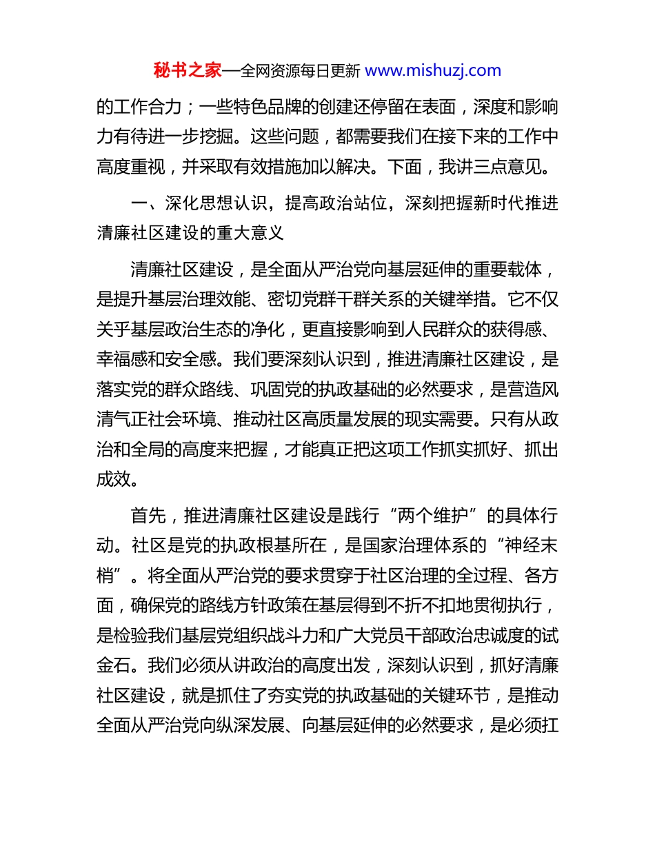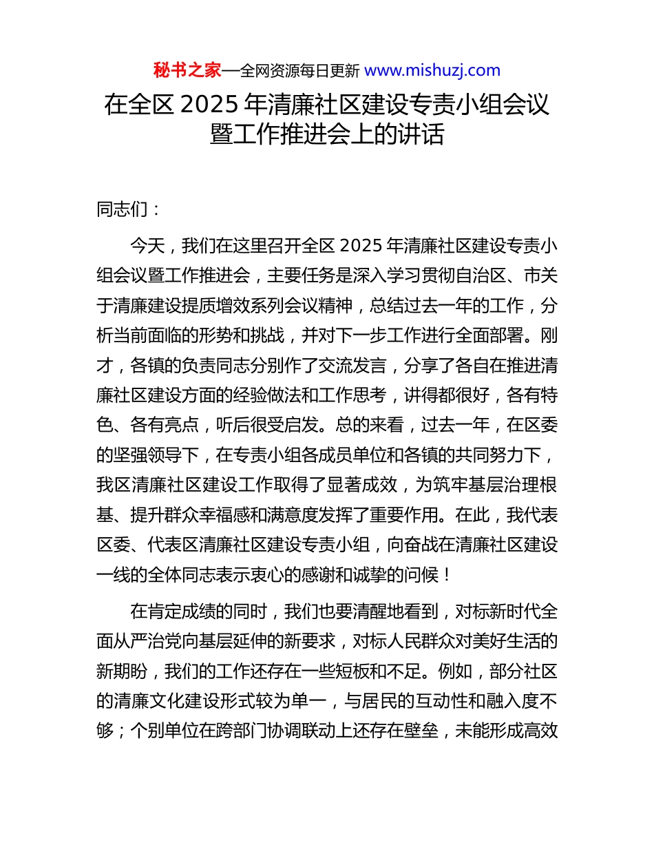 秘书之家—全网资源每日更新 www.mishuzj.com在全区 2025 年清廉社区建设专责小组会议暨工作推进会上的讲话同志们:今天,我们在这里召开全区 2025 年清廉社区建设专责小组会议暨工作推进会,主要任务是深入学习贯彻自治区、市关于清廉建设提质增效系列会议精神,总结过去一年的工作,分析当前面临的形势和挑战,并对下一步工作进行全面部署。刚才,各镇的负责同志分别作了交流发言,分享了各自在推进清廉社区建设方面的经验做法和工作思考,讲得都很好,各有特色、各有亮点,听后很受启发。总的来看,过去一年,在区委的坚强领导下,在专责小组各成员单位和各镇的共同努力下,我区清廉社区建设工作取得了显著成效,为筑牢基层治理根基、提升群众幸福感和满意度发挥了重要作用。在此,我代表区委、代表区清廉社区建设专责小组,向奋战在清廉社区建设一线的全体同志表示衷心的感谢和诚挚的问候!在肯定成绩的同时,我们也要清醒地看到,对标新时代全面从严治党向基层延伸的新要求,对标人民群众对美好生活的新期盼,我们的工作还存在一些短板和不足。例如,部分社区的清廉文化建设形式较为单一,与居民的互动性和融入度不够;个别单位在跨部门协调联动上还存在壁垒,未能形成高效秘书之家—全网资源每日更新 www.mishuzj.com的工作合力;一些特色品牌的创建还停留在表面,深度和影响力有待进一步挖掘。这些问题,都需要我们在接下来的工作中高度重视,并采取有效措施加以解决。下面,我讲三点意见。一、深化思想认识,提高政治站位,深刻把握新时代推进清廉社区建设的重大意义清廉社区建设,是全面从严治党向基层延伸的重要载体,是提升基层治理效能、密切党群干群关系的关键举措。它不仅关乎基层政治生态的净化,更直接影响到人民群众的获得感、幸福感和安全感。我们要深刻认识到,推进清廉社区建设,是落实党的群众路线、巩固党的执政基础的必然要求,是营造风清气正社会环境、推动社区高质量发展的现实需要。只有从政治和全局的高度来把握,才能真正把这项工作抓实抓好、抓出成效。首先,推进清廉社区建设是践行“两个维护”的具体行动。社区是党的执政根基所在,是国家治理体系的“神经末梢”。将全面从严治党的要求贯穿于社区治理的全过程、各方面,确保党的路线方针政策在基层得到不折不扣地贯彻执行,是检验我们基层党组织战斗力和广大党员干部政治忠诚度的试金石。我们必须从讲政治的高度出发,深刻认识到,抓好清廉社区建设,就是抓住了夯实党的执政基础的关键环节,是推动全面从严治党向纵深发展、向基层延伸的必然要求,是必须扛秘书之家—全网资源每日更新 www.mishuzj.com起的重大政治责任。其次,推进清廉社区建设是密切党群干群关系的现实需要。社区是党和政府联系服务群众的“最后一公里”,社区干部的言谈举止、作风形象,直接关系到人民群众对党和政府的信任与拥护。近年来,我们通过一系列专项整治行动,严肃查处了发生在群众身边的不正之风和腐败问题,但我们必须认识到,反腐败斗争的形势依然严峻复杂。只有持续用力、久久为功,通过清廉社区建设,让权力在阳光下运行,让干部习惯在监督下工作,让群众的急难愁盼问题得到及时有效解决,才能真正赢得民心,不断巩固党同人民群众的血肉联系。根据我们去年的统计数据,通过深化“党建+网格+大数据”治理模式,全区累计收集群众反映问题 1722 件,已解决 1673 件,群众满意度高达 99.82%。这一数据充分说明,清廉高效的服务是赢得群众认可的最有效途径。最后,推进清廉社区建设是提升基层治理效能的有力抓手。清廉是战斗力,也是生产力。一个风清气正的社区环境,能够有效激发社会活力,凝聚发展共识,降低治理成本。通过清廉社区建设,我们不仅要规范“小微权力”运行,防治“微腐败”,更要树立清正廉洁的价值导向,培育健康向上的社区文化,营造崇廉尚洁的社会风尚。这对于构建共建共治共享的社会治理格局,防范化解基层矛盾风险,提升社区治理体系和治理能力现代化水平,具有不可替代的重要作用。我们打造的秘书之家—全网资源每日更新 www.mishuzj.com“清风馆”廉政文化教育基地,已成为我区党...