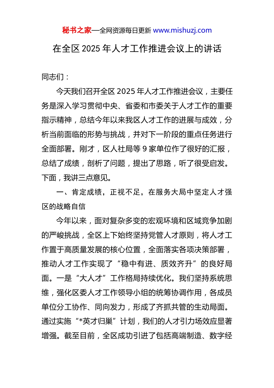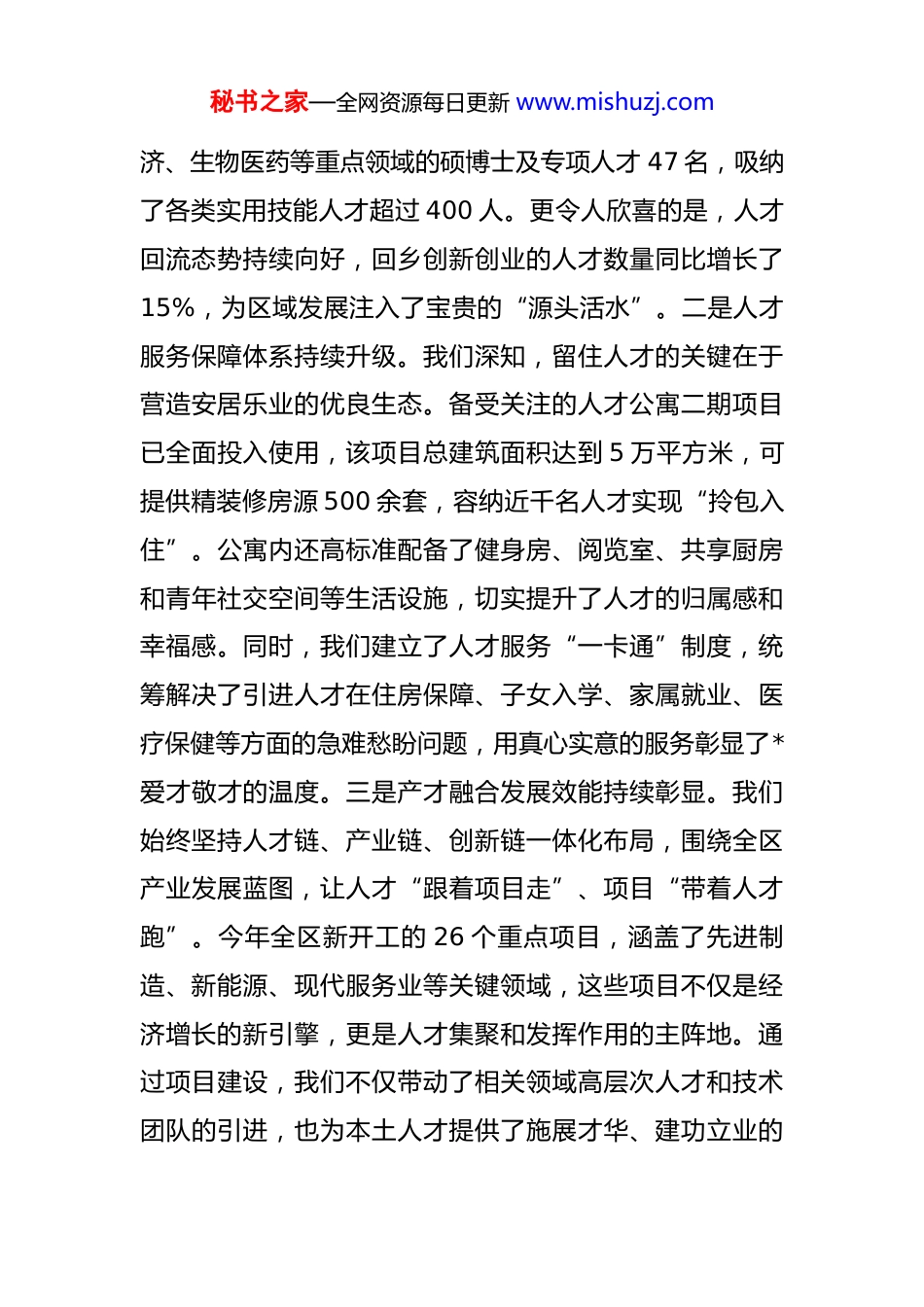 秘书之家—全网资源每日更新 www.mishuzj.com在全区 2025 年人才工作推进会议上的讲话 同志们:今天我们召开全区 2025 年人才工作推进会议,主要任务是深入学习贯彻中央、省委和市委关于人才工作的重要指示精神,总结今年以来我区人才工作的进展与成效,分析当前面临的形势与挑战,并对下一阶段的重点任务进行全面部署。刚才,区人社局等 9 家单位作了很好的汇报,总结了成绩,剖析了问题,提出了思路,听了很受启发。下面,我讲三点意见。一、肯定成绩,正视不足,在服务大局中坚定人才强区的战略自信今年以来,面对复杂多变的宏观环境和区域竞争加剧的严峻挑战,全区上下始终坚持党管人才原则,将人才工作置于高质量发展的核心位置,全面落实各项决策部署,推动人才工作实现了“稳中有进、质效齐升”的良好局面。一是“大人才”工作格局持续优化。我们坚持系统思维,强化区委人才工作领导小组的统筹协调作用,各成员单位分工协作、同向发力,形成了齐抓共管的生动局面。通过实施“*英才归巢”计划,我们的人才引力场效应显著增强。截至目前,全区成功引进了包括高端制造、数字经秘书之家—全网资源每日更新 www.mishuzj.com济、生物医药等重点领域的硕博士及专项人才 47 名,吸纳了各类实用技能人才超过 400 人。更令人欣喜的是,人才回流态势持续向好,回乡创新创业的人才数量同比增长了15%,为区域发展注入了宝贵的“源头活水”。二是人才服务保障体系持续升级。我们深知,留住人才的关键在于营造安居乐业的优良生态。备受关注的人才公寓二期项目已全面投入使用,该项目总建筑面积达到 5 万平方米,可提供精装修房源 500 余套,容纳近千名人才实现“拎包入住”。公寓内还高标准配备了健身房、阅览室、共享厨房和青年社交空间等生活设施,切实提升了人才的归属感和幸福感。同时,我们建立了人才服务“一卡通”制度,统筹解决了引进人才在住房保障、子女入学、家属就业、医疗保健等方面的急难愁盼问题,用真心实意的服务彰显了*爱才敬才的温度。三是产才融合发展效能持续彰显。我们始终坚持人才链、产业链、创新链一体化布局,围绕全区产业发展蓝图,让人才“跟着项目走”、项目“带着人才跑”。今年全区新开工的 26 个重点项目,涵盖了先进制造、新能源、现代服务业等关键领域,这些项目不仅是经济增长的新引擎,更是人才集聚和发挥作用的主阵地。通过项目建设,我们不仅带动了相关领域高层次人才和技术团队的引进,也为本土人才提供了施展才华、建功立业的秘书之家—全网资源每日更新 www.mishuzj.com广阔舞台,实现了人才发展与产业升级的同频共振。在肯定成绩的同时,我们必须清醒地认识到,对标高质量发展的要求,对标先进地区的实践,我区的人才工作仍存在一些不容忽视的短板和弱项。主要体现在:一是人才结构尚需优化,能够引领产业变革的顶尖人才和战略科学家仍然稀缺,高技能领军人才和青年科技人才储备不足的问题依然存在。二是人才效能释放不够充分,部分领域存在人才评价标准单一、激励机制不够灵活、产学研用结合不够紧密等问题,人才的创新活力未能完全激发。三是人才生态仍有提升空间,人才服务的精细化、专业化水平有待提高,全社会识才、爱才、敬才、用才的氛围还需要进一步营造。对于这些问题,我们必须高度重视,拿出切实可行的措施,在今后的工作中认真加以解决。二、聚焦重点,精准发力,在“引育留用”全链条上实现新突破做好新时代人才工作,必须坚持问题导向和目标导向相统一,紧扣全区经济社会发展的中心任务,在“引、育、留、用”四个关键环节上持续用力、久久为功,努力让各类人才的创造活力竞相迸发、聪明才智充分涌流。第一,聚焦“高精尖缺”,在“引”才上实现新突破。引才是人才工作的先手棋。要构建更具竞争力的引才秘书之家—全网资源每日更新 www.mishuzj.com体系,变“大水漫灌”为“精准滴灌”。一要围绕产业“靶向引”。紧密对接我区 26 个重点项目和“四新”经济发展需求,编制发布《*区重点产业紧缺人才目录》,绘制“产业人才地图”,按图索骥,精准引进一批能够突破关键技术、发展高新产业、带动新兴学科的领...