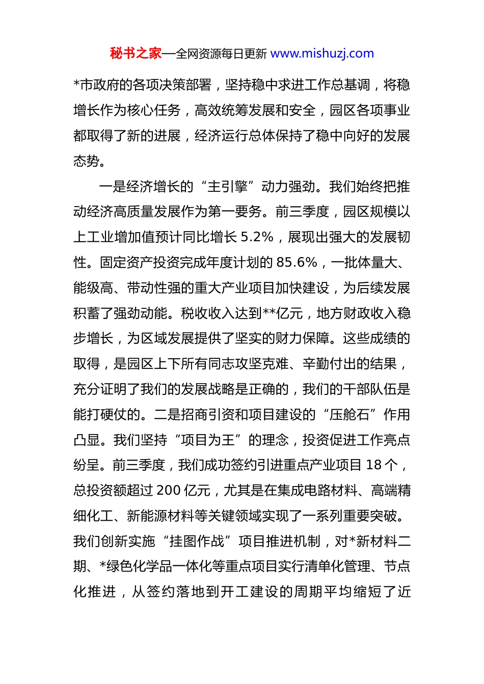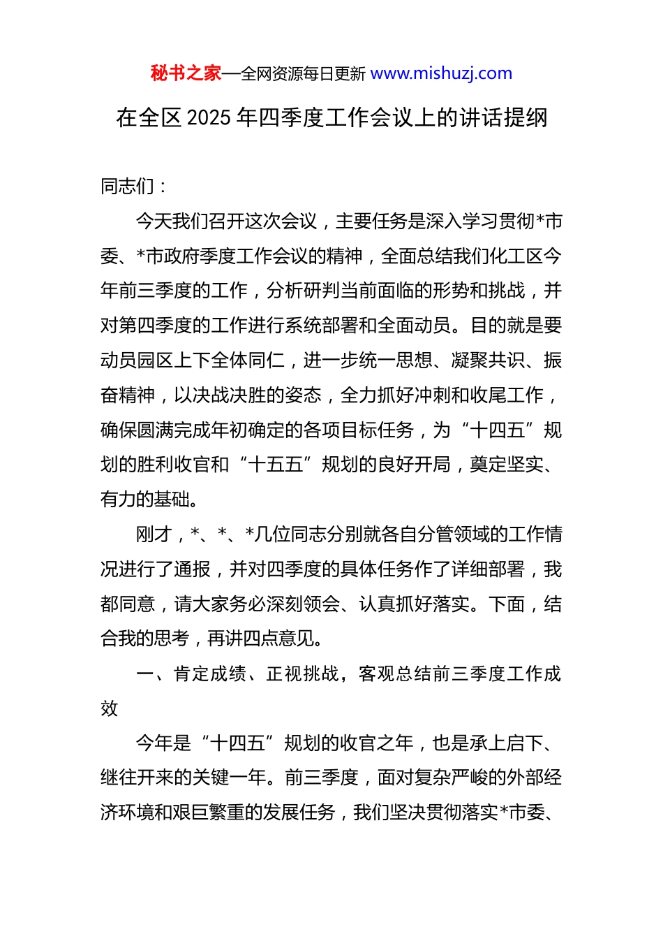 秘书之家—全网资源每日更新 www.mishuzj.com在全区 2025 年四季度工作会议上的讲话提纲 同志们:今天我们召开这次会议,主要任务是深入学习贯彻*市委、*市政府季度工作会议的精神,全面总结我们化工区今年前三季度的工作,分析研判当前面临的形势和挑战,并对第四季度的工作进行系统部署和全面动员。目的就是要动员园区上下全体同仁,进一步统一思想、凝聚共识、振奋精神,以决战决胜的姿态,全力抓好冲刺和收尾工作,确保圆满完成年初确定的各项目标任务,为“十四五”规划的胜利收官和“十五五”规划的良好开局,奠定坚实、有力的基础。刚才,*、*、*几位同志分别就各自分管领域的工作情况进行了通报,并对四季度的具体任务作了详细部署,我都同意,请大家务必深刻领会、认真抓好落实。下面,结合我的思考,再讲四点意见。一、肯定成绩、正视挑战,客观总结前三季度工作成效今年是“十四五”规划的收官之年,也是承上启下、继往开来的关键一年。前三季度,面对复杂严峻的外部经济环境和艰巨繁重的发展任务,我们坚决贯彻落实*市委、秘书之家—全网资源每日更新 www.mishuzj.com*市政府的各项决策部署,坚持稳中求进工作总基调,将稳增长作为核心任务,高效统筹发展和安全,园区各项事业都取得了新的进展,经济运行总体保持了稳中向好的发展态势。一是经济增长的“主引擎”动力强劲。我们始终把推动经济高质量发展作为第一要务。前三季度,园区规模以上工业增加值预计同比增长 5.2%,展现出强大的发展韧性。固定资产投资完成年度计划的 85.6%,一批体量大、能级高、带动性强的重大产业项目加快建设,为后续发展积蓄了强劲动能。税收收入达到**亿元,地方财政收入稳步增长,为区域发展提供了坚实的财力保障。这些成绩的取得,是园区上下所有同志攻坚克难、辛勤付出的结果,充分证明了我们的发展战略是正确的,我们的干部队伍是能打硬仗的。二是招商引资和项目建设的“压舱石”作用凸显。我们坚持“项目为王”的理念,投资促进工作亮点纷呈。前三季度,我们成功签约引进重点产业项目 18 个,总投资额超过 200 亿元,尤其是在集成电路材料、高端精细化工、新能源材料等关键领域实现了一系列重要突破。我们创新实施“挂图作战”项目推进机制,对*新材料二期、*绿色化学品一体化等重点项目实行清单化管理、节点化推进,从签约落地到开工建设的周期平均缩短了近秘书之家—全网资源每日更新 www.mishuzj.com20%,项目推进效率显著提升。这种高效的服务和务实的作风,赢得了企业的高度赞誉,也擦亮了我们园区的“金字招牌”。三是创新驱动和产业转型的“新动能”加速集聚。我们深刻认识到,惟创新者进,惟创新者强。科创中心建设实现提质增效,成功引入了 3 家国家级企业技术中心和 5 个市级研发平台,与多所国内外顶尖高校和科研院所建立了实质性的产学研合作关系。特别是在电子化学品这一“卡脖子”领域,我们规划建设的电子化学品专区已初具规模,光刻胶、电子特气、高纯湿电子化学品等关键材料的本土化进程正在加速。这标志着我们的产业结构正在从传统的规模扩张,向更高附加值、更高技术含量的价值链高端攀升。四是安全环保的“生命线”牢固筑守。对于化工园区而言,安全和环保是不可逾越的红线和底线。我们始终以“零容忍”的态度,持续加大安全环保监管力度。今年以来,我们累计开展各类安全环保专项检查超过500 次,排查并整改隐患 2100 余项,重大隐患整改完成率达到 100%。我们必须深刻吸取近年来国内一些地区化工园区发生的重特大安全事故的惨痛教训,通过引入第三方专业机构、运用数字化监控平台、强化双重预防机制建设等手段,园区本质安全水平得到系统性提升。前三季度,园区未发生一起重大安全生产事故和突发环境事件,秘书之家—全网资源每日更新 www.mishuzj.com安全环保形势总体平稳可控。五是党的建设和作风建设的“软实力”有效提升。我们坚持以高质量党建引领高质量发展,扎实开展主题教育,引导广大党员干部筑牢信仰之基、补足精神之钙。我们大力整治“慵懒散等靠要”等作风顽疾,倡导“马上就办、真抓实干”的工作作风。管委会带头深入一线...