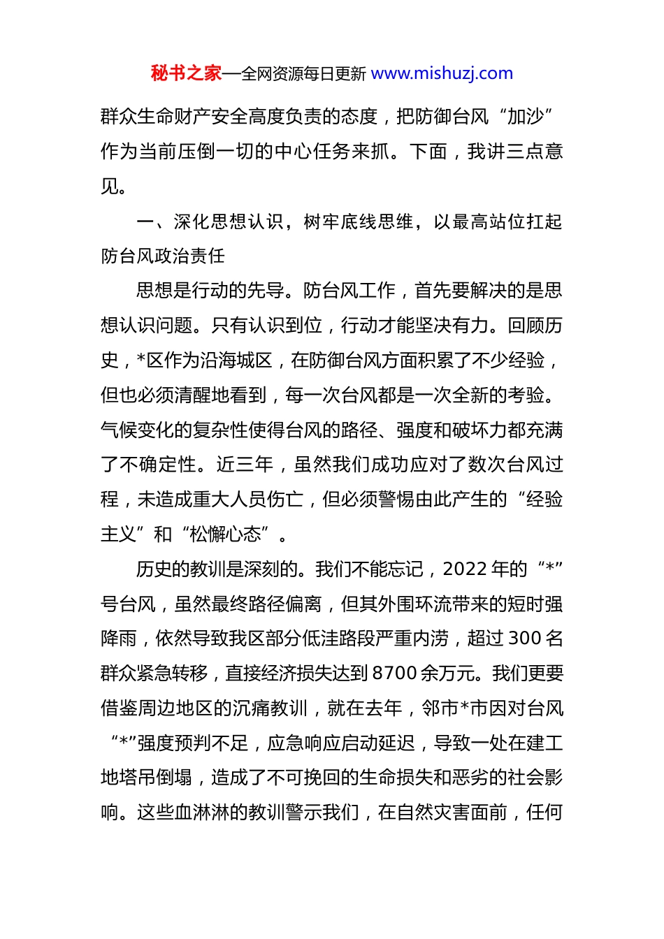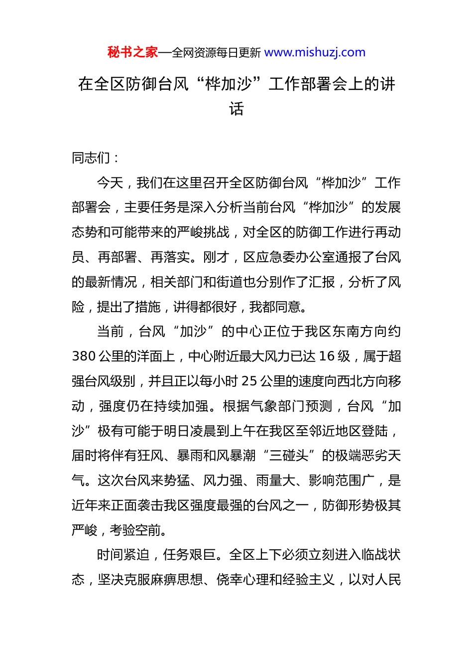 秘书之家—全网资源每日更新 www.mishuzj.com在全区防御台风“桦加沙”工作部署会上的讲话 同志们:今天,我们在这里召开全区防御台风“桦加沙”工作部署会,主要任务是深入分析当前台风“桦加沙”的发展态势和可能带来的严峻挑战,对全区的防御工作进行再动员、再部署、再落实。刚才,区应急委办公室通报了台风的最新情况,相关部门和街道也分别作了汇报,分析了风险,提出了措施,讲得都很好,我都同意。当前,台风“加沙”的中心正位于我区东南方向约380 公里的洋面上,中心附近最大风力已达 16 级,属于超强台风级别,并且正以每小时 25 公里的速度向西北方向移动,强度仍在持续加强。根据气象部门预测,台风“加沙”极有可能于明日凌晨到上午在我区至邻近地区登陆,届时将伴有狂风、暴雨和风暴潮“三碰头”的极端恶劣天气。这次台风来势猛、风力强、雨量大、影响范围广,是近年来正面袭击我区强度最强的台风之一,防御形势极其严峻,考验空前。时间紧迫,任务艰巨。全区上下必须立刻进入临战状态,坚决克服麻痹思想、侥幸心理和经验主义,以对人民秘书之家—全网资源每日更新 www.mishuzj.com群众生命财产安全高度负责的态度,把防御台风“加沙”作为当前压倒一切的中心任务来抓。下面,我讲三点意见。一、深化思想认识,树牢底线思维,以最高站位扛起防台风政治责任思想是行动的先导。防台风工作,首先要解决的是思想认识问题。只有认识到位,行动才能坚决有力。回顾历史,*区作为沿海城区,在防御台风方面积累了不少经验,但也必须清醒地看到,每一次台风都是一次全新的考验。气候变化的复杂性使得台风的路径、强度和破坏力都充满了不确定性。近三年,虽然我们成功应对了数次台风过程,未造成重大人员伤亡,但必须警惕由此产生的“经验主义”和“松懈心态”。历史的教训是深刻的。我们不能忘记,2022 年的“*”号台风,虽然最终路径偏离,但其外围环流带来的短时强降雨,依然导致我区部分低洼路段严重内涝,超过 300 名群众紧急转移,直接经济损失达到 8700 余万元。我们更要借鉴周边地区的沉痛教训,就在去年,邻市*市因对台风“*”强度预判不足,应急响应启动延迟,导致一处在建工地塔吊倒塌,造成了不可挽回的生命损失和恶劣的社会影响。这些血淋淋的教训警示我们,在自然灾害面前,任何秘书之家—全网资源每日更新 www.mishuzj.com的疏忽和懈怠,都可能付出惨痛的代价。因此,全区各级各部门必须牢固树立“人民至上、生命至上”的理念,将底线思维和极限思维贯穿于防台风工作的全过程、各环节。要把保障人民群众生命安全放在第一位,作为衡量我们工作成败的唯一标准。区委、区政府已经明确,此次防台风工作是一场必须打赢的硬仗,是对我们各级干部治理能力和责任担当的一次集中检验。各单位主要负责同志要亲自部署、亲自检查、亲自督导,层层压实责任,确保各项防御指令不折不扣地传达到每一个岗位、每一个人,真正做到守土有责、守土负责、守土尽责。二、聚焦关键环节,突出防御重点,以最实举措构筑坚固安全防线防御工作千头万绪,必须抓住主要矛盾,突出重点,精准发力。根据台风“桦加沙”的特点和我区的实际情况,当前及今后一段时间,要集中力量抓好以下四个方面的工作。第一,人员转移安置必须坚决果断。确保群众生命安全是防台风工作的核心。人员转移是避免群死群伤最直接、最有效的手段。各街道、各部门要对照各自的“险村(居)险户应急转移安置”清单,立即组织力量进行最后一次核实、更新和确认。对于居住在低洼易涝区、地质灾秘书之家—全网资源每日更新 www.mishuzj.com害隐患点、危旧房屋、简易工棚、海边养殖场以及在建工地临建设施内的人员,必须在今天(23 日)20 时前,完成全部强制性转移,做到“应转尽转、应转早转”,不漏一户、不落一人。在转移过程中,要特别关注独居老人、留守儿童、残疾人等特殊群体,落实“一对一”的帮扶责任人,确保他们得到妥善安置。全区已开放的*处应急避护场所,要保障食品、饮用水、药品和基本生活用品供应充足,确保转移群众有饭吃、有水喝、有衣穿、有地方住、有病能医。公安部门要加强对已转移...
