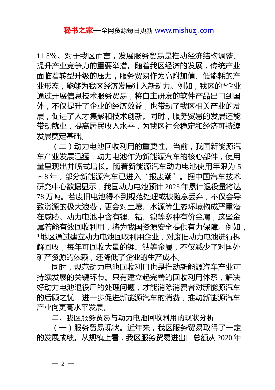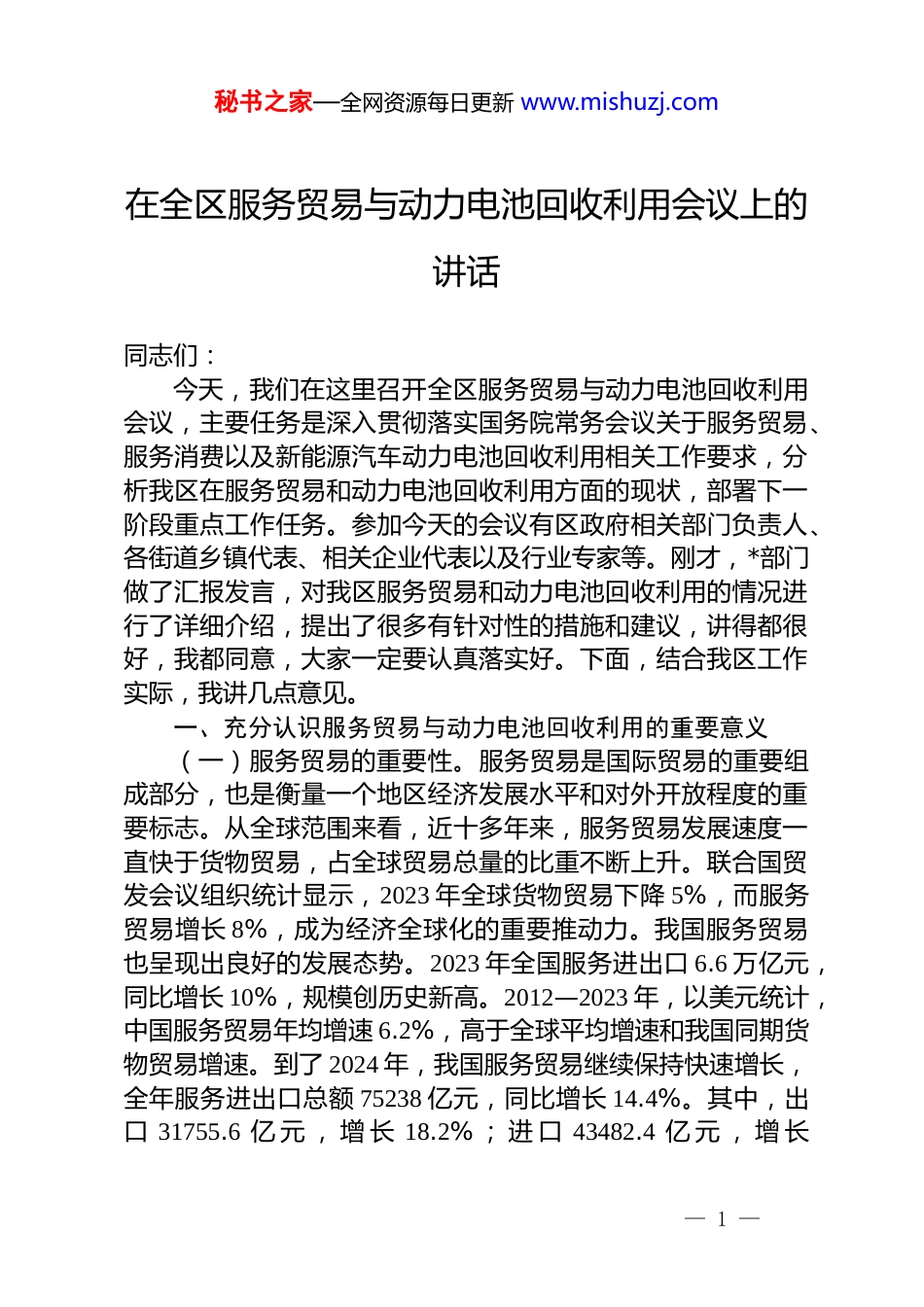 秘书之家—全网资源每日更新 www.mishuzj.com在全区服务贸易与动力电池回收利用会议上的讲话同志们:今天,我们在这里召开全区服务贸易与动力电池回收利用会议,主要任务是深入贯彻落实国务院常务会议关于服务贸易、服务消费以及新能源汽车动力电池回收利用相关工作要求,分析我区在服务贸易和动力电池回收利用方面的现状,部署下一阶段重点工作任务。参加今天的会议有区政府相关部门负责人、各街道乡镇代表、相关企业代表以及行业专家等。刚才,*部门做了汇报发言,对我区服务贸易和动力电池回收利用的情况进行了详细介绍,提出了很多有针对性的措施和建议,讲得都很好,我都同意,大家一定要认真落实好。下面,结合我区工作实际,我讲几点意见。一、充分认识服务贸易与动力电池回收利用的重要意义(一)服务贸易的重要性。服务贸易是国际贸易的重要组成部分,也是衡量一个地区经济发展水平和对外开放程度的重要标志。从全球范围来看,近十多年来,服务贸易发展速度一直快于货物贸易,占全球贸易总量的比重不断上升。联合国贸发会议组织统计显示,2023 年全球货物贸易下降 5%,而服务贸易增长 8%,成为经济全球化的重要推动力。我国服务贸易也呈现出良好的发展态势。2023 年全国服务进出口 6.6 万亿元,同比增长 10%,规模创历史新高。2012—2023 年,以美元统计,中国服务贸易年均增速 6.2%,高于全球平均增速和我国同期货物贸易增速。到了 2024 年,我国服务贸易继续保持快速增长,全年服务进出口总额 75238 亿元,同比增长 14.4%。其中,出口 31755.6 亿 元 , 增 长 18.2% ; 进 口 43482.4 亿 元 , 增 长— 1 —秘书之家—全网资源每日更新 www.mishuzj.com11.8%。对于我区而言,发展服务贸易是推动经济结构调整、提升产业竞争力的重要举措。随着我区经济的发展,传统产业面临着转型升级的压力,服务贸易作为高附加值、低能耗的产业形态,能够为我区经济发展注入新动力。例如,我区的*企业通过开展信息技术服务贸易,将自主研发的软件产品出口到国外,不仅提升了企业的经济效益,也带动了我区相关产业的发展,促进了人才集聚和技术创新。同时,服务贸易的发展还能带动就业,提高居民收入水平,为我区社会稳定和经济可持续发展奠定基础。(二)动力电池回收利用的重要性。当前,我国新能源汽车产业发展迅猛,动力电池作为新能源汽车的核心部件,使用量呈现出井喷式增长。随着新能源汽车动力电池使用年限为 5~8 年,部分新能源汽车已进入“报废潮”。据中国汽车技术研究中心数据显示,我国动力电池预计 2025 年累计退役量将达78 万吨。若废旧电池得不到规范处理或被随意丢弃,不仅会导致资源的极大浪费,更会对土壤、水源等生态环境构成严重潜在威胁。动力电池中含有锂、钴、镍等多种有价金属,这些金属若能有效回收利用,将为我国资源安全提供有力保障。例如,*地区通过建立动力电池回收利用企业,对废旧动力电池进行拆解回收,每年可回收大量的锂、钴等金属,不仅减少了对国外矿产资源的依赖,还降低了企业的生产成本。同时,规范动力电池回收利用也是推动新能源汽车产业可持续发展的关键环节。只有建立起完善的回收利用体系,解决好动力电池退役后的处理问题,才能消除消费者对新能源汽车的后顾之忧,进一步促进新能源汽车的消费,推动新能源汽车产业向更高水平发展。二、我区服务贸易与动力电池回收利用的现状分析(一)服务贸易现状。近年来,我区服务贸易取得了一定的发展成绩。从规模上看,我区服务贸易进出口总额从 2020 年— 2 —秘书之家—全网资源每日更新 www.mishuzj.com的亿元增长到 2024 年的亿元,年均增长率达到*%。其中,服务出口额从亿元增长到亿元,进口额从亿元增长到亿元。在结构方面,知识密集型服务贸易占比逐渐提高。2024 年,我区知识密集型服务贸易占服务贸易总额的比重达到*%,较 2020 年提高了*个百分点。其中,信息技术服务、知识产权服务等领域发展迅速,成为我区服务贸易的新增长点。例如,科技企业的知识产权服务出口额从 2020 年的万元增长到 2024 年的万元,年均增长率超过*%。然...