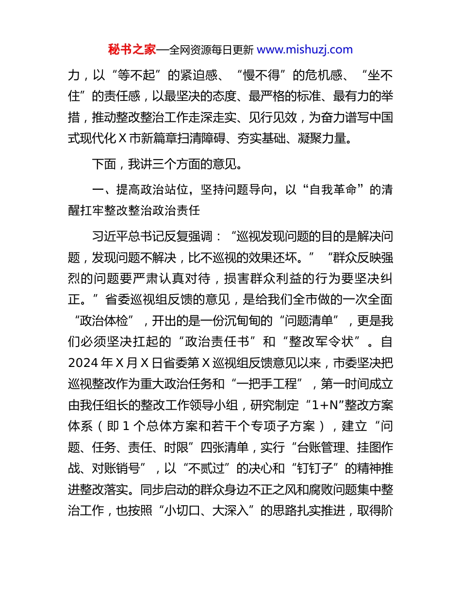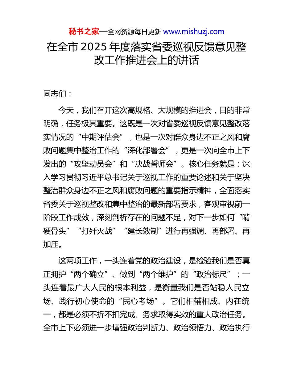 秘书之家—全网资源每日更新 www.mishuzj.com在全市 2025 年度落实省委巡视反馈意见整改工作推进会上的讲话同志们:今天,我们召开这次高规格、大规模的推进会,目的非常明确,任务极其重要。这既是一次对省委巡视反馈意见整改落实情况的“中期评估会”,也是一次对群众身边不正之风和腐败问题集中整治工作的“深化部署会”,更是一次向全市上下发出的“攻坚动员会”和“决战誓师会”。核心任务就是:深入学习贯彻习近平总书记关于巡视工作的重要论述和关于坚决整治群众身边不正之风和腐败问题的重要指示精神,全面落实省委关于巡视整改和集中整治的最新部署要求,客观审视前一阶段工作成效,深刻剖析存在的问题不足,对下一步如何“啃硬骨头”“打歼灭战”“建长效制”进行再强调、再部署、再加压。这两项工作,一头连着党的政治建设,是检验我们是否真正拥护“两个确立”、做到“两个维护”的“政治标尺”;一头连着最广大人民的根本利益,是衡量我们是否站稳人民立场、践行初心使命的“民心考场”。它们相辅相成、内在统一,都是必须不折不扣完成、务求取得实效的重大政治任务。全市上下必须进一步增强政治判断力、政治领悟力、政治执行秘书之家—全网资源每日更新 www.mishuzj.com力,以“等不起”的紧迫感、“慢不得”的危机感、“坐不住”的责任感,以最坚决的态度、最严格的标准、最有力的举措,推动整改整治工作走深走实、见行见效,为奋力谱写中国式现代化 X 市新篇章扫清障碍、夯实基础、凝聚力量。下面,我讲三个方面的意见。一、提高政治站位,坚持问题导向,以“自我革命”的清醒扛牢整改整治政治责任习近平总书记反复强调:“巡视发现问题的目的是解决问题,发现问题不解决,比不巡视的效果还坏。”“群众反映强烈的问题要严肃认真对待,损害群众利益的行为要坚决纠正。”省委巡视组反馈的意见,是给我们全市做的一次全面“政治体检”,开出的是一份沉甸甸的“问题清单”,更是我们必须坚决扛起的“政治责任书”和“整改军令状”。自2024 年 X 月 X 日省委第 X 巡视组反馈意见以来,市委坚决把巡视整改作为重大政治任务和“一把手工程”,第一时间成立由我任组长的整改工作领导小组,研究制定“1+N”整改方案体系(即 1 个总体方案和若干个专项子方案),建立“问题、任务、责任、时限”四张清单,实行“台账管理、挂图作战、对账销号”,以“不贰过”的决心和“钉钉子”的精神推进整改落实。同步启动的群众身边不正之风和腐败问题集中整治工作,也按照“小切口、大深入”的思路扎实推进,取得阶秘书之家—全网资源每日更新 www.mishuzj.com段性成效。例如,在惠民惠农财政补贴资金“一卡通”管理领域,我们排查发现并整改问题 X 个,清退追缴违规资金 X 万元,处理处分 X 人,推动建立完善制度机制 X 项;在教育医疗领域,查处了一批违规收费、吃拿卡要、套取医保基金等突出问题,群众满意度有所提升。这些成绩的取得,是全市各级党组织和广大党员干部共同努力、辛勤付出的结果,值得肯定。但是,我们必须保持清醒的头脑,绝不能有丝毫的骄傲自满和松劲歇脚思想。对照省委的高标准、严要求,对照人民群众的热切期盼,我们的工作还存在不少短板、弱项和隐忧,整改整治远未到“鸣金收兵”“刀枪入库”的时候。从巡视整改看:一是部分单位存在“过关”心态和“交卷”思想。有的满足于“文件整改”“会议整改”,对反馈问题背后的体制机制弊端、深层次矛盾“绕着走”“躲着改”,整改措施不触及实质、不伤筋动骨。比如,针对优化营商环境方面指出的“行政审批环节多、时间长”问题,有的部门仅仅精简了几个非核心流程,对“信息孤岛”、部门壁垒等根本性问题缺乏有效破解之策。二是“纸面整改”“数字整改”现象仍未杜绝。个别地方和单位整改报告写得“天花乱坠”,但实际效果“大打折扣”;有的承诺的整改时限一拖再拖,所谓的“已完成”整改经不起“回头看”的检验。比如,一些历史遗留的工程项目问题,整改方案明确了时间表,但实际推进缓慢,群众反映强秘书之家—全网资源每日更新 www.mishuzj.com烈。三是整改压力传导存在“上热中温下冷...