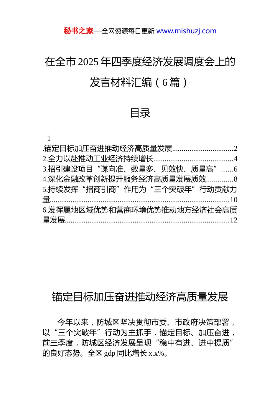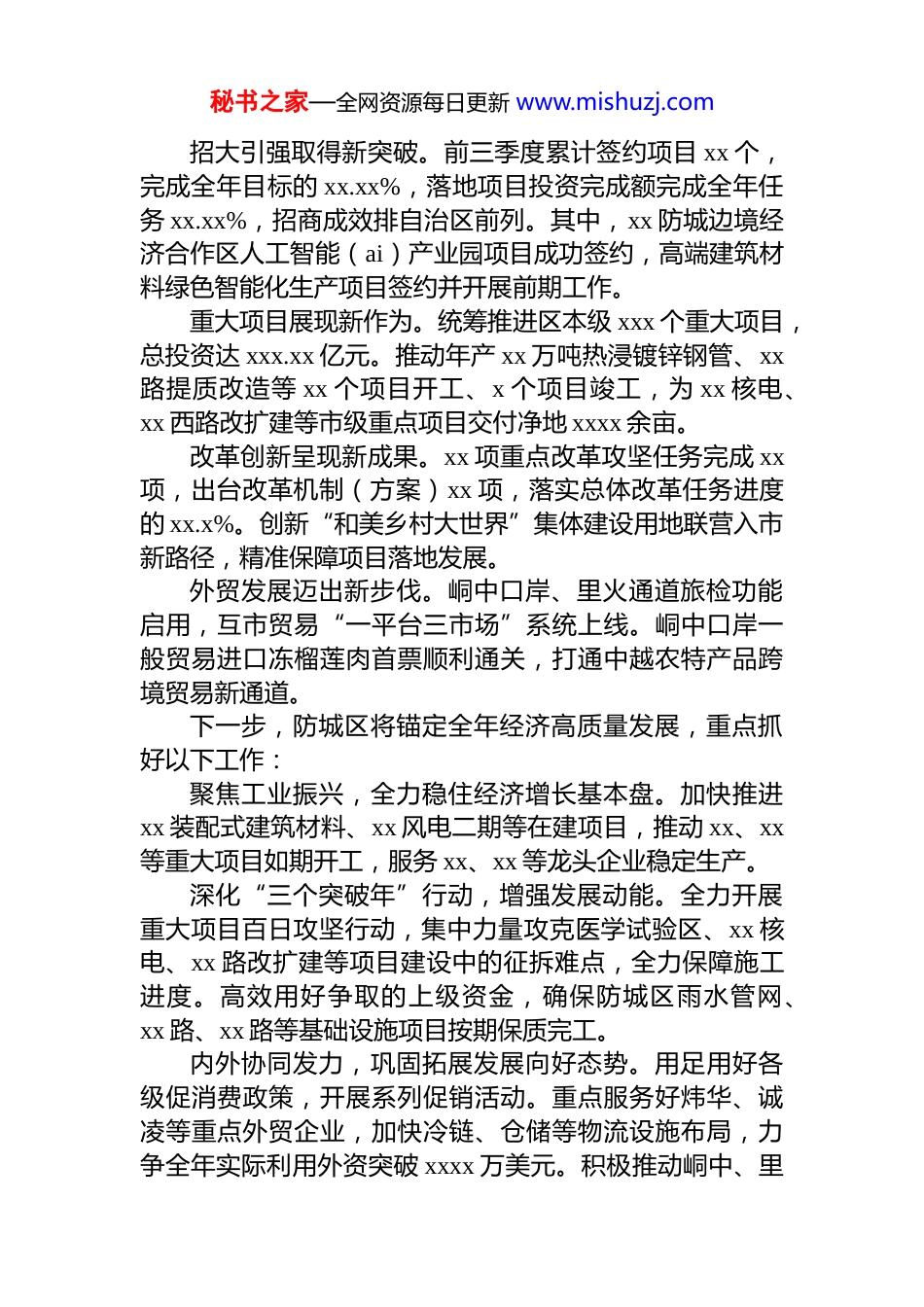 秘书之家—全网资源每日更新 www.mishuzj.com在全市 2025 年四季度经济发展调度会上的发言材料汇编(6 篇)目录1.锚定目标加压奋进推动经济高质量发展................................22.全力以赴推动工业经济持续增长..........................................43.招引建设项目“谋向准、数量多、见效快、质量高”......64.深化金融改革创新提升服务经济高质量发展质效..............85.持续发挥“招商引商”作用为“三个突破年”行动贡献力量...............................................................................................106.发挥属地区域优势和营商环境优势推动地方经济社会高质量发展.......................................................................................12锚定目标加压奋进推动经济高质量发展今年以来,防城区坚决贯彻市委、市政府决策部署,以“三个突破年”行动为主抓手,锚定目标、加压奋进,前三季度,防城区经济发展呈现“稳中有进、进中提质”的良好态势。全区 gdp 同比增长 x.x%。秘书之家—全网资源每日更新 www.mishuzj.com招大引强取得新突破。前三季度累计签约项目 xx 个,完成全年目标的 xx.xx%,落地项目投资完成额完成全年任务 xx.xx%,招商成效排自治区前列。其中,xx 防城边境经济合作区人工智能(ai)产业园项目成功签约,高端建筑材料绿色智能化生产项目签约并开展前期工作。重大项目展现新作为。统筹推进区本级 xxx 个重大项目,总投资达 xxx.xx 亿元。推动年产 xx 万吨热浸镀锌钢管、xx路提质改造等 xx 个项目开工、x 个项目竣工,为 xx 核电、xx 西路改扩建等市级重点项目交付净地 xxxx 余亩。改革创新呈现新成果。xx 项重点改革攻坚任务完成 xx项,出台改革机制(方案)xx 项,落实总体改革任务进度的 xx.x%。创新“和美乡村大世界”集体建设用地联营入市新路径,精准保障项目落地发展。外贸发展迈出新步伐。峒中口岸、里火通道旅检功能启用,互市贸易“一平台三市场”系统上线。峒中口岸一般贸易进口冻榴莲肉首票顺利通关,打通中越农特产品跨境贸易新通道。下一步,防城区将锚定全年经济高质量发展,重点抓好以下工作:聚焦工业振兴,全力稳住经济增长基本盘。加快推进xx 装配式建筑材料、xx 风电二期等在建项目,推动 xx、xx等重大项目如期开工,服务 xx、xx 等龙头企业稳定生产。深化“三个突破年”行动,增强发展动能。全力开展重大项目百日攻坚行动,集中力量攻克医学试验区、xx 核电、xx 路改扩建等项目建设中的征拆难点,全力保障施工进度。高效用好争取的上级资金,确保防城区雨水管网、xx 路、xx 路等基础设施项目按期保质完工。内外协同发力,巩固拓展发展向好态势。用足用好各级促消费政策,开展系列促销活动。重点服务好炜华、诚凌等重点外贸企业,加快冷链、仓储等物流设施布局,力争全年实际利用外资突破 xxxx 万美元。积极推动峒中、里秘书之家—全网资源每日更新 www.mishuzj.com火互市贸易点升格为互市贸易区。加快推进口岸集疏运道路建设,做好上 xx 速通车各项筹备工作。全力以赴推动工业经济持续增长今年前三季度,市工信局以“三个突破年”行动为主抓手,全力以赴推动工业经济持续增长,规上工业增加值增速同比增长 xx.x%,工业投资保持正增长,招大引强、项目建设目标任务均超额或超时序进度完成。招大引强成果丰硕。成功承办 2025 中国产业转移发展对接活动(xx)相关专题对接会、商业航天科技经贸促进活动。累计签约项目 xx 个,计划总投资 xxx.x 亿元,新引进企业实现 xxx 强及专精特新“小巨人”、独角兽企业全覆盖。项目攻坚提速增效。累计推动 xx 个工业产业项目开工、xx 个工业产业项目竣工。中丝路生态铝、白龙核电等 x 个总投资超 xx 亿元的重大项目加快建设。改革突破亮点频现。系统推进 xx 项改革任务,出台 x项制度方案,形成 xx 项全国全区首创举措及可推广经验。“智改数转”走在全区前列,卓越级智能工厂实现“零”的突破;xxai 项目是 xx 唯一入选工信部 xxxx 年制造业数字化转型典型的...