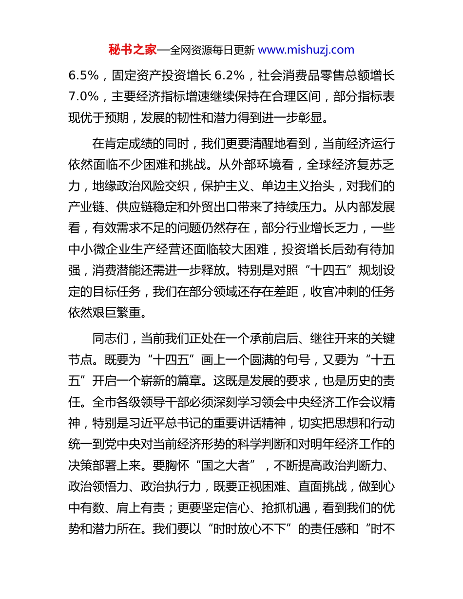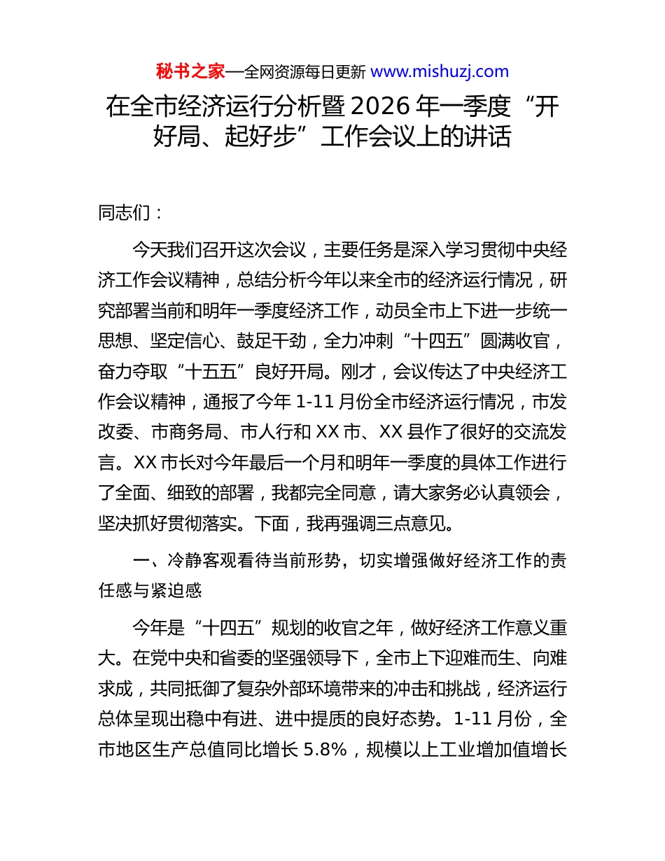 秘书之家—全网资源每日更新 www.mishuzj.com在全市经济运行分析暨 2026 年一季度“开好局、起好步”工作会议上的讲话同志们:今天我们召开这次会议,主要任务是深入学习贯彻中央经济工作会议精神,总结分析今年以来全市的经济运行情况,研究部署当前和明年一季度经济工作,动员全市上下进一步统一思想、坚定信心、鼓足干劲,全力冲刺“十四五”圆满收官,奋力夺取“十五五”良好开局。刚才,会议传达了中央经济工作会议精神,通报了今年 1-11 月份全市经济运行情况,市发改委、市商务局、市人行和 XX 市、XX 县作了很好的交流发言。XX 市长对今年最后一个月和明年一季度的具体工作进行了全面、细致的部署,我都完全同意,请大家务必认真领会,坚决抓好贯彻落实。下面,我再强调三点意见。一、冷静客观看待当前形势,切实增强做好经济工作的责任感与紧迫感今年是“十四五”规划的收官之年,做好经济工作意义重大。在党中央和省委的坚强领导下,全市上下迎难而生、向难求成,共同抵御了复杂外部环境带来的冲击和挑战,经济运行总体呈现出稳中有进、进中提质的良好态势。1-11 月份,全市地区生产总值同比增长 5.8%,规模以上工业增加值增长秘书之家—全网资源每日更新 www.mishuzj.com6.5%,固定资产投资增长 6.2%,社会消费品零售总额增长7.0%,主要经济指标增速继续保持在合理区间,部分指标表现优于预期,发展的韧性和潜力得到进一步彰显。在肯定成绩的同时,我们更要清醒地看到,当前经济运行依然面临不少困难和挑战。从外部环境看,全球经济复苏乏力,地缘政治风险交织,保护主义、单边主义抬头,对我们的产业链、供应链稳定和外贸出口带来了持续压力。从内部发展看,有效需求不足的问题仍然存在,部分行业增长乏力,一些中小微企业生产经营还面临较大困难,投资增长后劲有待加强,消费潜能还需进一步释放。特别是对照“十四五”规划设定的目标任务,我们在部分领域还存在差距,收官冲刺的任务依然艰巨繁重。同志们,当前我们正处在一个承前启后、继往开来的关键节点。既要为“十四五”画上一个圆满的句号,又要为“十五五”开启一个崭新的篇章。这既是发展的要求,也是历史的责任。全市各级领导干部必须深刻学习领会中央经济工作会议精神,特别是习近平总书记的重要讲话精神,切实把思想和行动统一到党中央对当前经济形势的科学判断和对明年经济工作的决策部署上来。要胸怀“国之大者”,不断提高政治判断力、政治领悟力、政治执行力,既要正视困难、直面挑战,做到心中有数、肩上有责;更要坚定信心、抢抓机遇,看到我们的优势和潜力所在。我们要以“时时放心不下”的责任感和“时不秘书之家—全网资源每日更新 www.mishuzj.com我待、只争朝夕”的紧迫感,凝神聚力拼经济、抓改革、促发展、惠民生,以决战决胜的姿态,奋力交出一份经得起历史和人民检验的优异答卷。二、聚焦重点任务精准发力,全力推动经济社会高质量发展行稳致远做好当前和今后一个时期的经济工作,必须坚持稳中求进、以进促稳、先立后破的总基调,统筹好质的有效提升和量的合理增长。具体来说,就是要抓好两件大事:一是全力冲刺,确保“十四五”圆满收官;二是科学谋划,奋力实现“十五五”良好开局。第一,全力冲刺,确保“十四五”圆满收官。距离年底只剩下不到两周时间,每一天都至关重要。全市上下要发起最后的总攻,紧盯目标不放松,查漏补缺,奋力冲刺,尽最大努力争取最好结果。一要紧盯指标抓调度。要对照年初确定的各项目标任务,进行最后一次全面盘点。市发改、统计、工信等部门要加强对重点地区、重点行业、重点企业的监测分析和精准调度,特别是对工业增加值、固定资产投资、财税收入等支撑性指标,要逐项分析、找出差距、强化举措。对增长快于预期的,要再添一把火,巩固扩大优势;对未达进度的,要集中资源、精准施策,迎头赶上。各县(市、区)的党政主要负责同志要亲自秘书之家—全网资源每日更新 www.mishuzj.com抓、负总责,确保各项指标圆满收官。二要聚焦实体抓服务。企业是经济的细胞,稳企业就是稳增长、稳就业。要持续深化“百名干部进百企”活动,各级领导干部要主...