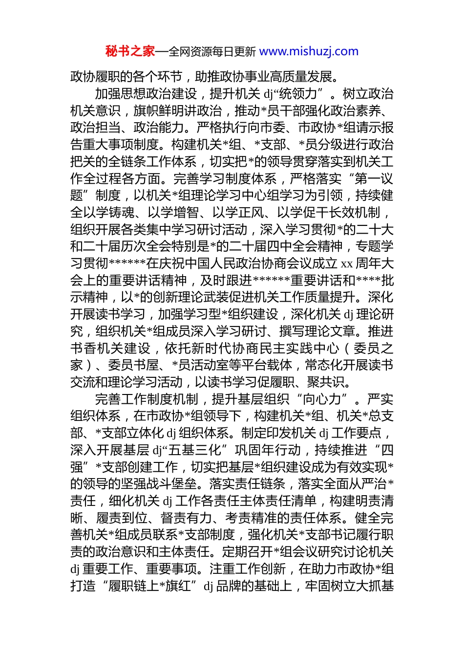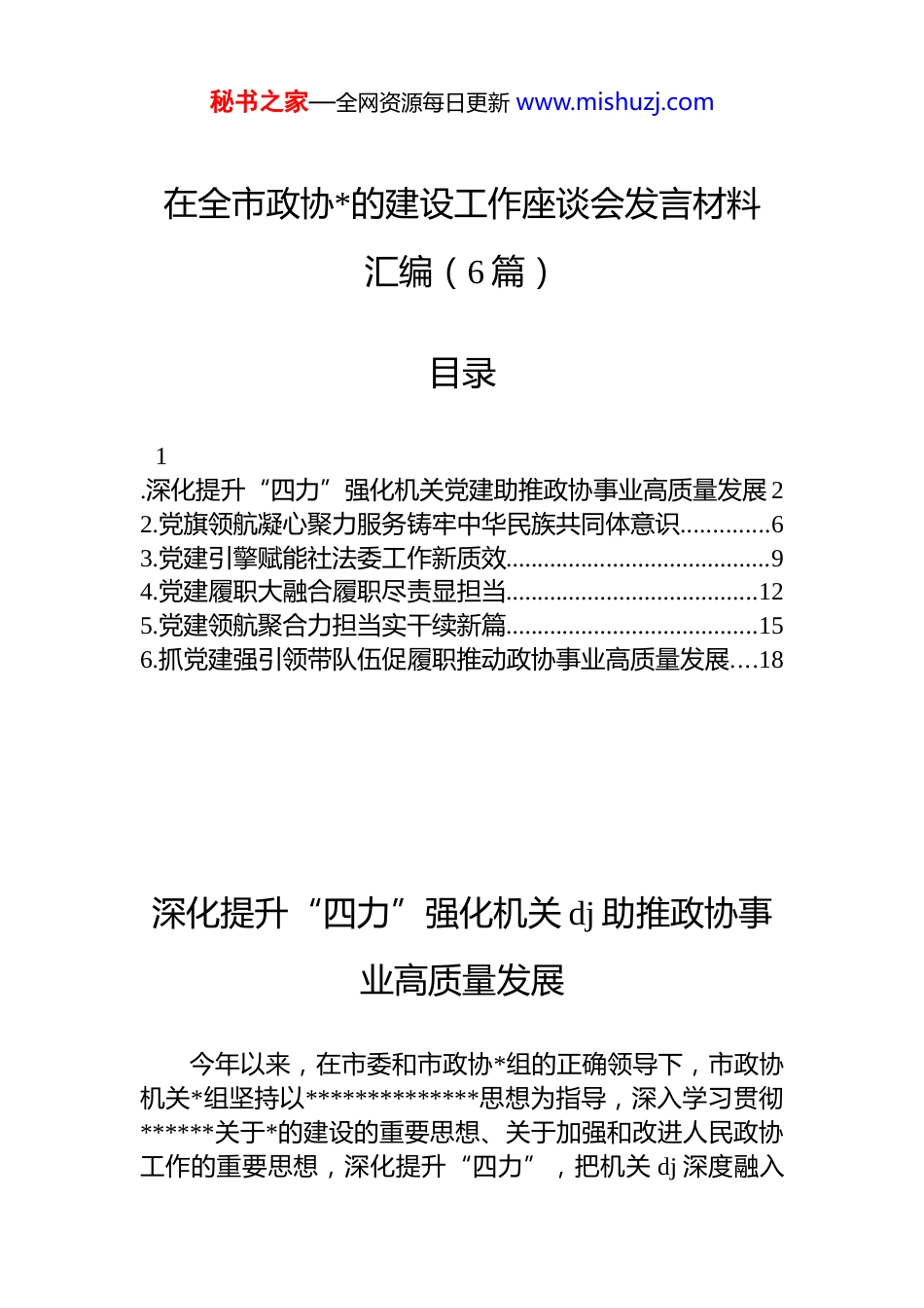 秘书之家—全网资源每日更新 www.mishuzj.com在全市政协*的建设工作座谈会发言材料汇编(6 篇)目录1.深化提升“四力”强化机关党建助推政协事业高质量发展 22.党旗领航凝心聚力服务铸牢中华民族共同体意识..............63.党建引擎赋能社法委工作新质效..........................................94.党建履职大融合履职尽责显担当........................................125.党建领航聚合力担当实干续新篇........................................156.抓党建强引领带队伍促履职推动政协事业高质量发展....18深化提升“四力”强化机关 dj 助推政协事业高质量发展今年以来,在市委和市政协*组的正确领导下,市政协机关*组坚持以**************思想为指导,深入学习贯彻******关于*的建设的重要思想、关于加强和改进人民政协工作的重要思想,深化提升“四力”,把机关 dj 深度融入秘书之家—全网资源每日更新 www.mishuzj.com政协履职的各个环节,助推政协事业高质量发展。加强思想政治建设,提升机关 dj“统领力”。树立政治机关意识,旗帜鲜明讲政治,推动*员干部强化政治素养、政治担当、政治能力。严格执行向市委、市政协*组请示报告重大事项制度。构建机关*组、*支部、*员分级进行政治把关的全链条工作体系,切实把*的领导贯穿落实到机关工作全过程各方面。完善学习制度体系,严格落实“第一议题”制度,以机关*组理论学习中心组学习为引领,持续健全以学铸魂、以学增智、以学正风、以学促干长效机制,组织开展各类集中学习研讨活动,深入学习贯彻*的二十大和二十届历次全会特别是*的二十届四中全会精神,专题学习贯彻******在庆祝中国人民政治协商会议成立 xx 周年大会上的重要讲话精神,及时跟进******重要讲话和****批示精神,以*的创新理论武装促进机关工作质量提升。深化开展读书学习,加强学习型*组织建设,深化机关 dj 理论研究,组织机关*组成员深入学习研讨、撰写理论文章。推进书香机关建设,依托新时代协商民主实践中心(委员之家)、委员书屋、*员活动室等平台载体,常态化开展读书交流和理论学习活动,以读书学习促履职、聚共识。完善工作制度机制,提升基层组织“向心力”。严实组织体系,在市政协*组领导下,构建机关*组、机关*总支部、*支部立体化 dj 组织体系。制定印发机关 dj 工作要点,深入开展基层 dj“五基三化”巩固年行动,持续推进“四强”*支部创建工作,切实把基层*组织建设成为有效实现*的领导的坚强战斗堡垒。落实责任链条,落实全面从严治*责任,细化机关 dj 工作各责任主体责任清单,构建明责清晰、履责到位、督责有力、考责精准的责任体系。健全完善机关*组成员联系*支部制度,强化机关*支部书记履行职责的政治意识和主体责任。定期召开*组会议研究讨论机关dj 重要工作、重要事项。注重工作创新,在助力市政协*组打造“履职链上*旗红”dj 品牌的基础上,牢固树立大抓基秘书之家—全网资源每日更新 www.mishuzj.com层鲜明导向,让机关 dj 焕发新活力。坚持 dj 带群建,发挥机关工会桥梁纽带作用,落实各项激励关怀机制,积极组织开展各类主题活动,形成积极进取、关爱和谐的浓厚氛围。围绕中心服务大局,提升 dj 业务“融合力”。推动 dj与政治协商融合互促,充分发挥承上启下重要作用,服务市政协高质量完成政协全会、调研协商、民主监督等重要工作。助力“xx 好商量”全媒体协商品牌走向全国,得到全国政协肯定。服务自治区政协在我市召开 x 次现场经验交流会,服务我市政协在全区政协有关会议作重点发言 5 次。推动 dj 与中心大局融合互促,当好参谋助手,协助市政协领导开展经济高质量发展督战、联系服务企业项目、“三个攻坚突破行动”、玉商玉工回归、文化塑城、乡村振兴食品安全包保督导、防汛减灾等工作,聚力服务*政中心大局。助力深化开展五项“委员行动”,坚持以*员委员带动*外委员,充分发挥委员主体作用,有力促进民族融合、持续扩大开放、助推产业发展、服务乡村振兴、提升科教质量。推动 dj 与平台建设融合互促,坚持把凝聚共识作为机关 dj 的重要内容,协助抓好委员履职平台载...