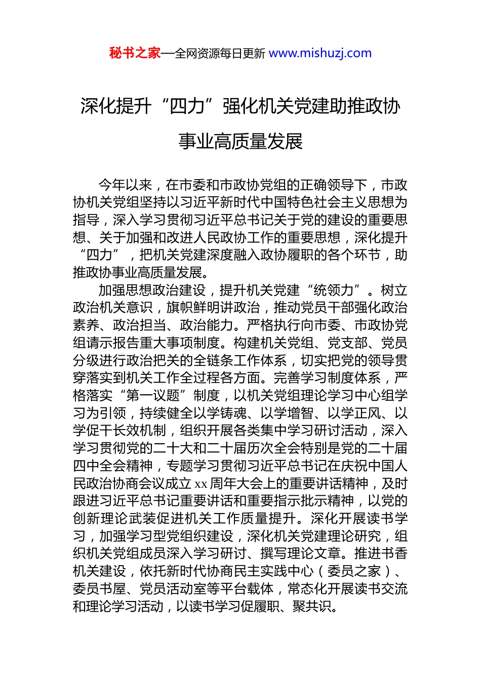 秘书之家—全网资源每日更新 www.mishuzj.com在全市政协党的建设工作座谈会发言材料汇编(6 篇)目录1.深化提升“四力”强化机关党建助推政协事业高质量发展 22.党旗领航凝心聚力服务铸牢中华民族共同体意识..............63.党建引擎赋能社法委工作新质效..........................................94.党建履职大融合履职尽责显担当........................................125.党建领航聚合力担当实干续新篇........................................156.抓党建强引领带队伍促履职推动政协事业高质量发展....18秘书之家—全网资源每日更新 www.mishuzj.com深化提升“四力”强化机关党建助推政协事业高质量发展今年以来,在市委和市政协党组的正确领导下,市政协机关党组坚持以习近平新时代中国特色社会主义思想为指导,深入学习贯彻习近平总书记关于党的建设的重要思想、关于加强和改进人民政协工作的重要思想,深化提升“四力”,把机关党建深度融入政协履职的各个环节,助推政协事业高质量发展。加强思想政治建设,提升机关党建“统领力”。树立政治机关意识,旗帜鲜明讲政治,推动党员干部强化政治素养、政治担当、政治能力。严格执行向市委、市政协党组请示报告重大事项制度。构建机关党组、党支部、党员分级进行政治把关的全链条工作体系,切实把党的领导贯穿落实到机关工作全过程各方面。完善学习制度体系,严格落实“第一议题”制度,以机关党组理论学习中心组学习为引领,持续健全以学铸魂、以学增智、以学正风、以学促干长效机制,组织开展各类集中学习研讨活动,深入学习贯彻党的二十大和二十届历次全会特别是党的二十届四中全会精神,专题学习贯彻习近平总书记在庆祝中国人民政治协商会议成立 xx 周年大会上的重要讲话精神,及时跟进习近平总书记重要讲话和重要指示批示精神,以党的创新理论武装促进机关工作质量提升。深化开展读书学习,加强学习型党组织建设,深化机关党建理论研究,组织机关党组成员深入学习研讨、撰写理论文章。推进书香机关建设,依托新时代协商民主实践中心(委员之家)、委员书屋、党员活动室等平台载体,常态化开展读书交流和理论学习活动,以读书学习促履职、聚共识。秘书之家—全网资源每日更新 www.mishuzj.com完善工作制度机制,提升基层组织“向心力”。严实组织体系,在市政协党组领导下,构建机关党组、机关党总支部、党支部立体化党建组织体系。制定印发机关党建工作要点,深入开展基层党建“五基三化”巩固年行动,持续推进“四强”党支部创建工作,切实把基层党组织建设成为有效实现党的领导的坚强战斗堡垒。落实责任链条,落实全面从严治党责任,细化机关党建工作各责任主体责任清单,构建明责清晰、履责到位、督责有力、考责精准的责任体系。健全完善机关党组成员联系党支部制度,强化机关党支部书记履行职责的政治意识和主体责任。定期召开党组会议研究讨论机关党建重要工作、重要事项。注重工作创新,在助力市政协党组打造“履职链上党旗红”党建品牌的基础上,牢固树立大抓基层鲜明导向,让机关党建焕发新活力。坚持党建带群建,发挥机关工会桥梁纽带作用,落实各项激励关怀机制,积极组织开展各类主题活动,形成积极进取、关爱和谐的浓厚氛围。围绕中心服务大局,提升党建业务“融合力”。推动党建与政治协商融合互促,充分发挥承上启下重要作用,服务市政协高质量完成政协全会、调研协商、民主监督等重要工作。助力“xx 好商量”全媒体协商品牌走向全国,得到全国政协肯定。服务自治区政协在我市召开 x 次现场经验交流会,服务我市政协在全区政协有关会议作重点发言 5次。推动党建与中心大局融合互促,当好参谋助手,协助市政协领导开展经济高质量发展督战、联系服务企业项目、“三个攻坚突破行动”、玉商玉工回归、文化塑城、乡村振兴、食品安全包保督导、防汛减灾等工作,聚力服务党政中心大局。助力深化开展五项“委员行动”,坚持以党员委员带动党外委员,充分发挥委员主体作用,有力促进民族融合、持续扩大开放、助推产业发展、服务乡村振兴、提升科教质量。推动党建与平台建设融合互促,坚持把凝聚共识...