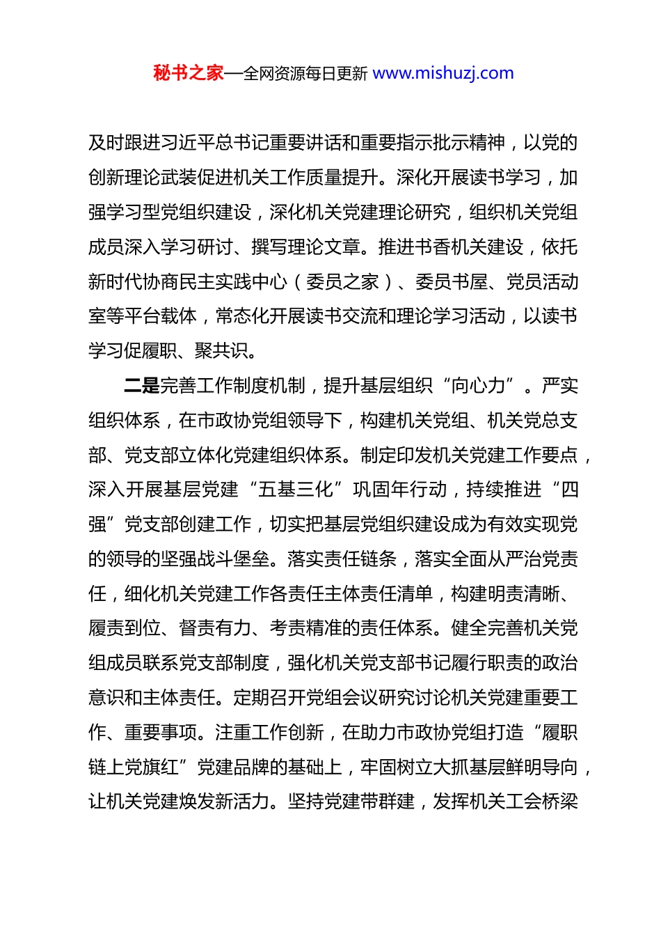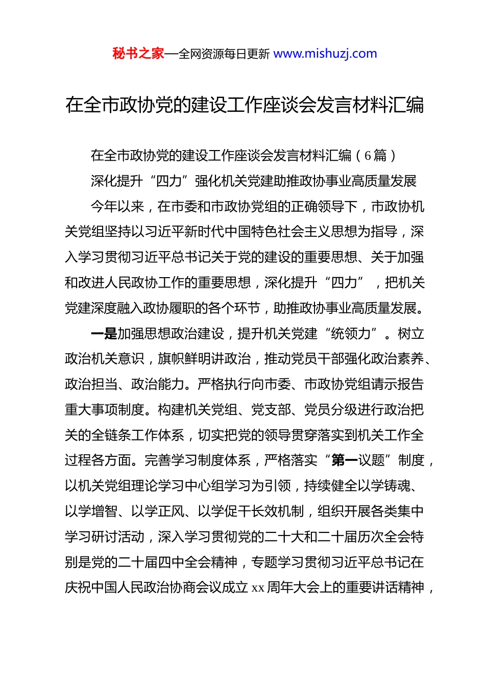 秘书之家—全网资源每日更新 www.mishuzj.com在全市政协党的建设工作座谈会发言材料汇编 在全市政协党的建设工作座谈会发言材料汇编(6 篇)深化提升“四力”强化机关党建助推政协事业高质量发展今年以来,在市委和市政协党组的正确领导下,市政协机关党组坚持以习近平新时代中国特色社会主义思想为指导,深入学习贯彻习近平总书记关于党的建设的重要思想、关于加强和改进人民政协工作的重要思想,深化提升“四力”,把机关党建深度融入政协履职的各个环节,助推政协事业高质量发展。一是加强思想政治建设,提升机关党建“统领力”。树立政治机关意识,旗帜鲜明讲政治,推动党员干部强化政治素养、政治担当、政治能力。严格执行向市委、市政协党组请示报告重大事项制度。构建机关党组、党支部、党员分级进行政治把关的全链条工作体系,切实把党的领导贯穿落实到机关工作全过程各方面。完善学习制度体系,严格落实“第一议题”制度,以机关党组理论学习中心组学习为引领,持续健全以学铸魂、以学增智、以学正风、以学促干长效机制,组织开展各类集中学习研讨活动,深入学习贯彻党的二十大和二十届历次全会特别是党的二十届四中全会精神,专题学习贯彻习近平总书记在庆祝中国人民政治协商会议成立 xx 周年大会上的重要讲话精神,秘书之家—全网资源每日更新 www.mishuzj.com及时跟进习近平总书记重要讲话和重要指示批示精神,以党的创新理论武装促进机关工作质量提升。深化开展读书学习,加强学习型党组织建设,深化机关党建理论研究,组织机关党组成员深入学习研讨、撰写理论文章。推进书香机关建设,依托新时代协商民主实践中心(委员之家)、委员书屋、党员活动室等平台载体,常态化开展读书交流和理论学习活动,以读书学习促履职、聚共识。二是完善工作制度机制,提升基层组织“向心力”。严实组织体系,在市政协党组领导下,构建机关党组、机关党总支部、党支部立体化党建组织体系。制定印发机关党建工作要点,深入开展基层党建“五基三化”巩固年行动,持续推进“四强”党支部创建工作,切实把基层党组织建设成为有效实现党的领导的坚强战斗堡垒。落实责任链条,落实全面从严治党责任,细化机关党建工作各责任主体责任清单,构建明责清晰、履责到位、督责有力、考责精准的责任体系。健全完善机关党组成员联系党支部制度,强化机关党支部书记履行职责的政治意识和主体责任。定期召开党组会议研究讨论机关党建重要工作、重要事项。注重工作创新,在助力市政协党组打造“履职链上党旗红”党建品牌的基础上,牢固树立大抓基层鲜明导向,让机关党建焕发新活力。坚持党建带群建,发挥机关工会桥梁秘书之家—全网资源每日更新 www.mishuzj.com纽带作用,落实各项激励关怀机制,积极组织开展各类主题活动,形成积极进取、关爱和谐的浓厚氛围。三是围绕中心服务大局,提升党建业务“融合力”。推动党建与政治协商融合互促,充分发挥承上启下重要作用,服务市政协高质量完成政协全会、调研协商、民主监督等重要工作。助力“xx 好商量”全媒体协商品牌走向全国,得到全国政协肯定。服务自治区政协在我市召开 x 次现场经验交流会,服务我市政协在全区政协有关会议作重点发言 5 次。推动党建与中心大局融合互促,当好参谋助手,协助市政协领导开展经济高质量发展督战、联系服务企业项目、“三个攻坚突破行动”、玉商玉工回归、文化塑城、乡村振兴、食品安全包保督导、防汛减灾等工作,聚力服务党政中心大局。助力深化开展五项“委员行动”,坚持以党员委员带动党外委员,充分发挥委员主体作用,有力促进民族融合、持续扩大开放、助推产业发展、服务乡村振兴、提升科教质量。推动党建与平台建设融合互促,坚持把凝聚共识作为机关党建的重要内容,协助抓好委员履职平台载体建设,进一步延伸拓展新时代协商民主实践中心、委员工作室、委员书屋功能,协同设立委员之家,有力推动委员履职常态化、规范化、长效化。推进“一网一刊一号”等平台阵地建设,依托新华网、人民政协网等各级媒体平台刊发新闻秘书之家—全网资源每日更新 www.mishuzj.com信息,有力传播了 xx 政协声音。四...