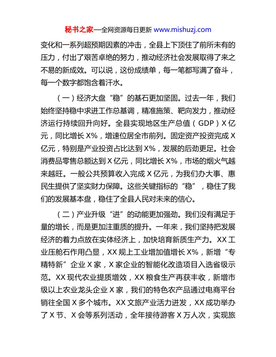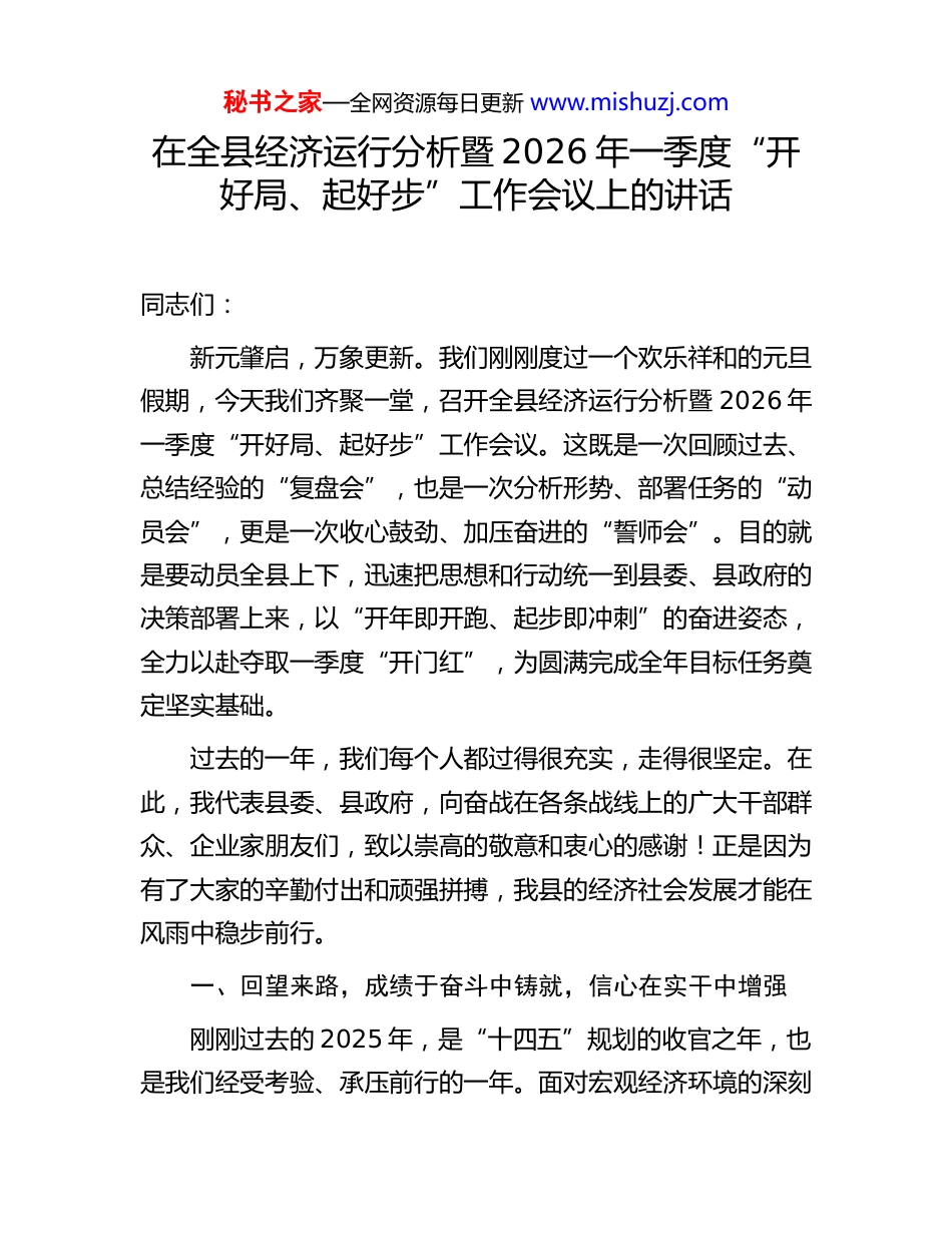 秘书之家—全网资源每日更新 www.mishuzj.com在全县经济运行分析暨 2026 年一季度“开好局、起好步”工作会议上的讲话同志们:新元肇启,万象更新。我们刚刚度过一个欢乐祥和的元旦假期,今天我们齐聚一堂,召开全县经济运行分析暨 2026 年一季度“开好局、起好步”工作会议。这既是一次回顾过去、总结经验的“复盘会”,也是一次分析形势、部署任务的“动员会”,更是一次收心鼓劲、加压奋进的“誓师会”。目的就是要动员全县上下,迅速把思想和行动统一到县委、县政府的决策部署上来,以“开年即开跑、起步即冲刺”的奋进姿态,全力以赴夺取一季度“开门红”,为圆满完成全年目标任务奠定坚实基础。过去的一年,我们每个人都过得很充实,走得很坚定。在此,我代表县委、县政府,向奋战在各条战线上的广大干部群众、企业家朋友们,致以崇高的敬意和衷心的感谢!正是因为有了大家的辛勤付出和顽强拼搏,我县的经济社会发展才能在风雨中稳步前行。一、回望来路,成绩于奋斗中铸就,信心在实干中增强刚刚过去的 2025 年,是“十四五”规划的收官之年,也是我们经受考验、承压前行的一年。面对宏观经济环境的深刻秘书之家—全网资源每日更新 www.mishuzj.com变化和一系列超预期因素的冲击,全县上下顶住了前所未有的压力,付出了艰苦卓绝的努力,推动经济社会发展取得了来之不易的新成效。可以说,这份成绩单,每一笔都写满了奋斗,每一个数字都饱含着汗水。(一)经济大盘“稳”的基石更加坚固。过去一年,我们始终坚持稳中求进工作总基调,精准施策、靶向发力,推动经济运行持续回升向好。全县实现地区生产总值(GDP)X 亿元,同比增长 X%,增速位居全市前列。固定资产投资完成 X亿元,特别是产业投资占比达到 X%,发展的后劲更足。社会消费品零售总额达到 X 亿元,同比增长 X%,市场的烟火气越来越旺。一般公共预算收入完成 X 亿元,为我们办大事、惠民生提供了坚实财力保障。这些关键指标的“稳”,稳住了我们的发展基本盘,稳住了全县人民对未来的信心。(二)产业升级“进”的动能更加强劲。我们没有满足于量的增长,而是更加注重质的提升。一年来,我们坚持把发展经济的着力点放在实体经济上,加快培育新质生产力。XX 工业压舱石作用凸显,XX 规上工业增加值增长 X%,新增“专精特新”企业 X 家,X 家企业的智能化改造项目入选省级示范。XX 现代农业提质增效,XX 粮食生产再获丰收,新增市级以上农业龙头企业 X 家,我们的特色农产品通过电商平台销往全国 X 多个城市。XX 文旅产业活力迸发,XX 成功举办了 X 节、X 会等系列活动,全年接待游客 X 万人次,实现旅秘书之家—全网资源每日更新 www.mishuzj.com游综合收入 X 亿元。一位返乡创业的青年告诉我,现在家乡的发展平台越来越好,让他看到了大有可为的广阔天地。这正是我们产业升级带来的新希望。(三)民生福祉“暖”的底色更加鲜亮。发展的最终目的是让人民生活得更幸福。我们始终把民生工作摆在突出位置,财政支出的 X%以上用于民生领域。XX 城乡居民收入稳步增长,XX 分别达到 X 元和 X 元,增速均跑赢 GDP 增速。XX 就业形势保持稳定,XX 全年新增城镇就业 X 人,零就业家庭实现动态清零。XX 公共服务持续优化,XX 新建、改扩建中小学、幼儿园 X 所,县人民医院新院区主体工程封顶,我们为 X个社区的独居老人提供了“暖心午餐”服务。前段时间我到社区调研,一位 80 多岁的老奶奶拉着我的手说:“现在日子越过越好,干部们比亲人还亲。”这朴实的话语,是对我们工作最大的褒奖,也是我们砥砺前行的不竭动力。回顾过去的一年,我们深刻地认识到,成绩的取得,根本在于以习近平同志为核心的党中央坚强领导和习近平新时代中国特色社会主义思想的科学指引,是市委、市政府正确领导的结果,更是全县上下团结一心、苦干实干的结果。这些成绩,凝聚着在座各位的心血,饱含着全县人民的汗水。实践证明,只要我们方向明确、步调一致、众志成城,就没有克服不了的困难,就没有干不成的事业。秘书之家—全网资源每日更新 www.mishuzj.com二、正视差距,挑战在破题...